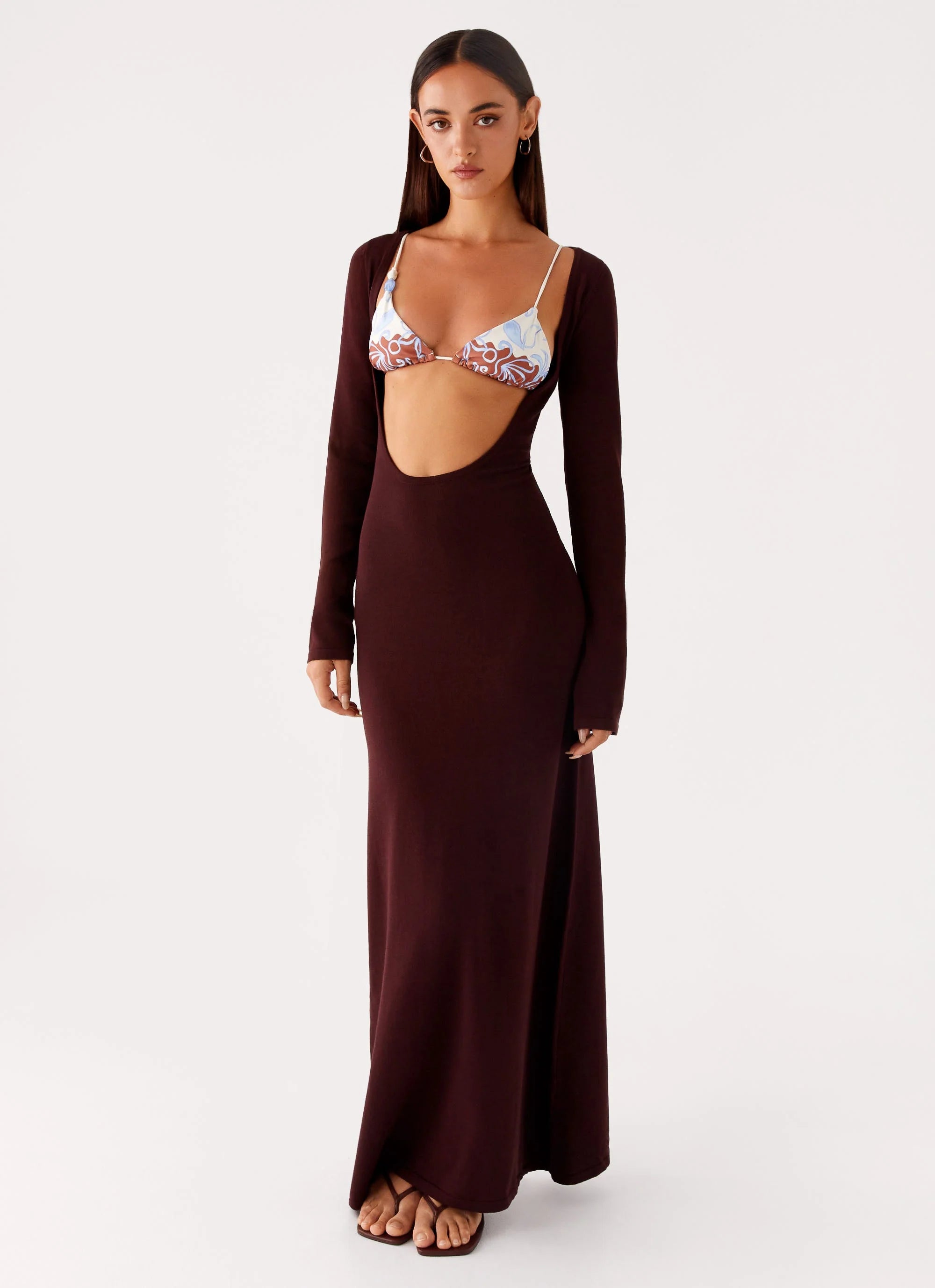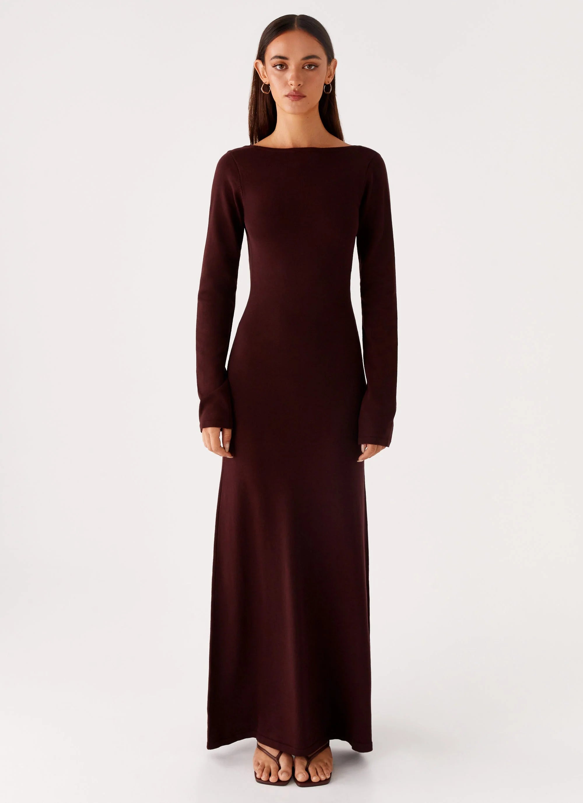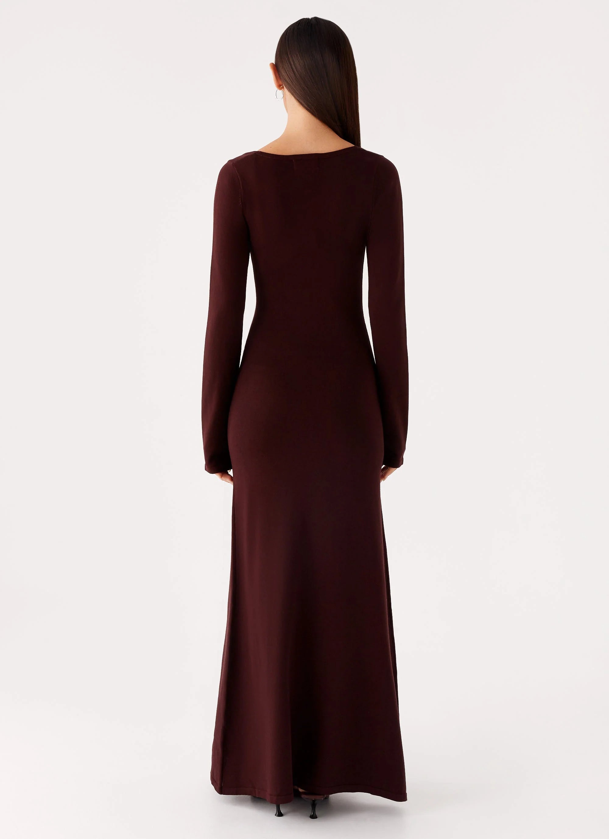 Adora Long Sleeve Knit Maxi Dress: This sleek, fitted maxi dress features a deep scoop neckline and full-length sleeves, offering a contemporary edge to your wardrobe. Its non-lined design adds to its minimalist allure, perfect for layering or wearing solo.