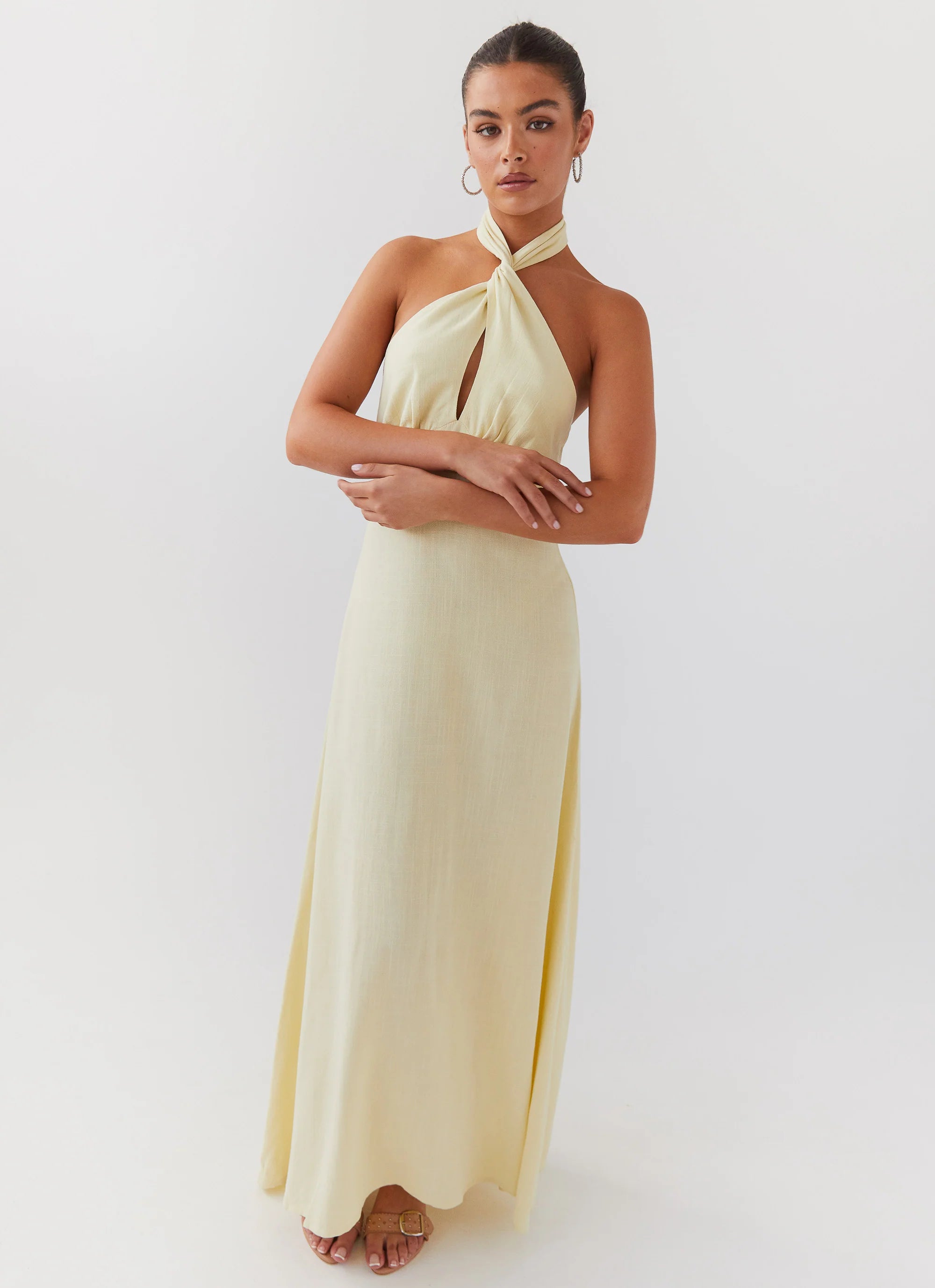 Hey there, cutie! We are in love with our pretty Adrienne Linen Maxi Dress. Featuring a gathered bust, halter neck, keyhole cut out and an open straight back. Perfect for Saturday long lunches with the girls!