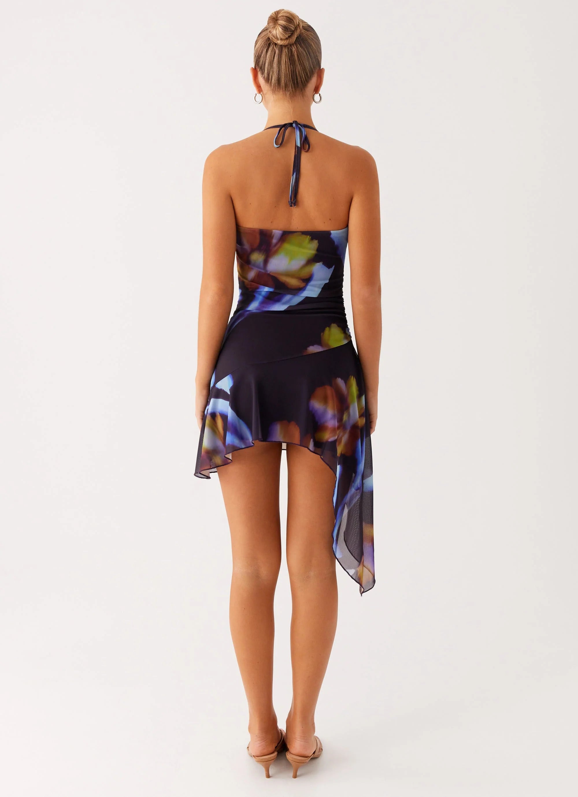 Step into the night with the Algarve Mini Dress in Dark Floral. This mini dress features a seductive front cowl neckline and delicate beaded straps that glisten under the lights. The thin neck tie strap and low back add a flirty edge, while side waist ruching sculpts your silhouette. Crafted from stretch mesh with a fully lined interior, its asymmetrical hemline and exclusive print make it a perfect choice for evenings that never go out of style.