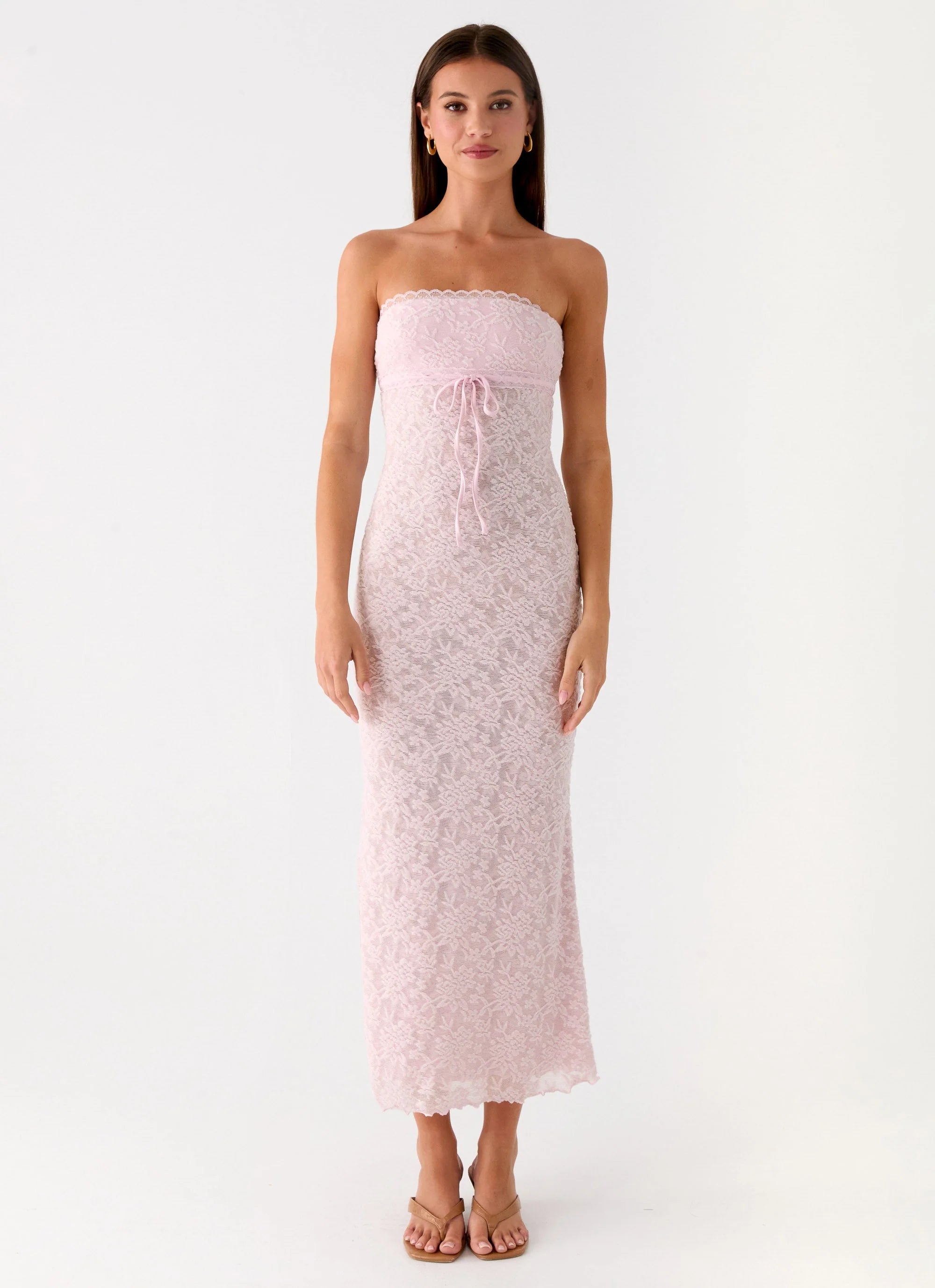 The Alida Strapless Jacquard Midi Dress is made for sunset-to-sundown nights with a bold, feminine edge. Featuring a strapless neckline and bodycon silhouette, this midi dress is finished with bow detailing and a lace overlay for movement and texture. Crafted in jacquard, it’s perfect for golden hour to after-dark styling.