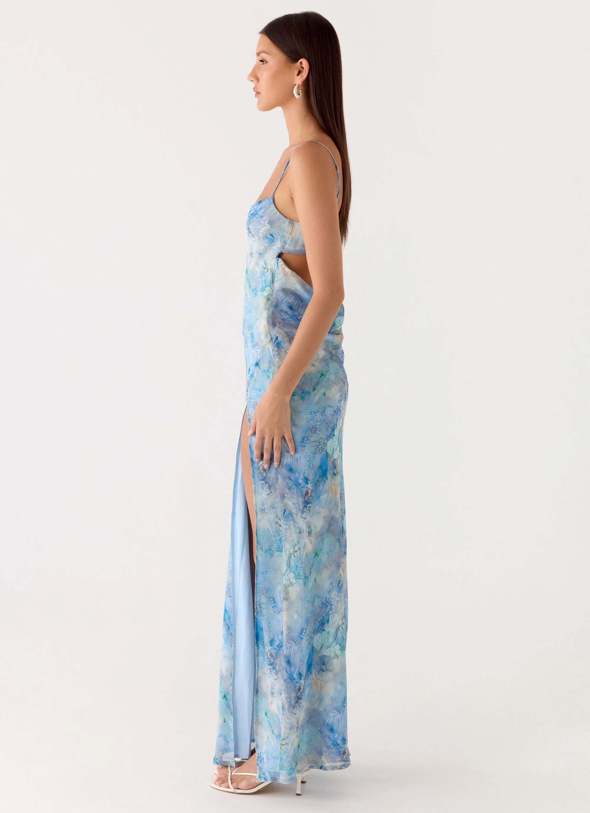 The Alouette Maxi Dress brings effortless drama with a rounded neckline, low cowl back, and front side split. Finished with thin adjustable straps and a metal clasp detail, it’s fully lined for a smooth fit.