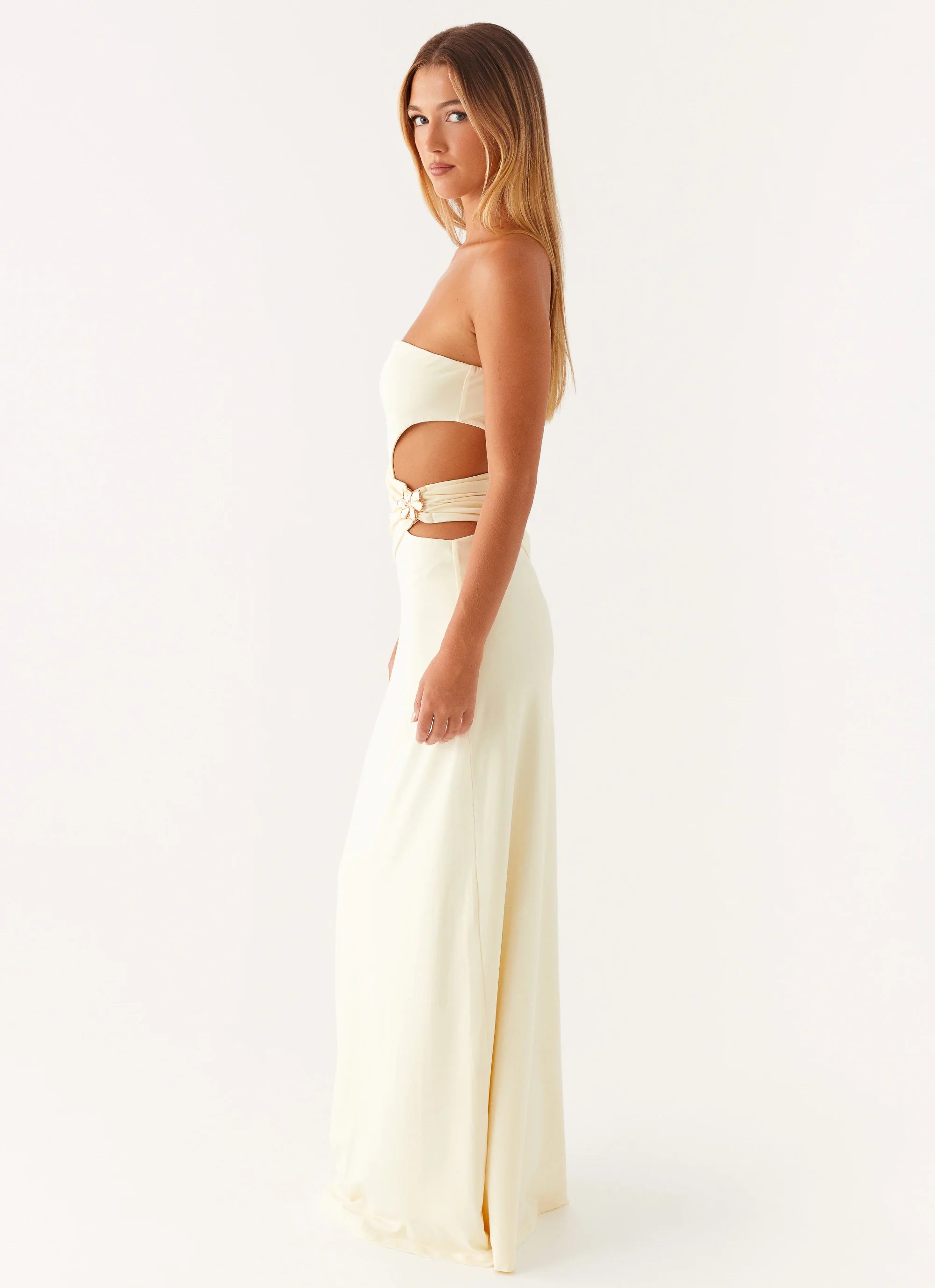 The Anetta Maxi Dress is a showstopper. Featuring a strapless neckline, stretch jersey fabric, and side metal embellishments, it’s perfect for golden skies and nights filled with sleek sophistication and bold style.