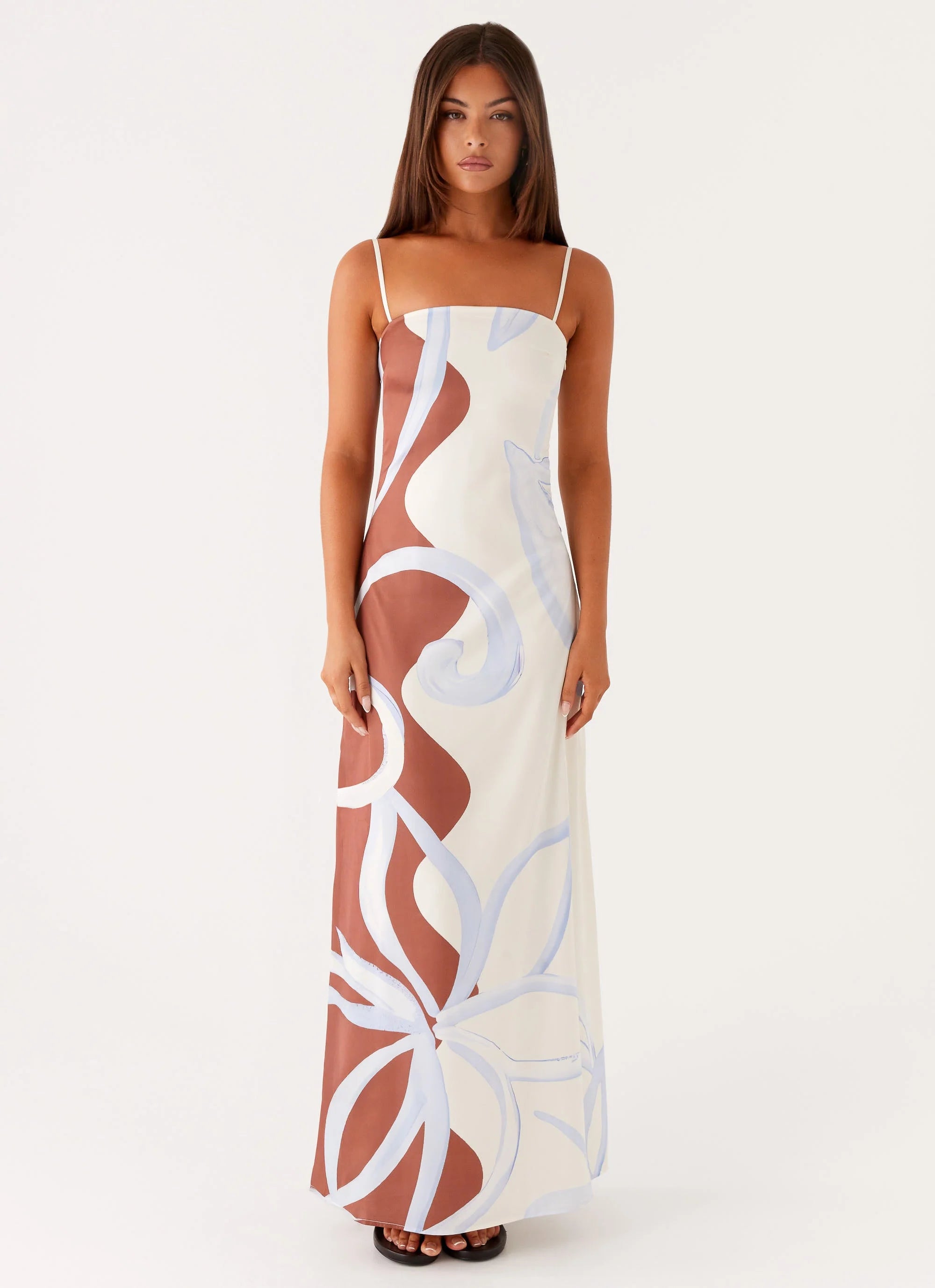 The Aster Bloom Maxi Dress is a luxurious piece crafted from satin, featuring adjustable straps and a side seam invisible zipper. The exclusive PepperMayo print adds a personal touch, making this dress perfect for both daytime events and glamorous evening affairs.