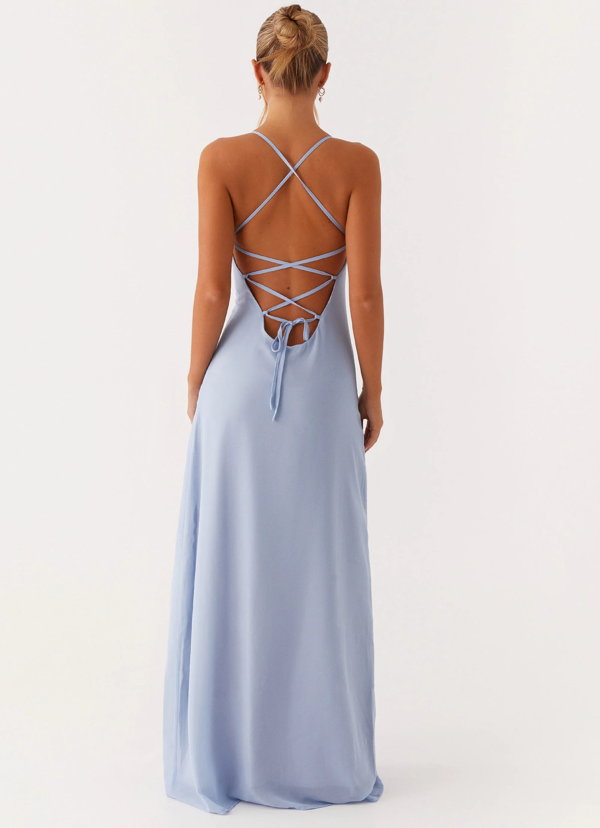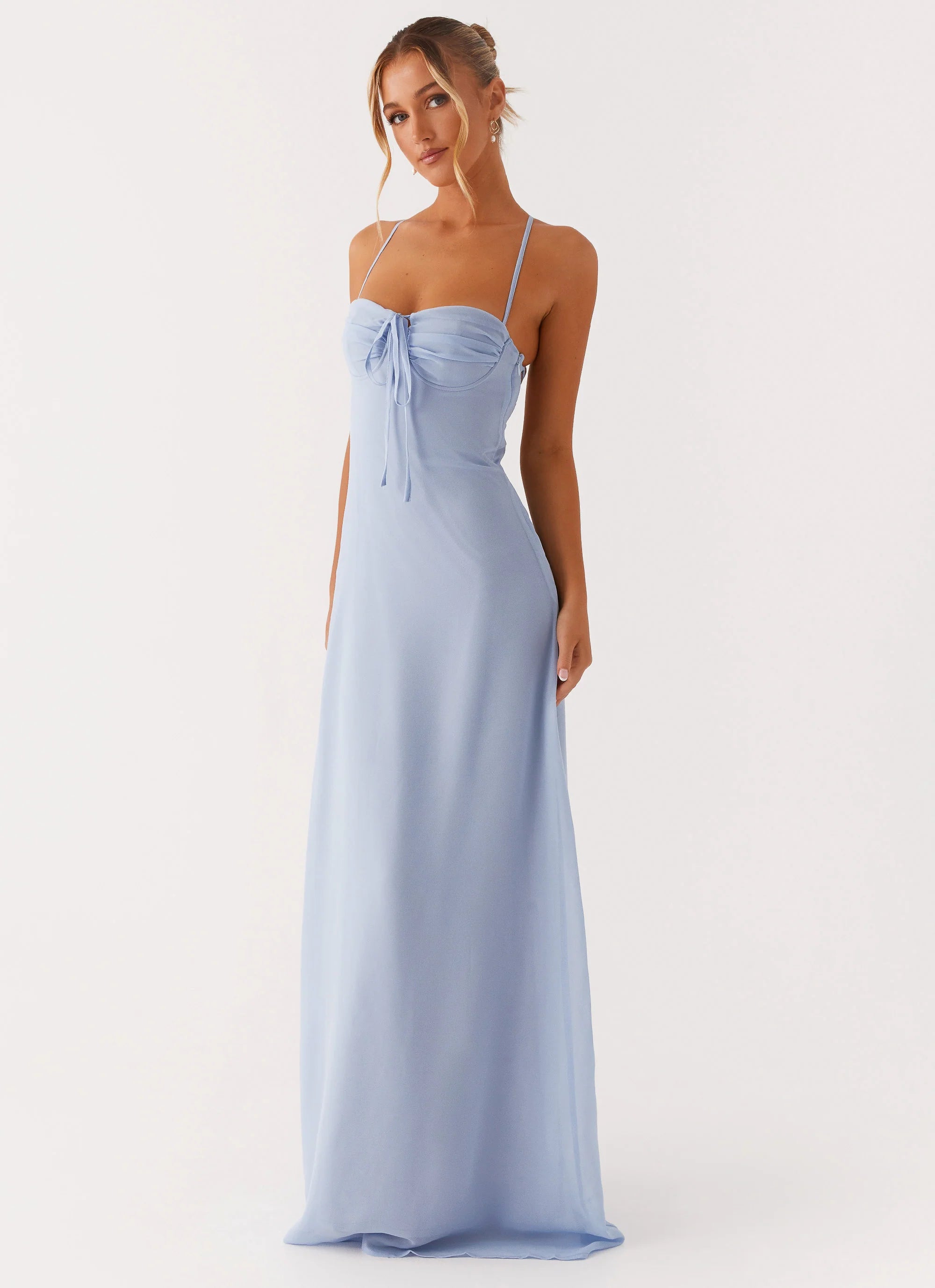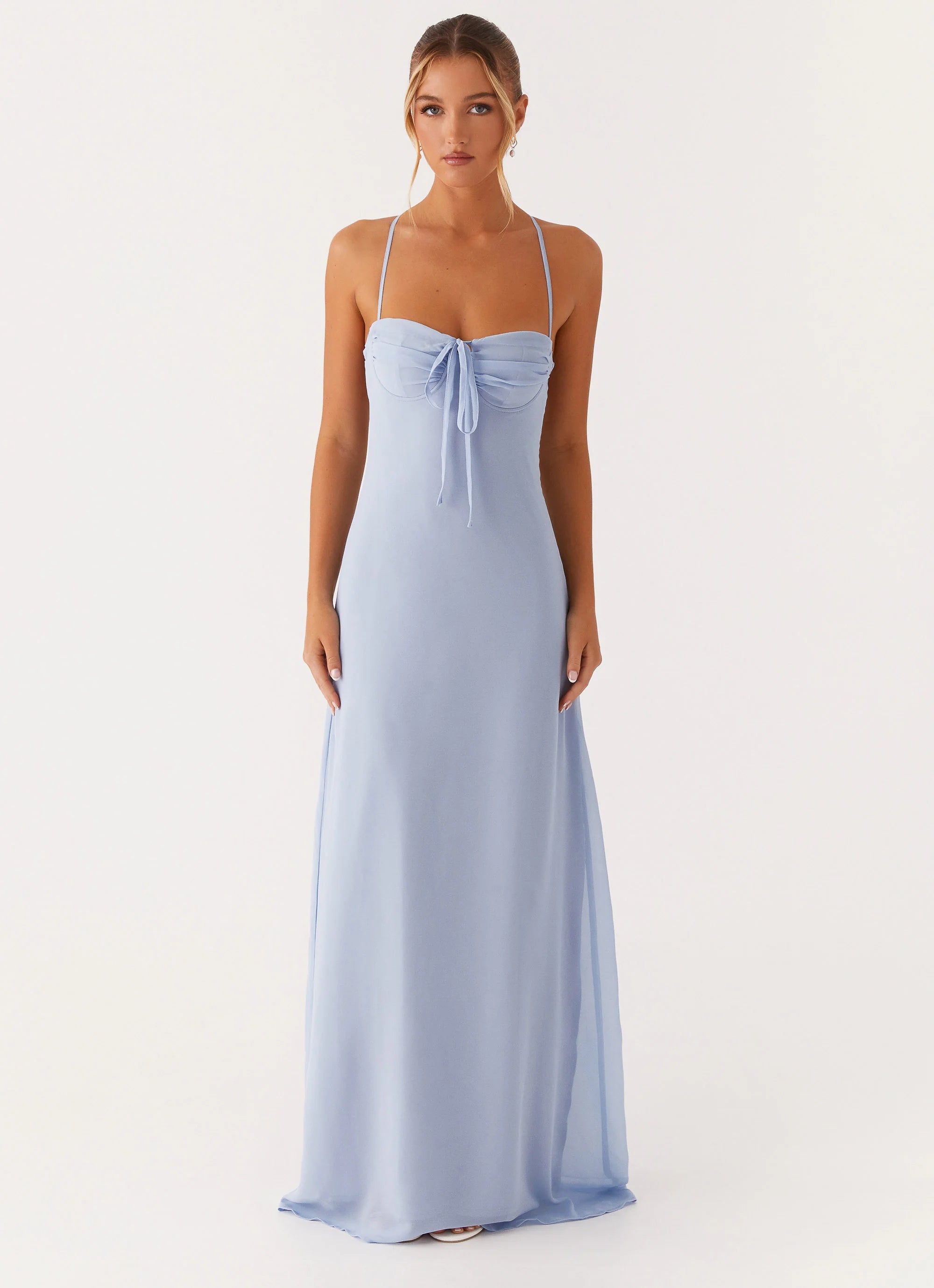 The Aveline Bustier Maxi Dress features a maxi length for an elongated, elegant look. With a sweetheart neckline, it offers a flattering and feminine touch, while the open back adds a bold, alluring element to the design.