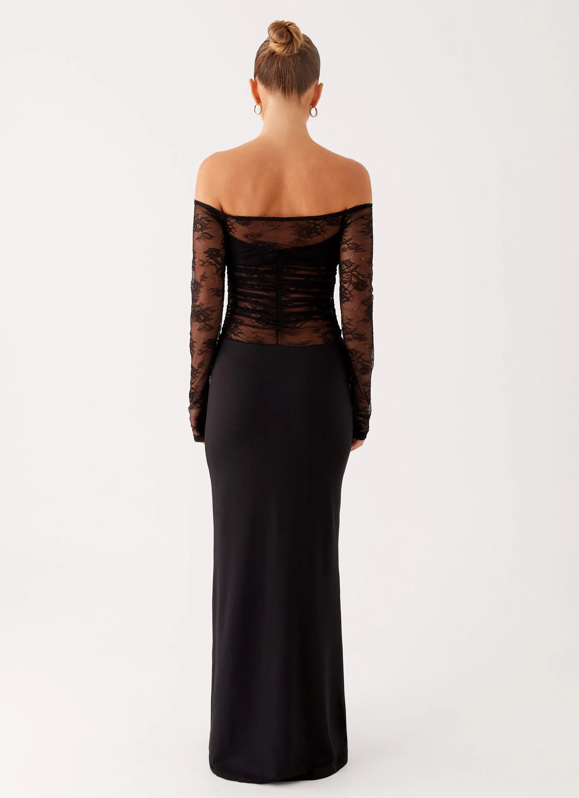 The Avi Maxi Dress is all about soft drama, featuring an off-shoulder neckline with silicone taping for a secure fit. With a ruched bustier, stretch lace sleeves and waist, and a semi-sheer finish, it’s fully lined through the bust and skirt for coverage that still lets you play with texture and silhouette.