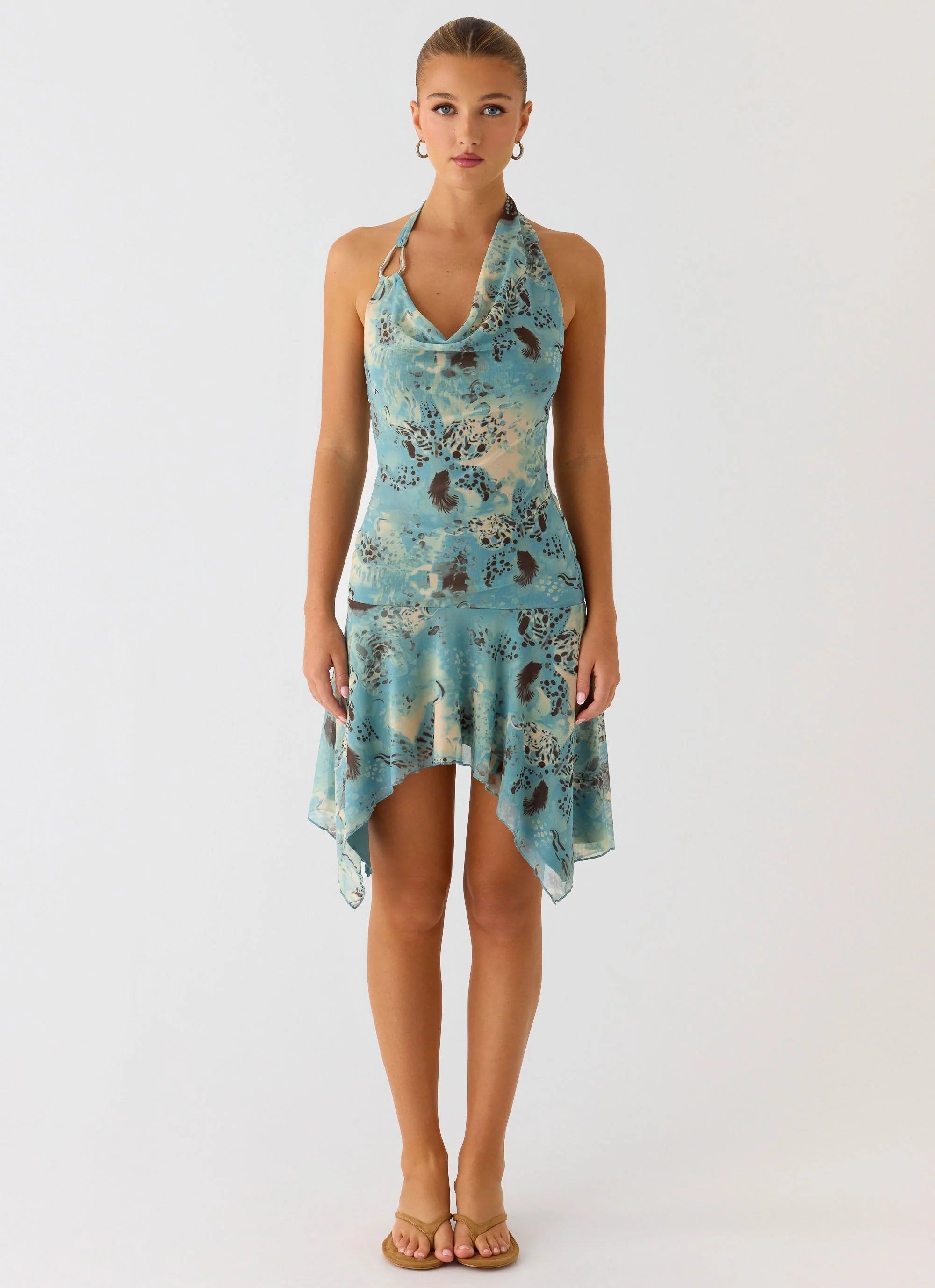 The Bad Alive Halter Hanky Mini Dress is a mini-length, halter-style dress with a low cowl neckline, front metal embellishment, and asymmetrical hemline. Crafted in a stretch fabric, it features an exclusive print with unique placement on each garment.