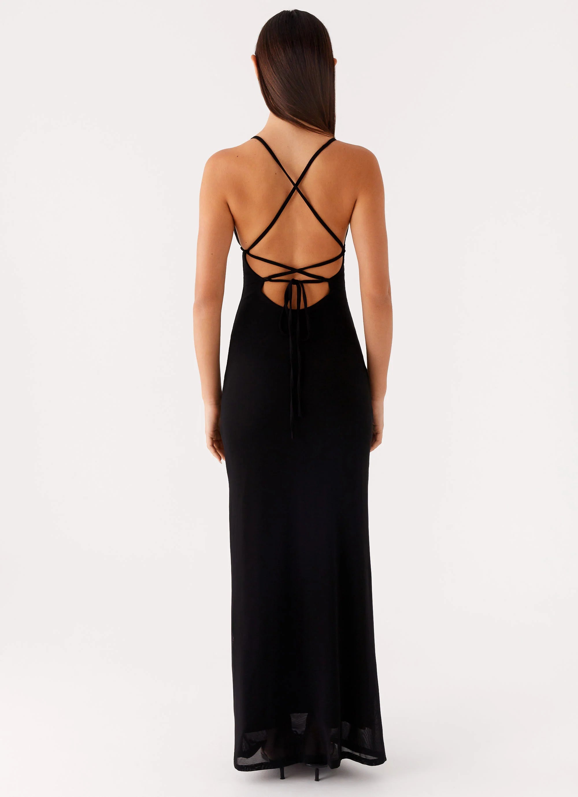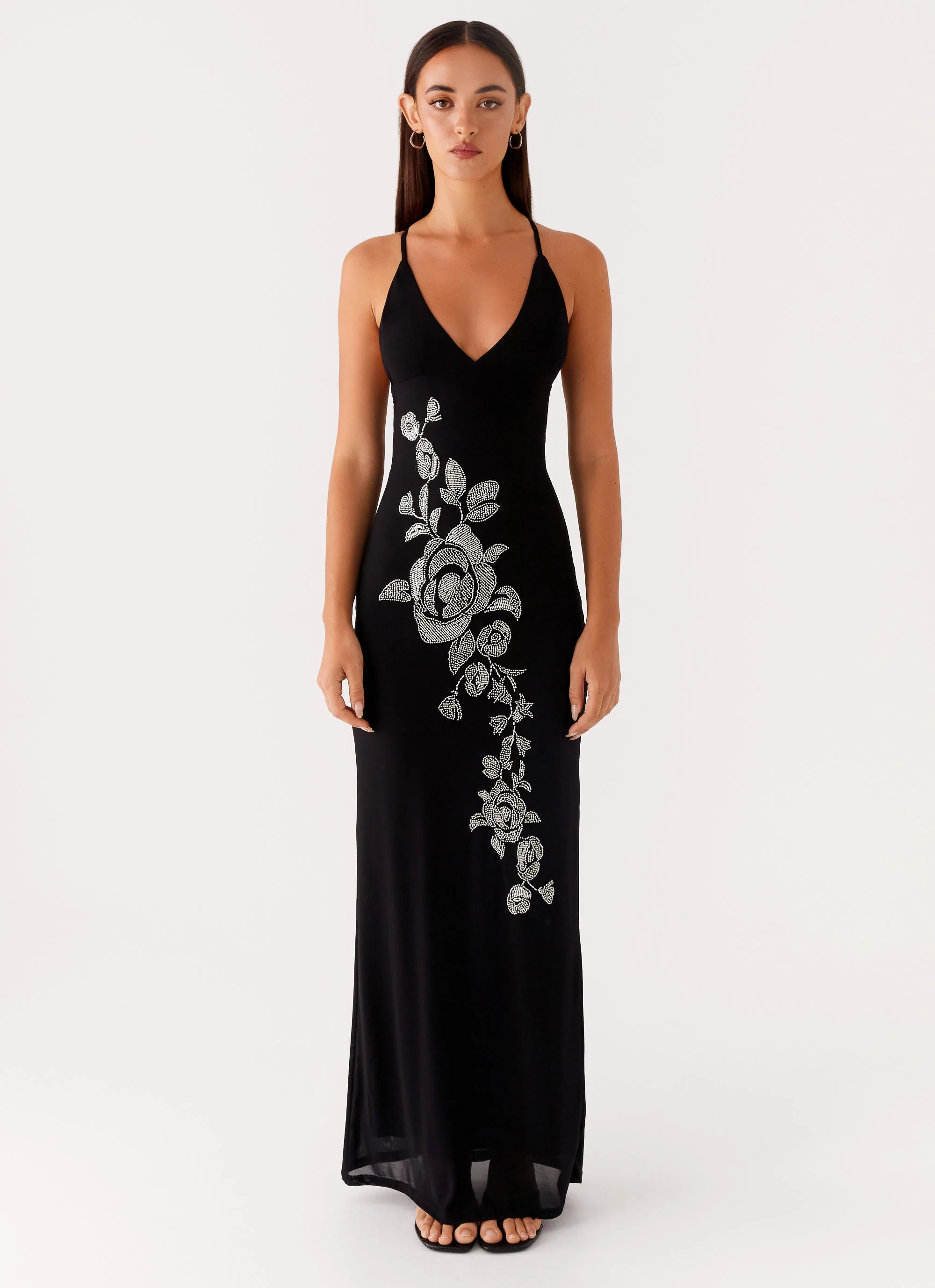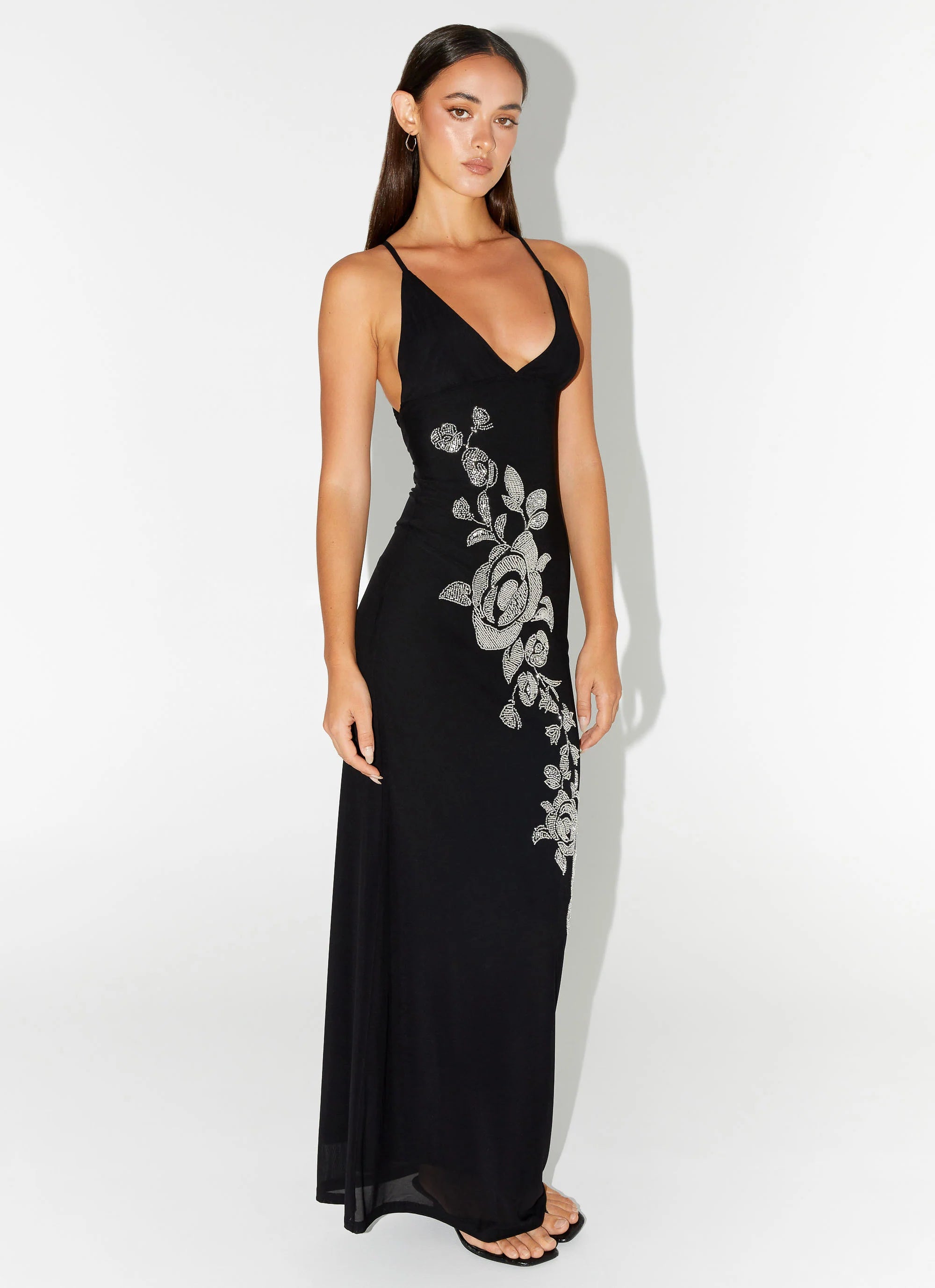 Dazzle under the stars. The Beki Beaded Mesh Maxi Dress features a V neckline, maxi length, and delicate thin straps that create the perfect balance of elegance and allure.