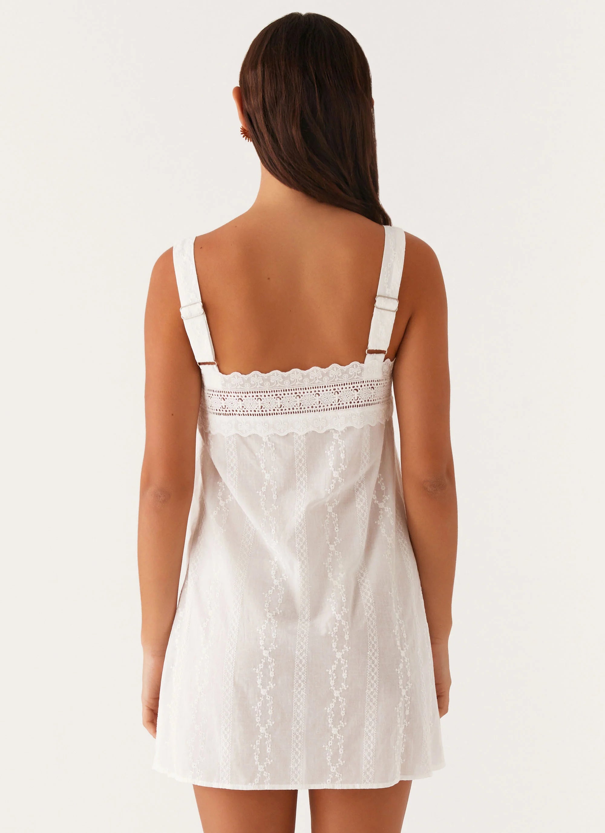 The Calla Broderie Mini Dress exudes effortless charm with its straight neckline and semi-sheer fabric that dances with light. Delicate lace trims adorn the neckline, adding a touch of romance and sophistication.