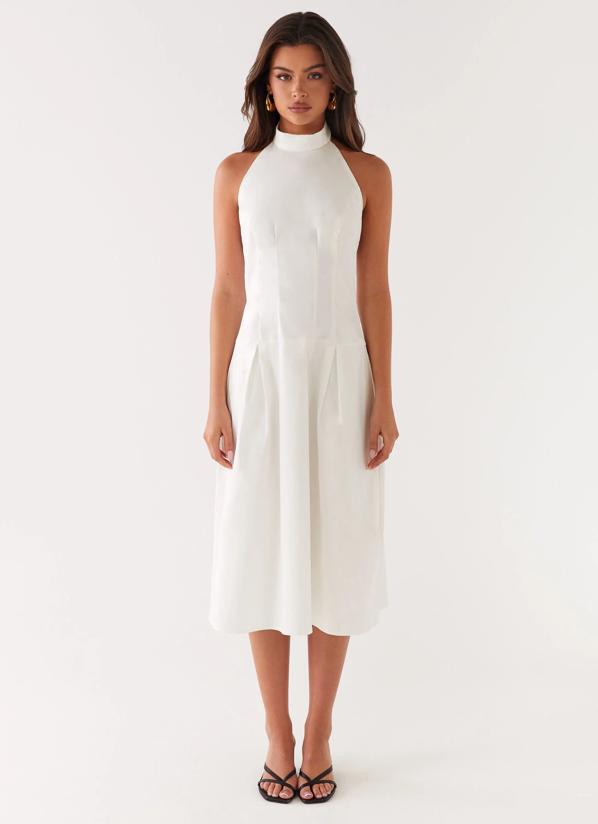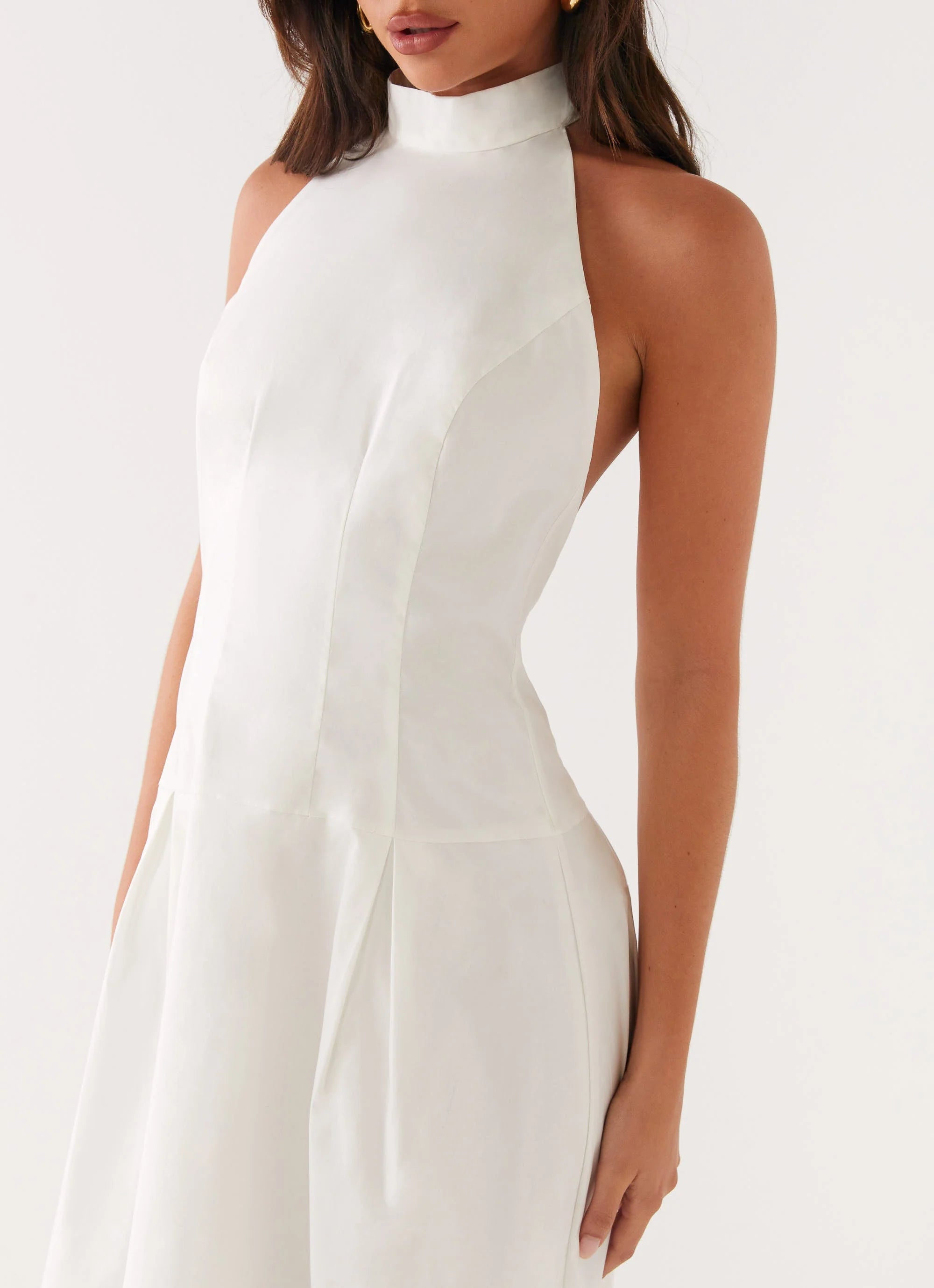 The Calla Halter Midi Dress is a stunning combination of bold and feminine. Featuring an open back and a drop waist, it offers a flattering silhouette that moves effortlessly.