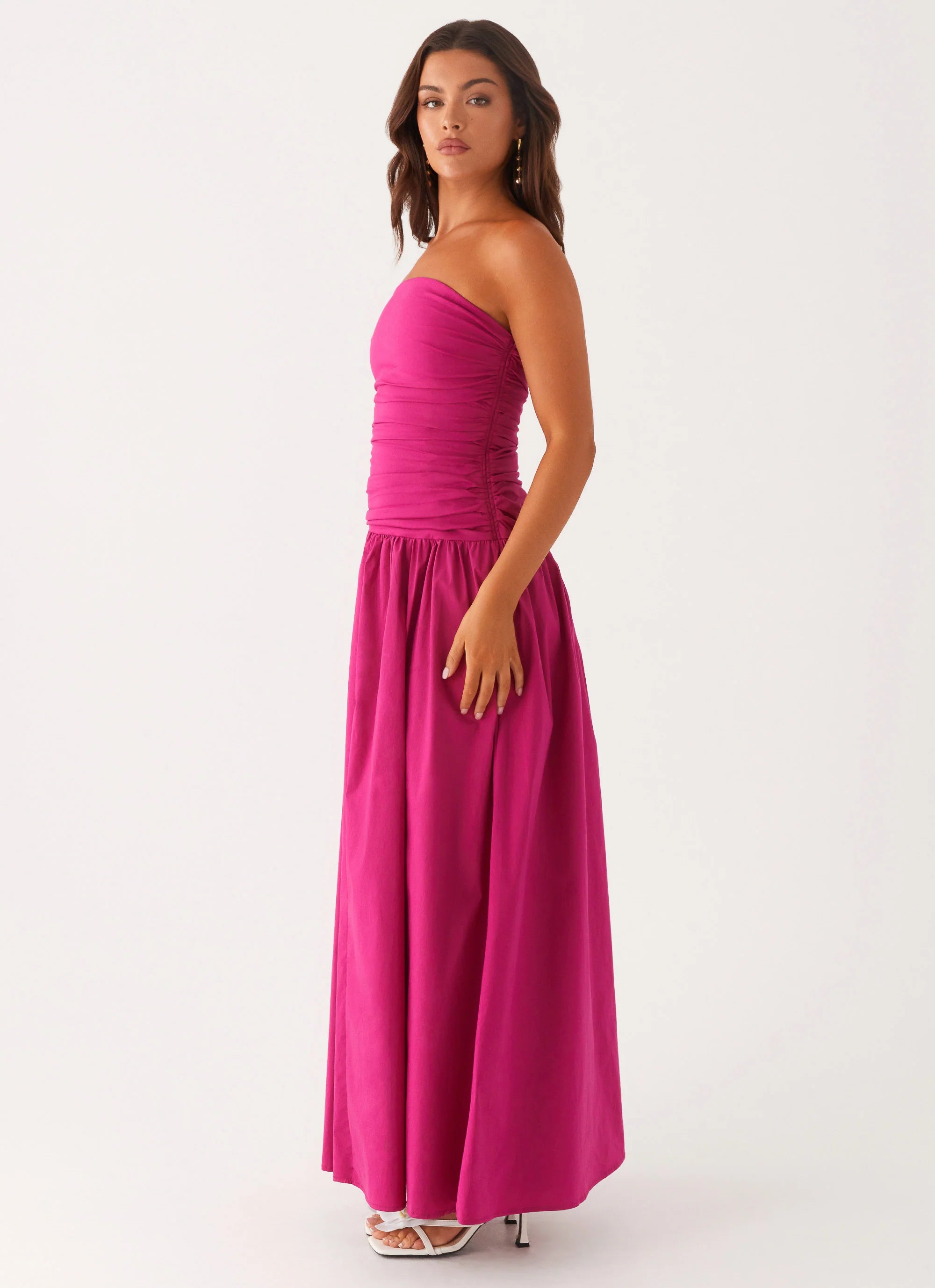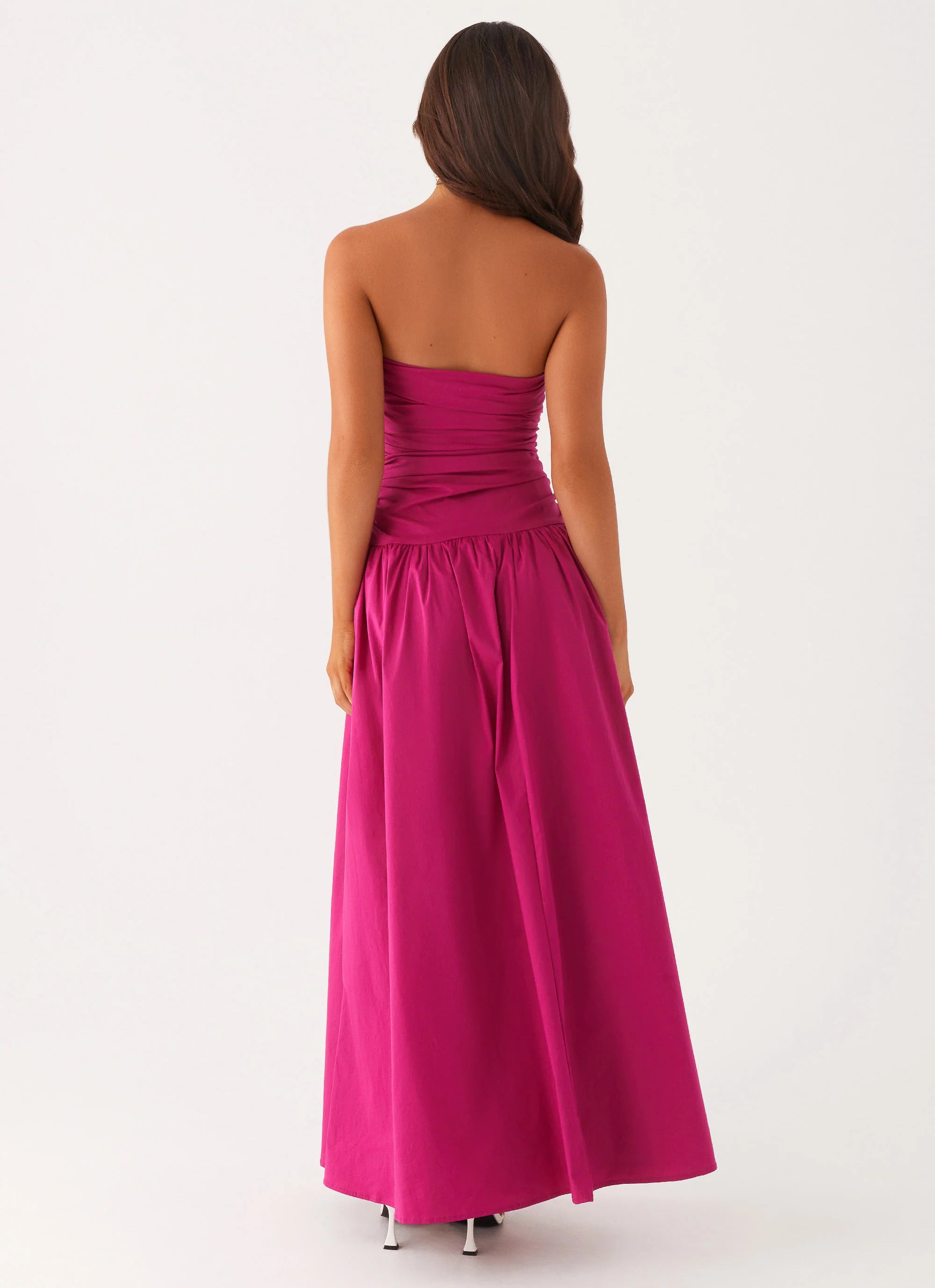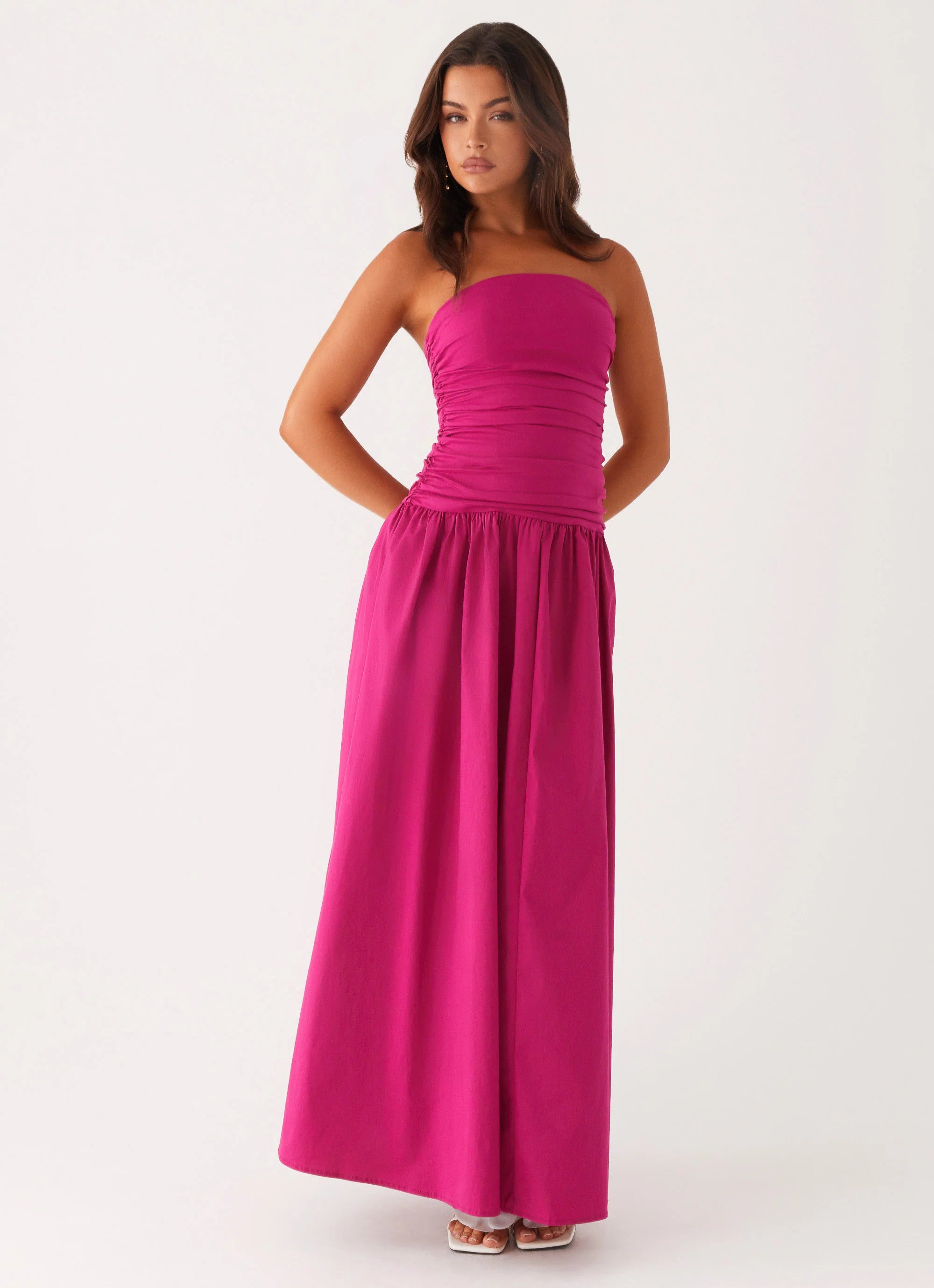 The Carmel Maxi Dress is chic and sultry. Featuring ruched sides, a drop waist, and a strapless neckline, it’s made for golden skies and nights where elegance and bold style blend effortlessly.