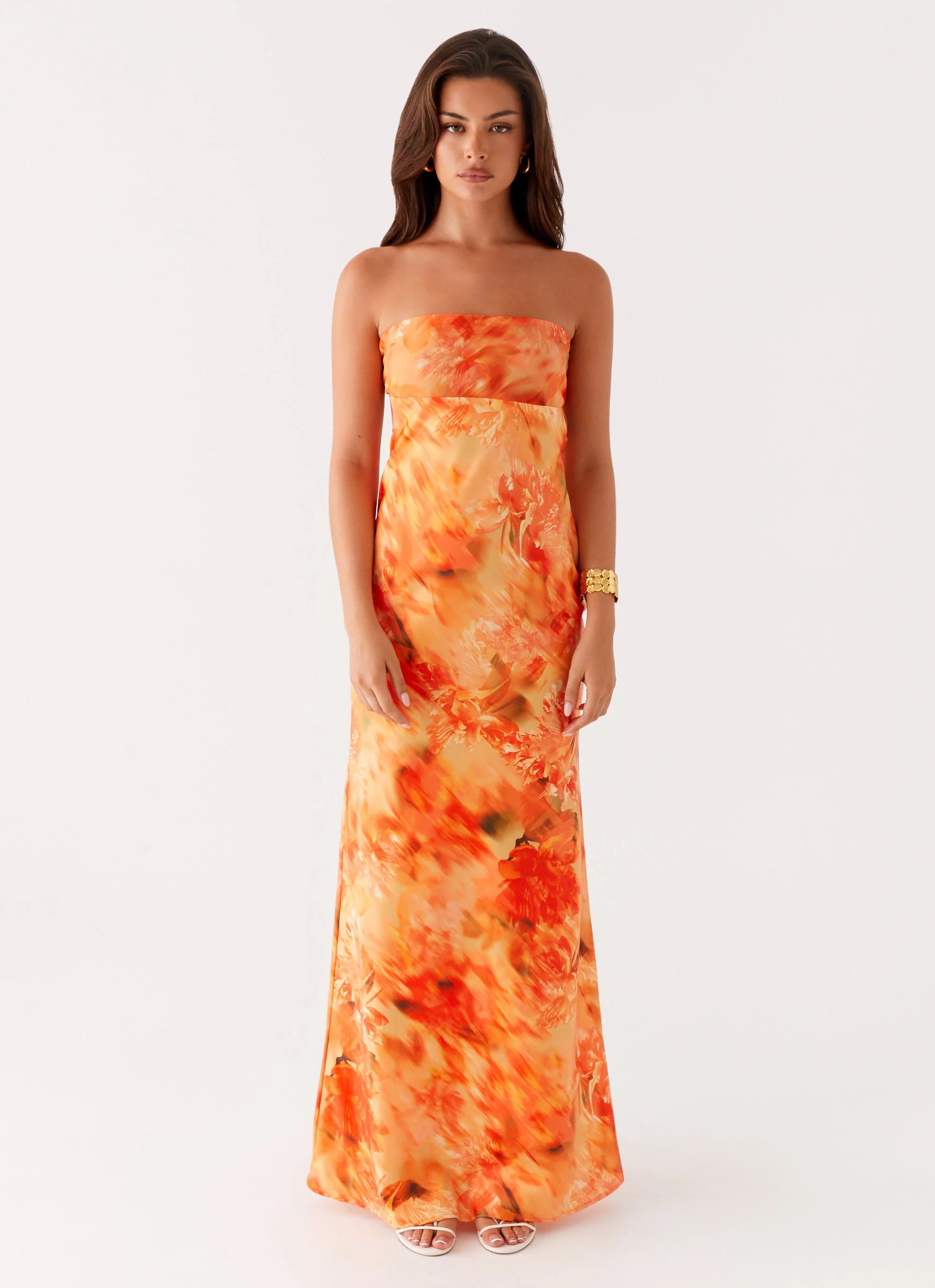 The Carmen Maxi Dress features a sleek straight neckline and a strapless design, offering a bold and timeless silhouette. Crafted from a smooth, flowing fabric, this dress exudes effortless elegance and is perfect for any formal occasion.
