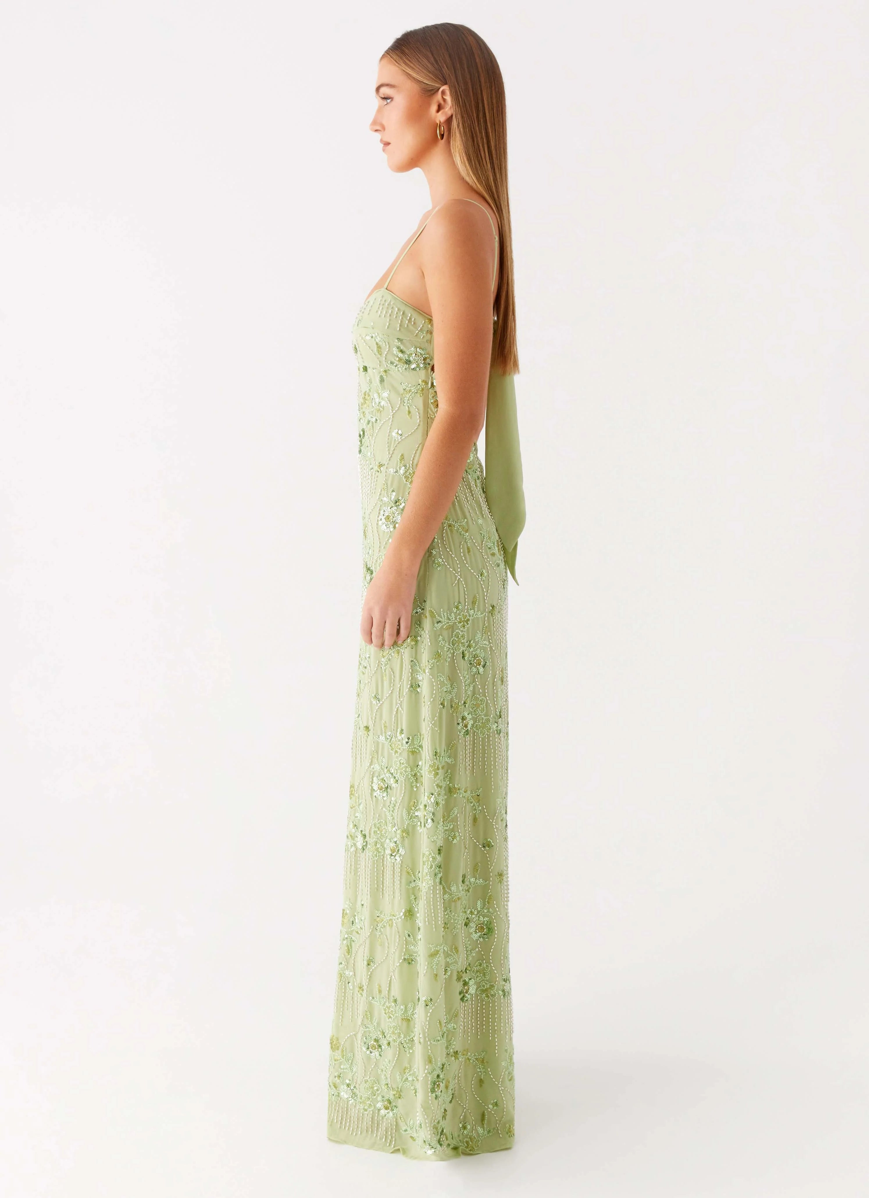 The Celandine Beaded Maxi Dress is your statement piece for sun-drenched evenings and glittering nights. Featuring a rounded neckline with delicate thin straps, this lime green beauty stuns with its open back and shimmering beaded fabric. Finished with a side hook and eye, invisible zipper and back tie, it’s fully lined for a flawless fit.