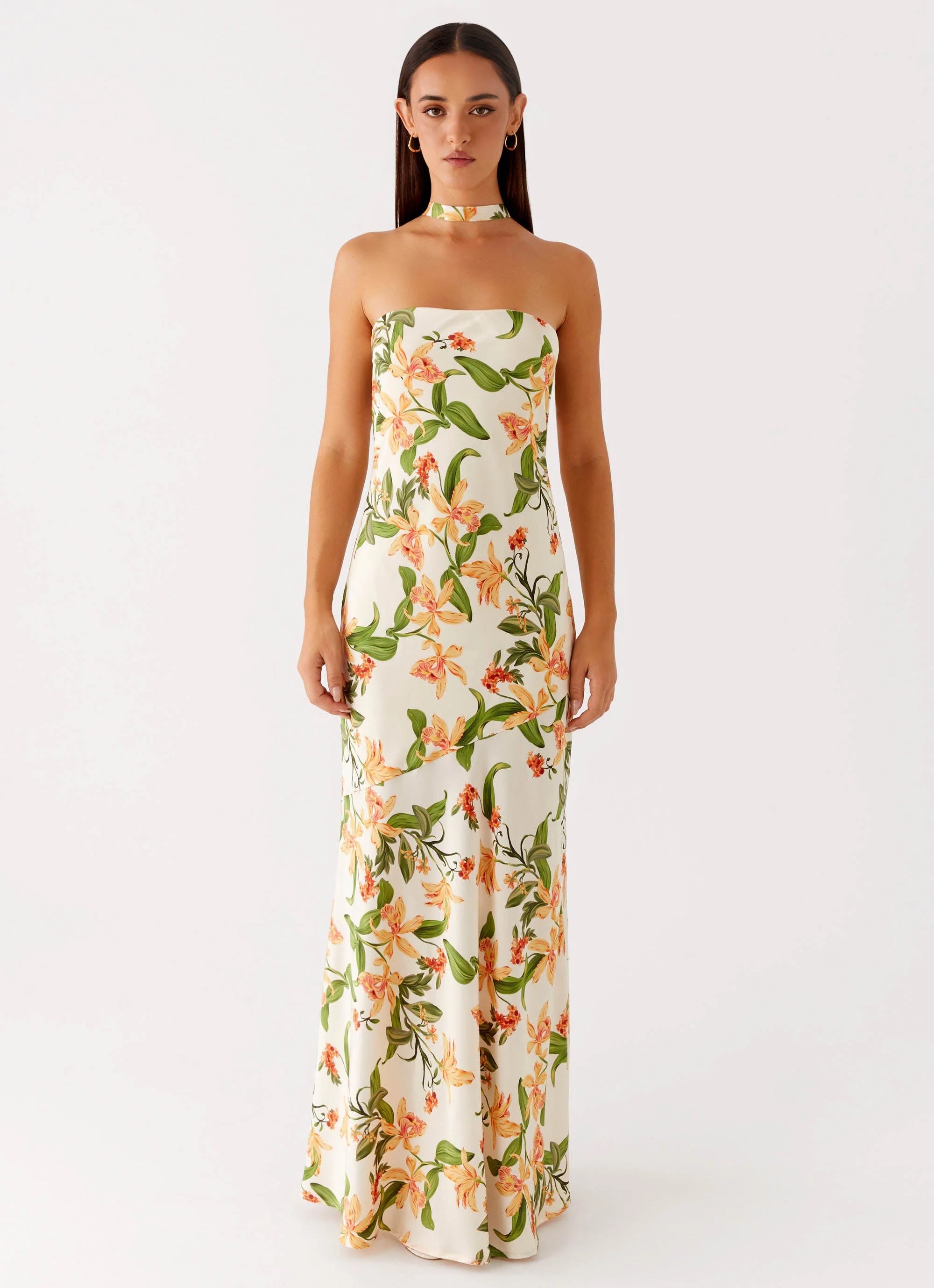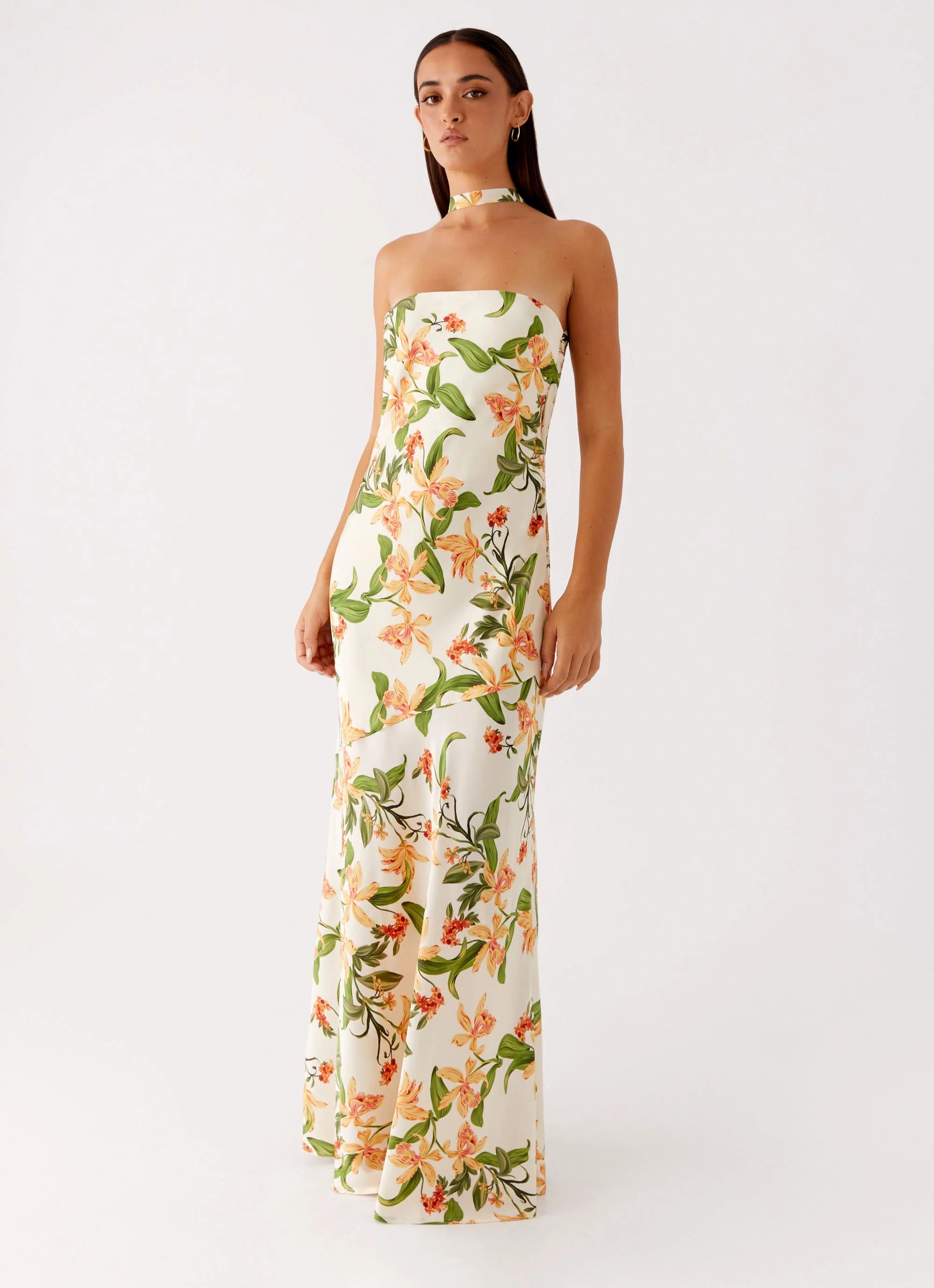 Elegant and fluid, the Damali Satin Maxi Dress is cut on the bias for a flawless drape. The strapless neckline, open cowl back, and soft sheen make it a timeless statement.