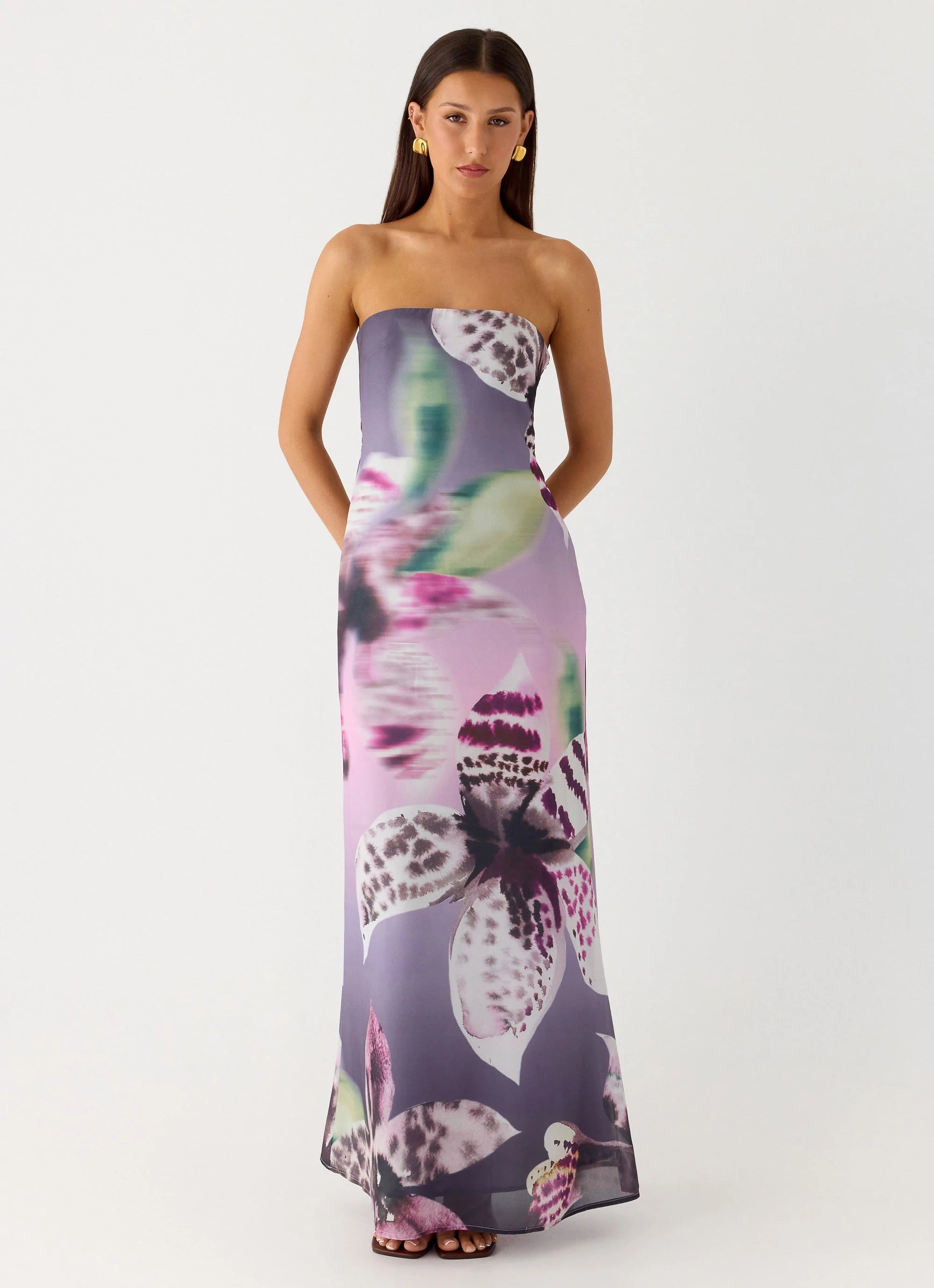 The Darcy Maxi Dress is made for sunset-to-sundown elegance and effortless statement style. Featuring a strapless neckline with silicone taping, this fully lined maxi silhouette is crafted in chiffon with a double layer and exclusive floral print for a body-skimming, flirty fit. Perfect for golden hour and after-dark styling.
