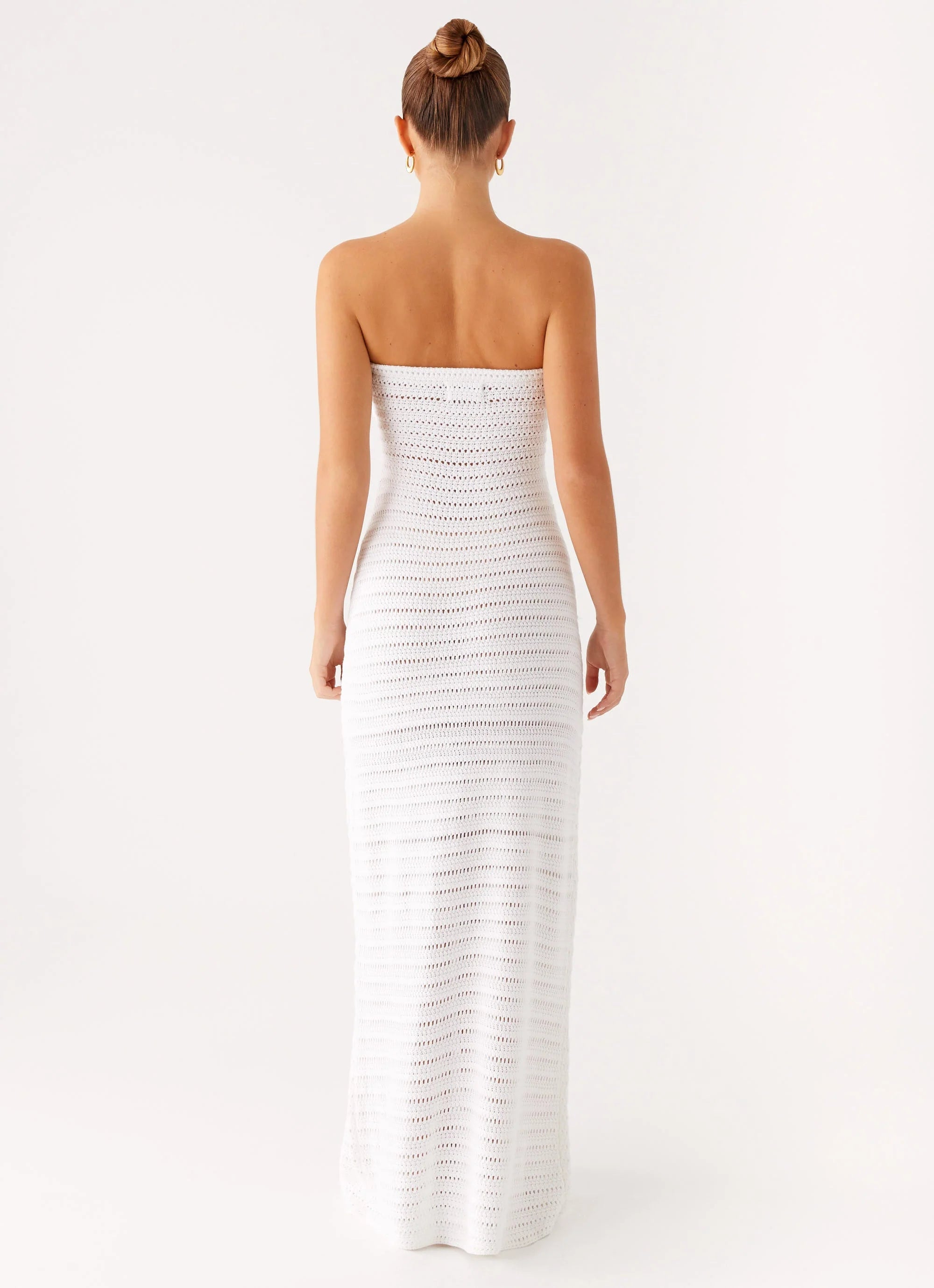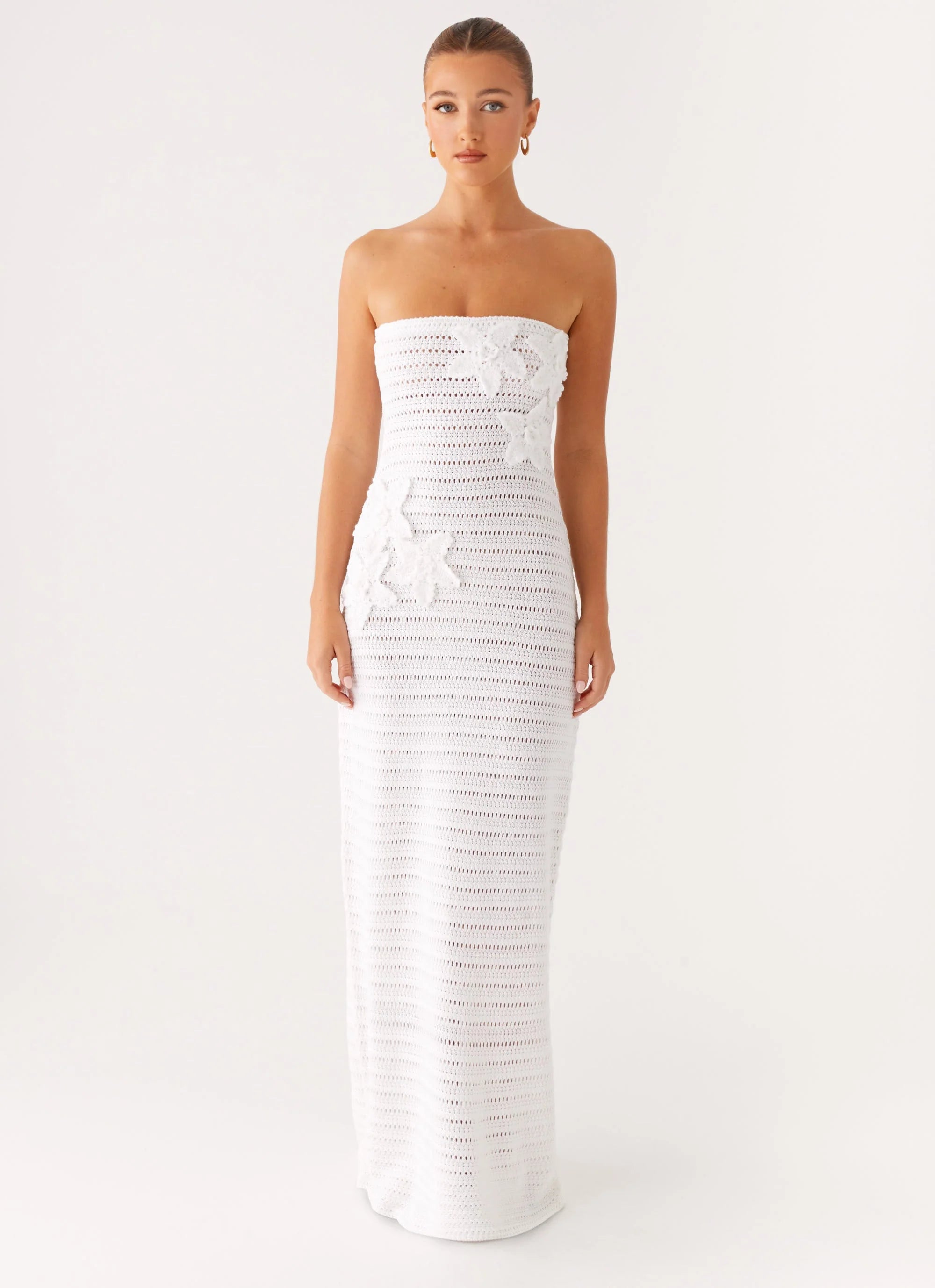 Barefoot nights and endless skies — the Diaz Crochet Maxi Dress in White is made for dreamers. Strapless with delicate crochet flower appliqué and a full-length silhouette, it’s crafted from airy crochet fabric to take you from sunset strolls to starlit dance floors.