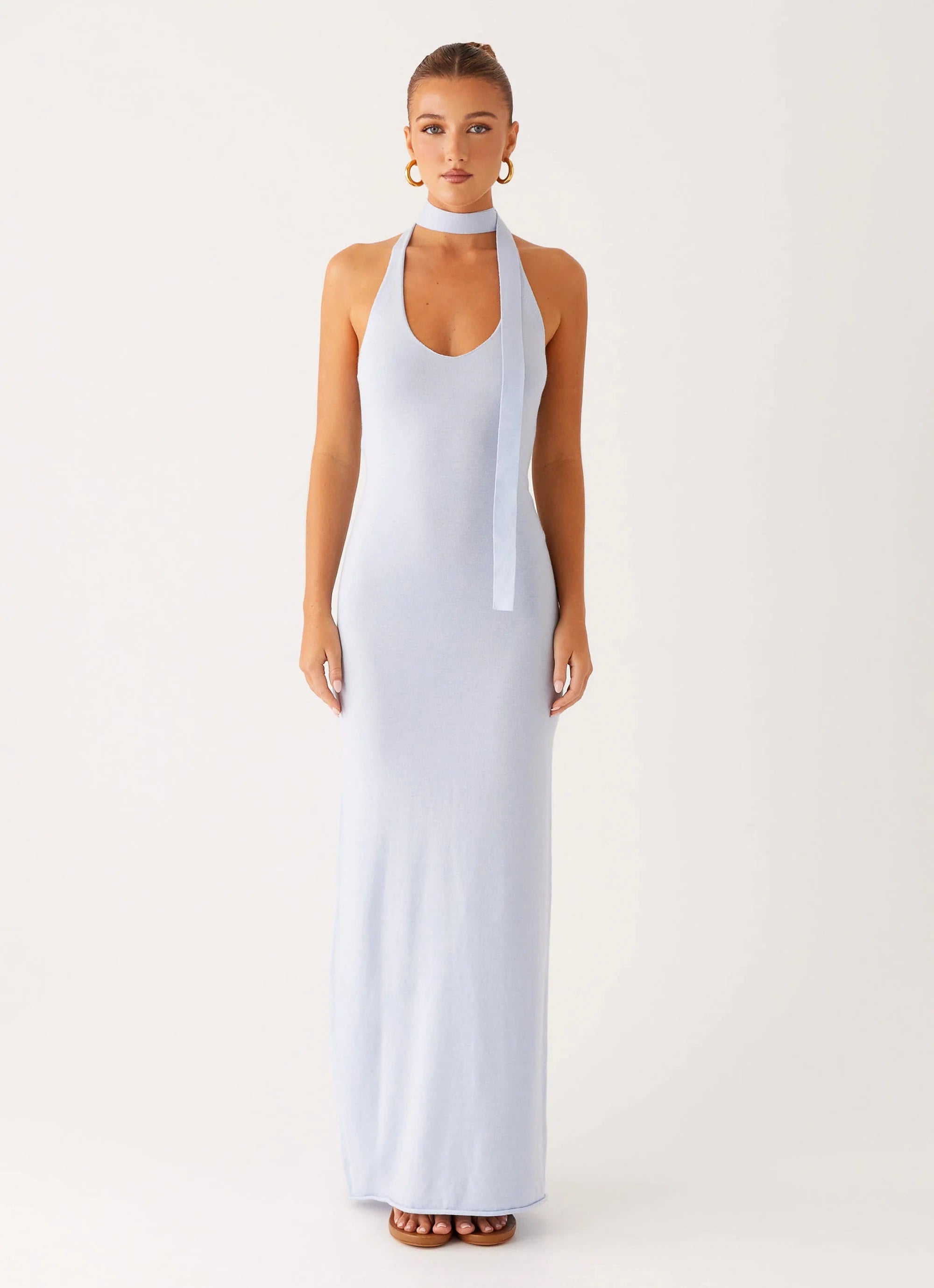 The Eddie Maxi Dress is effortlessly sleek in soft blue stretch knit. Designed with a body-skimming silhouette and underlining for a smooth fit, it’s made to move with you from slow afternoons to after-hours.