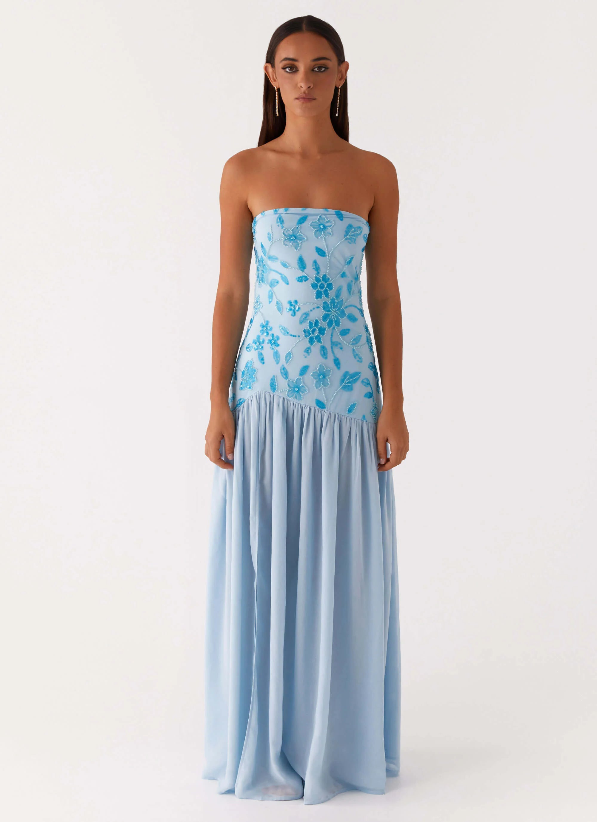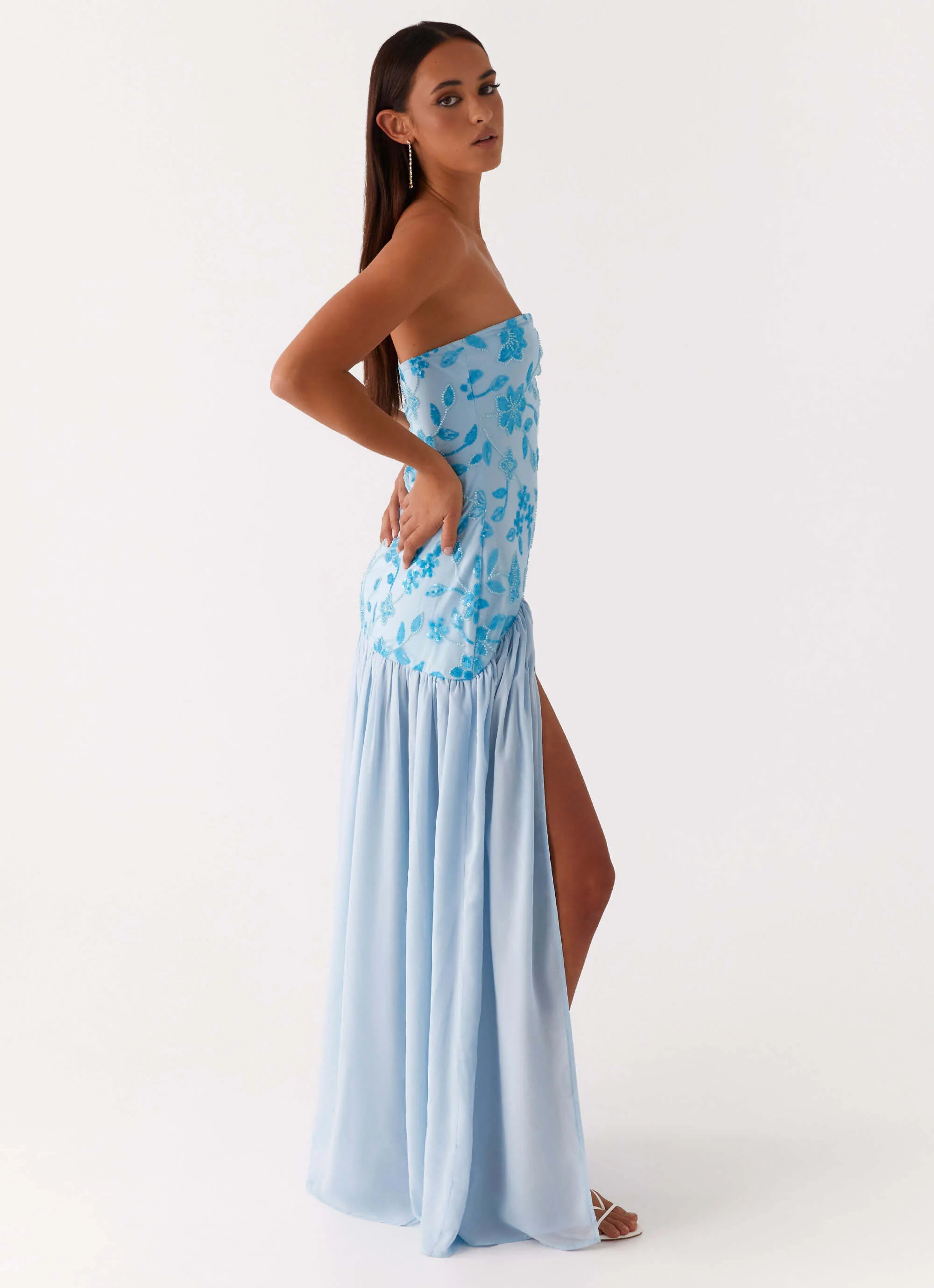 The Eden Strapless Beaded Maxi Dress features a strapless neckline, a daring side front split, and a semi-sheer chiffon skirt that flows effortlessly with every step. Adorned with stunning bead detailing, this dress exudes a sophisticated yet sultry vibe, perfect for an unforgettable evening.