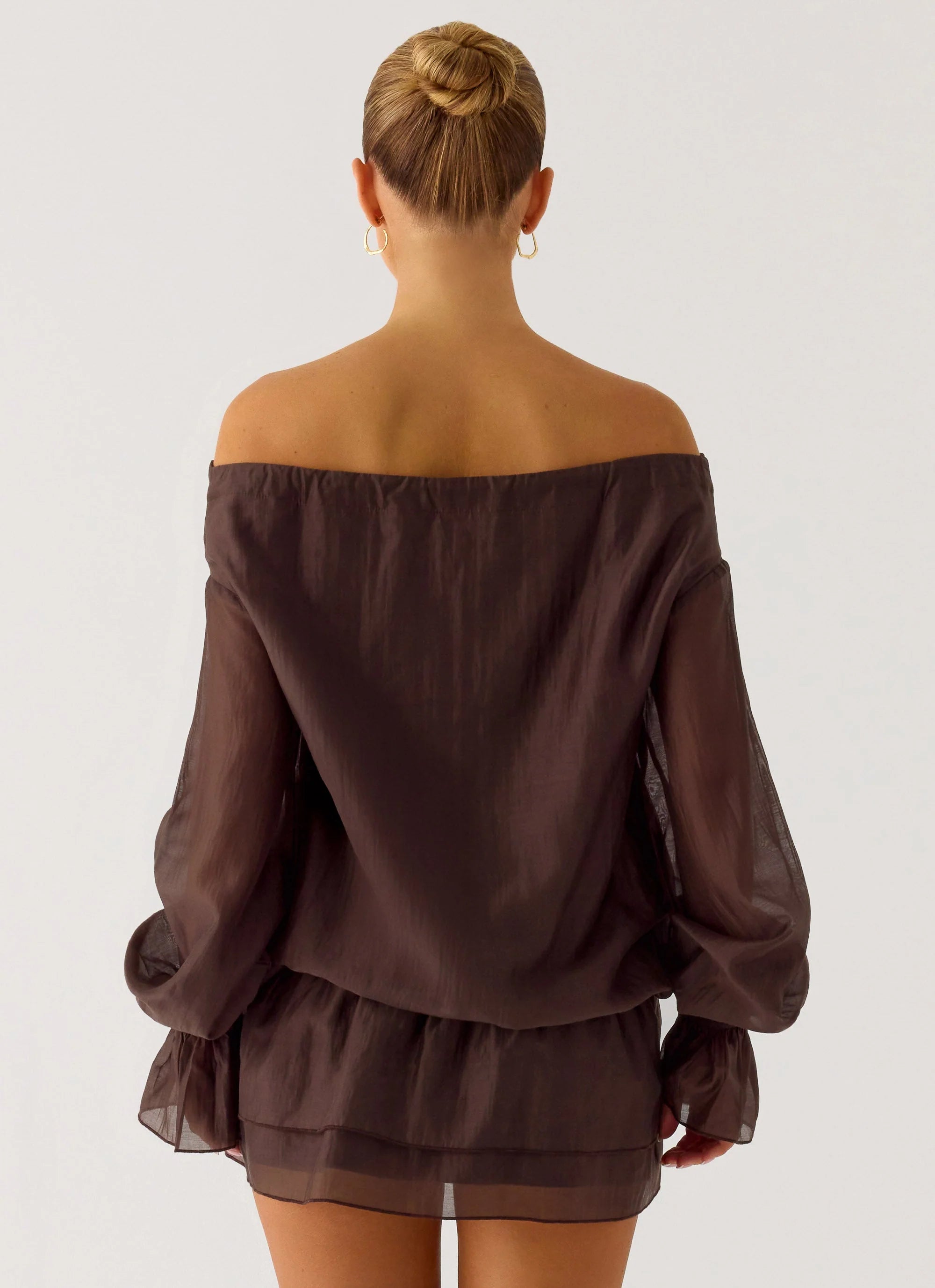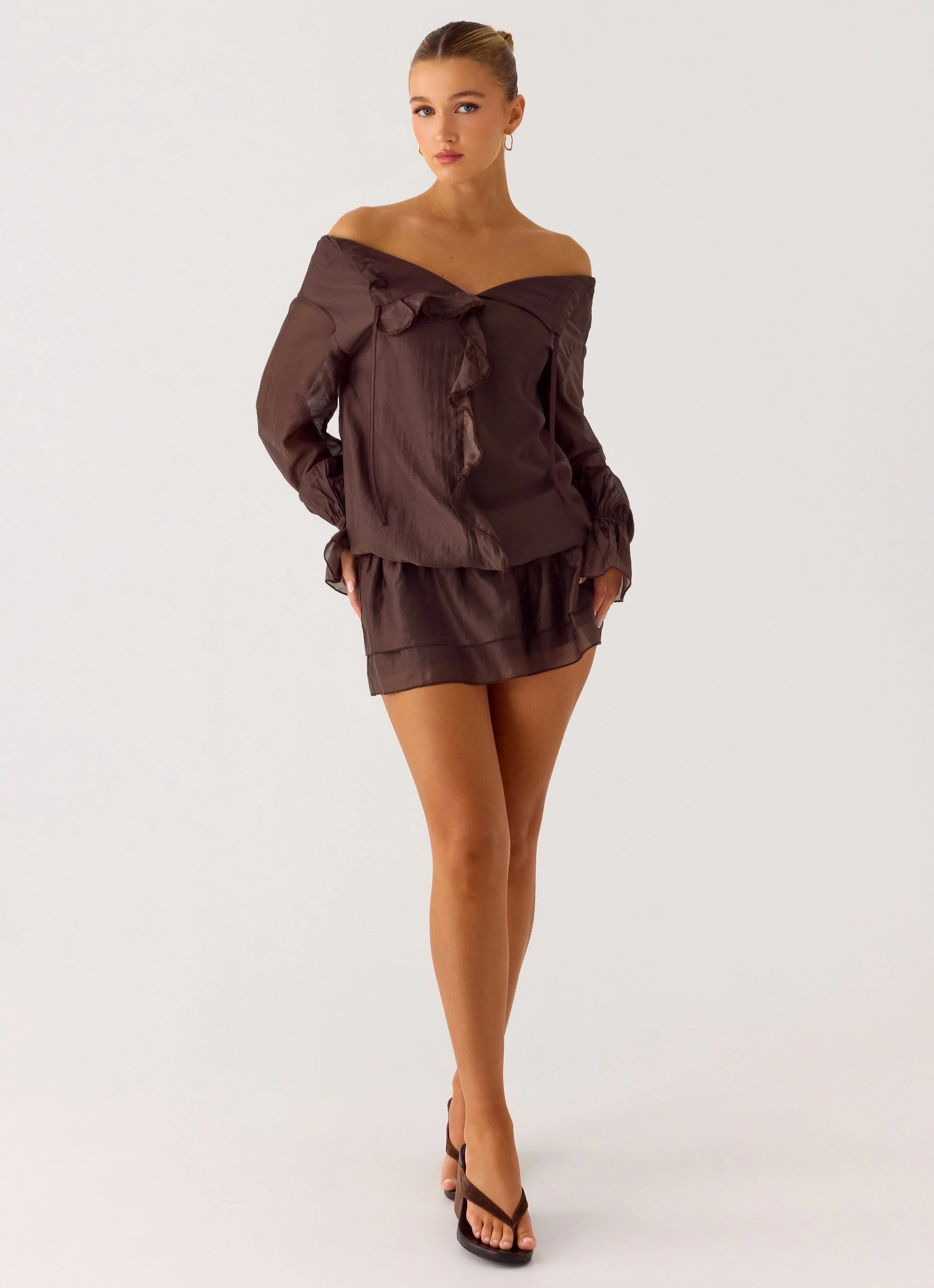 The Elris Drop Waist Mini Dress is a playful mini-length dress with an off-the-shoulder neckline and ruffled front detail. Its long wide sleeves with frilled cuffs add a whimsical touch to a flattering silhouette.