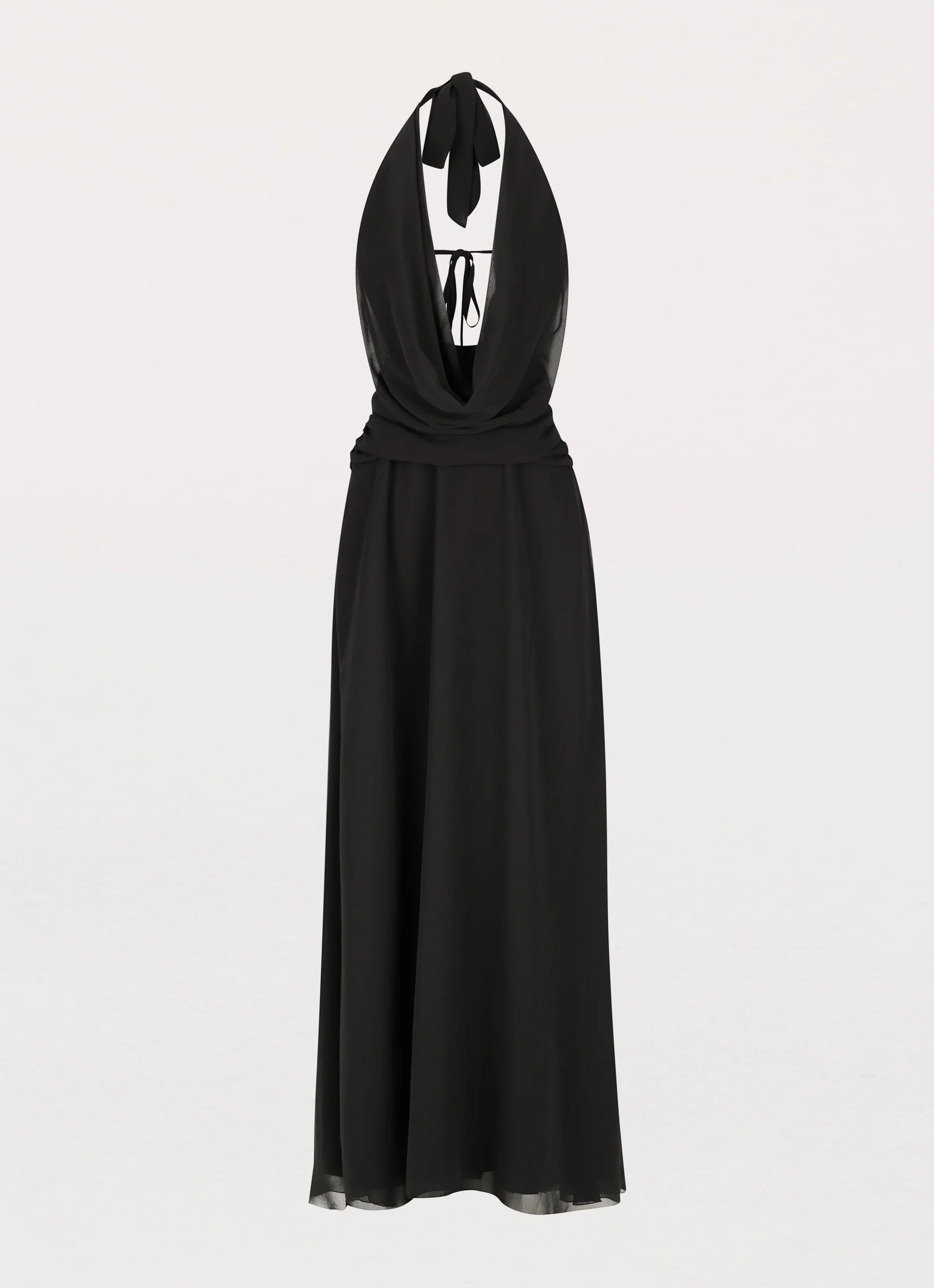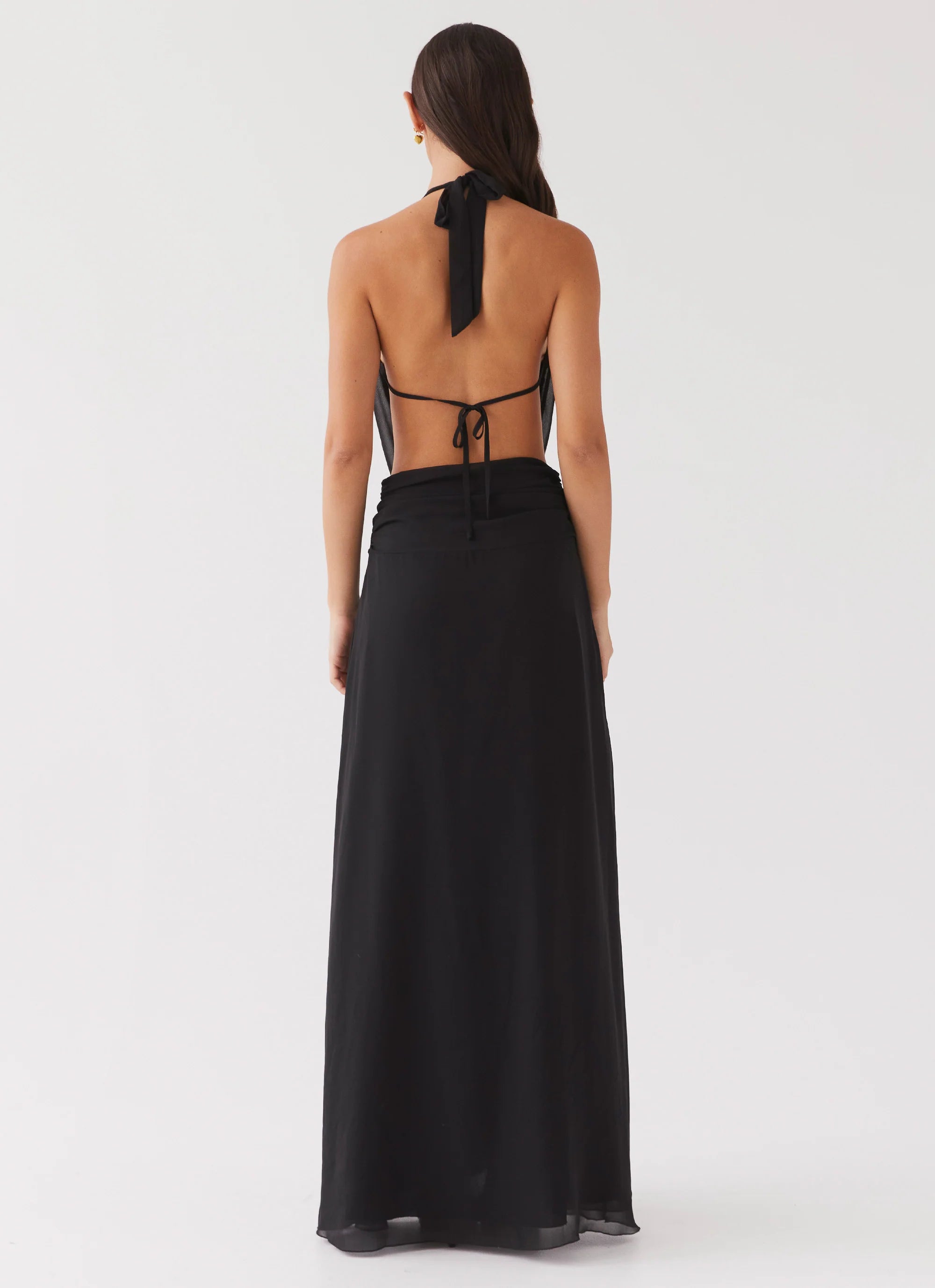 Step into the spotlight with our best-selling Elysia Chiffon Maxi Dress. Featuring a low cowl neckline and an open back, crafted from a classic black chiffon, it exudes night-time elegance. Pair it with heels and hoops for a stellar look that shines under the nightclub silhouettes.
