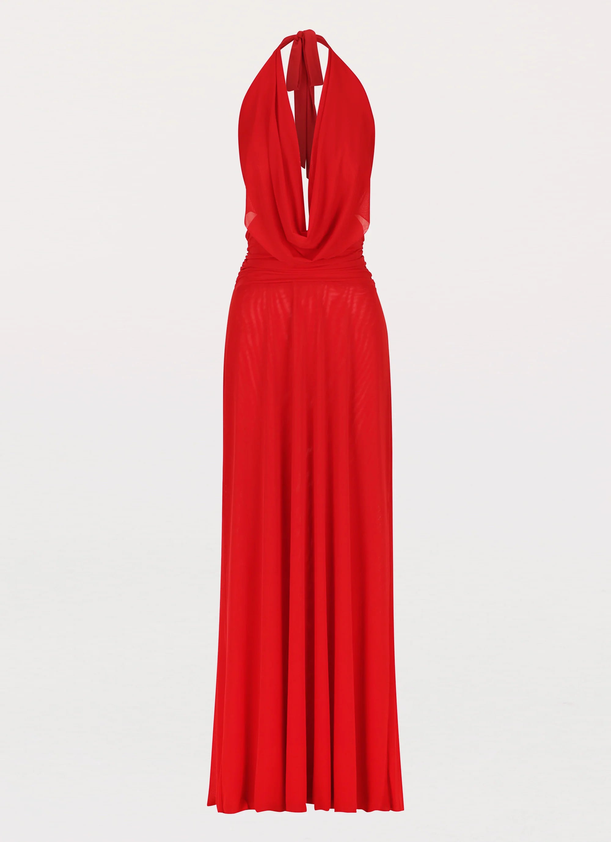 Introducing our best-selling Elysia Mesh Maxi Dress. With a low cowl neckline and open back, crafted from red mesh fabric, it's perfect for night-time elegance. Pair with heels and hoops for a stellar look that shines under the nightclub silhouettes.