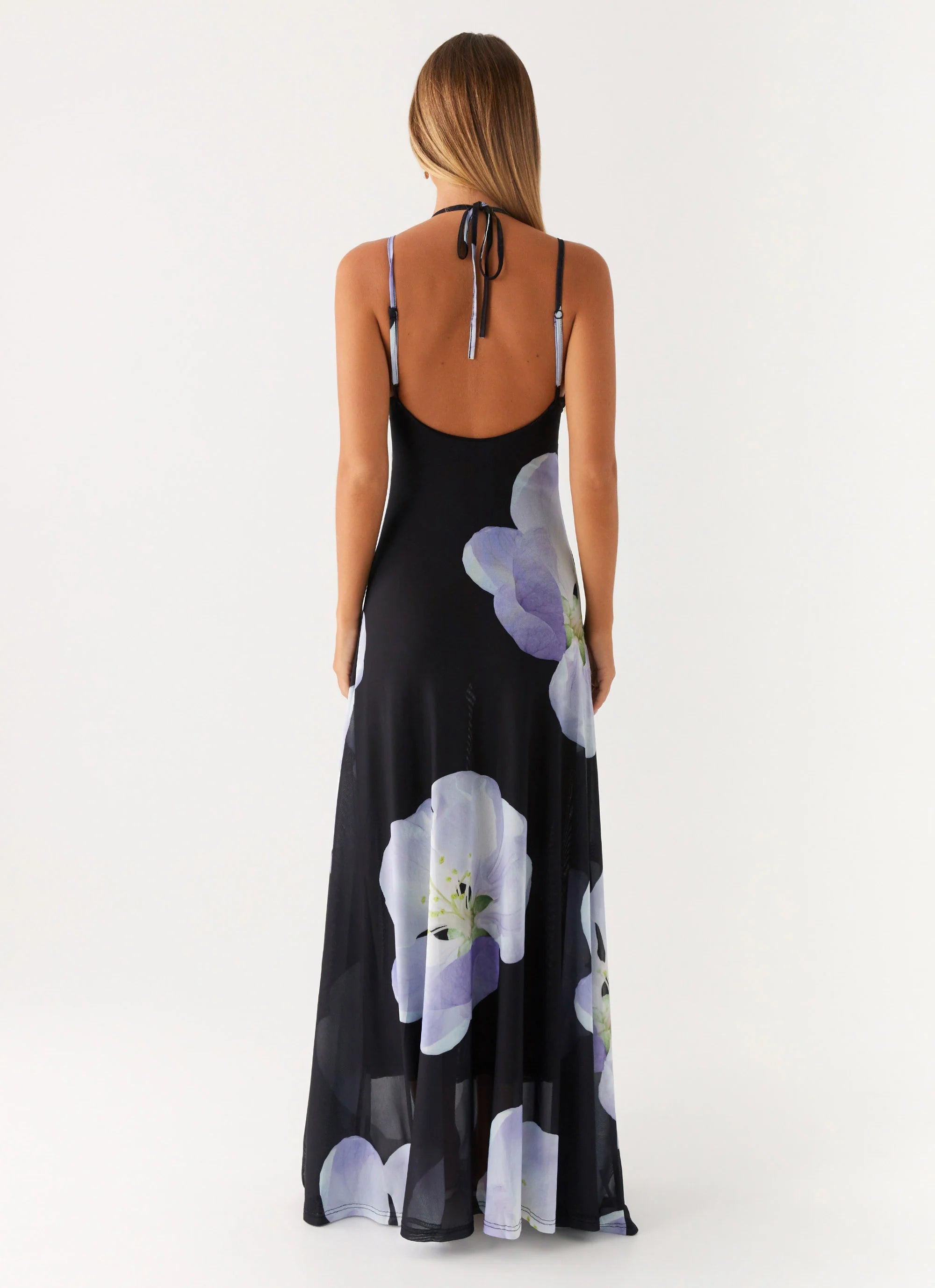 The Enrika Maxi Dress features edgy front cutouts and a sleek back cutout, with thin straps for a delicate touch. The design exudes a bold yet sophisticated vibe, perfect for making a statement.