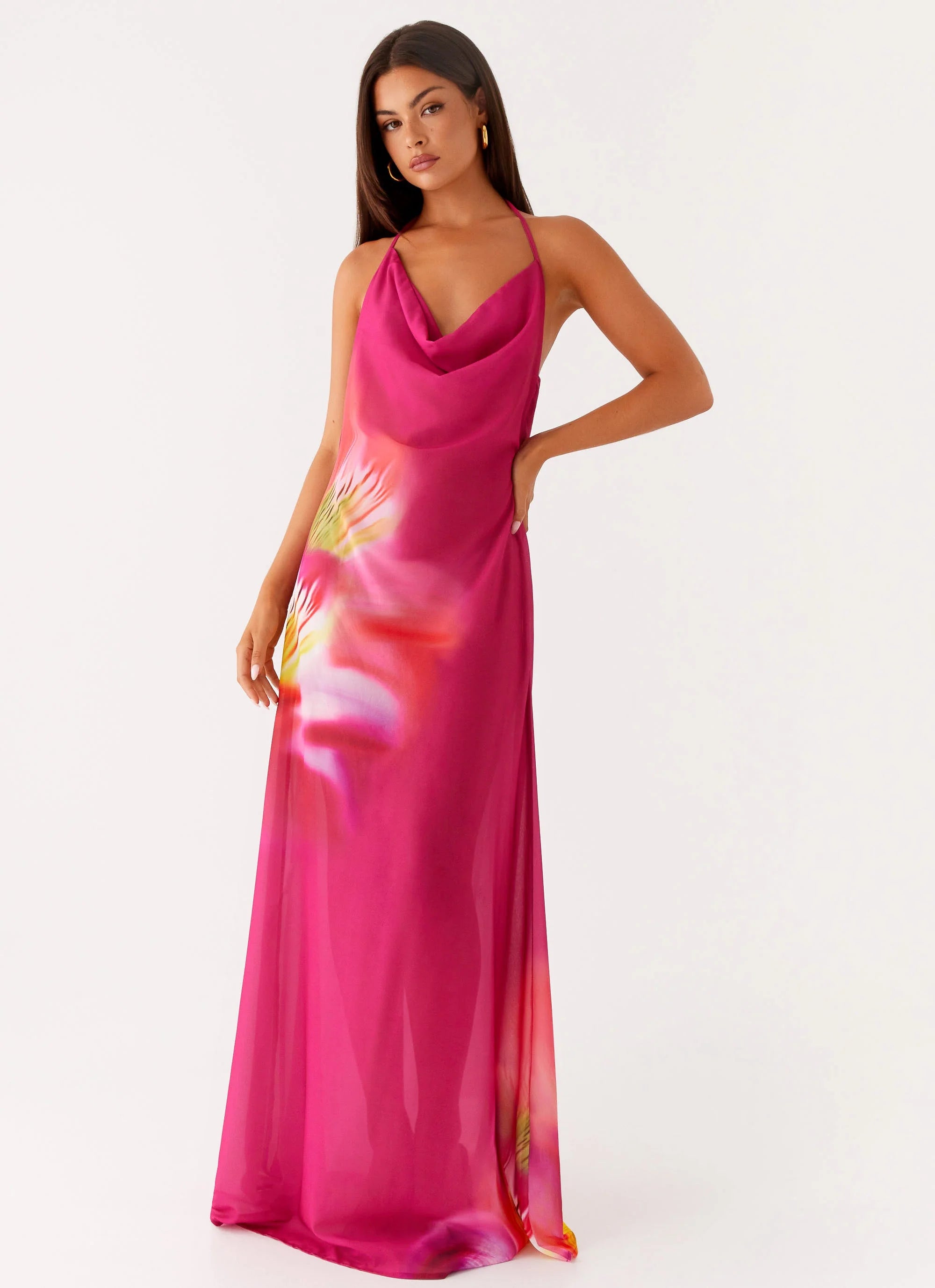 The Fantasy Maxi Dress combines elegance and allure with its low front cowl neckline and back tie. This dreamy chiffon dress is perfect for making an entrance.