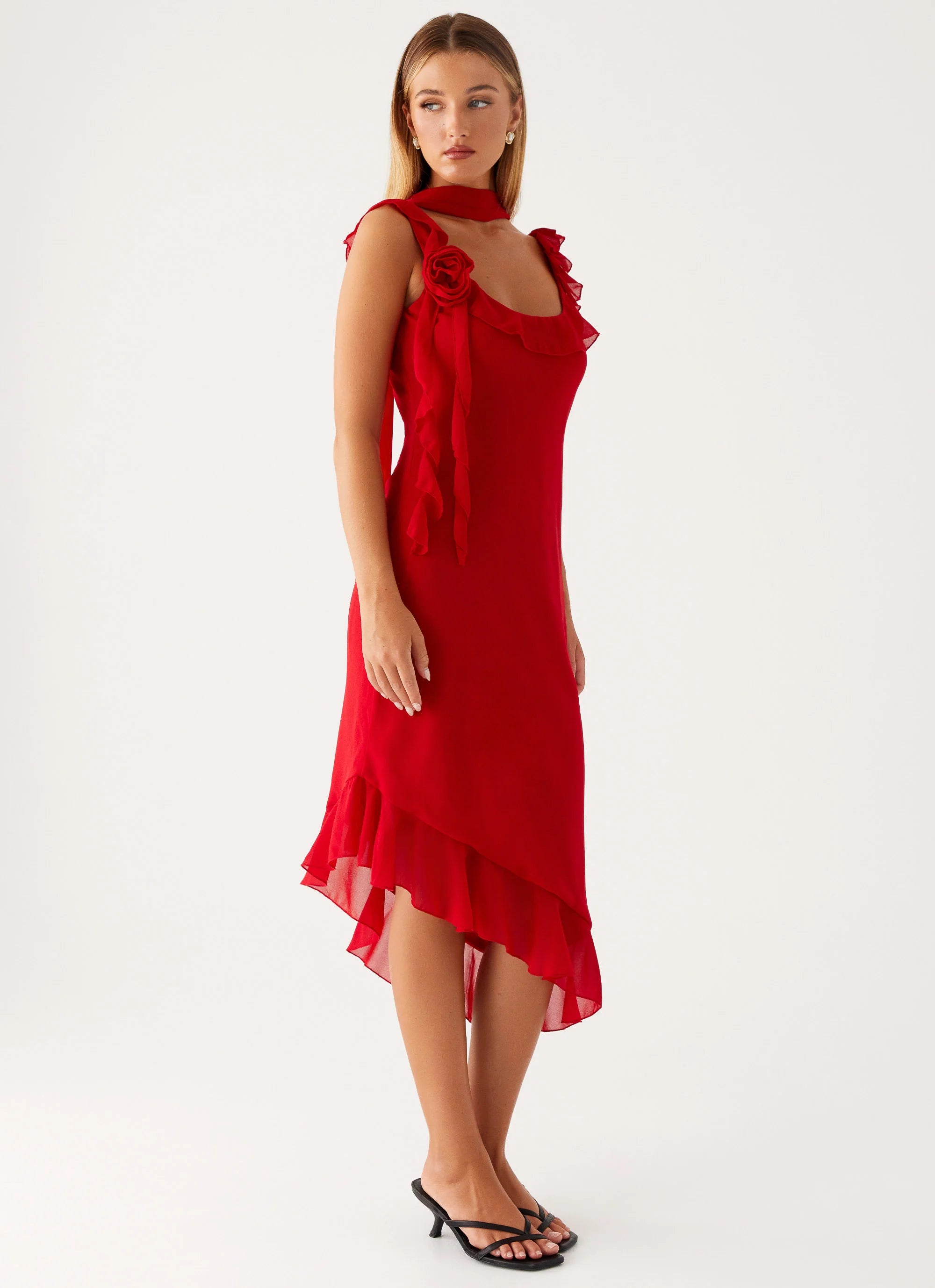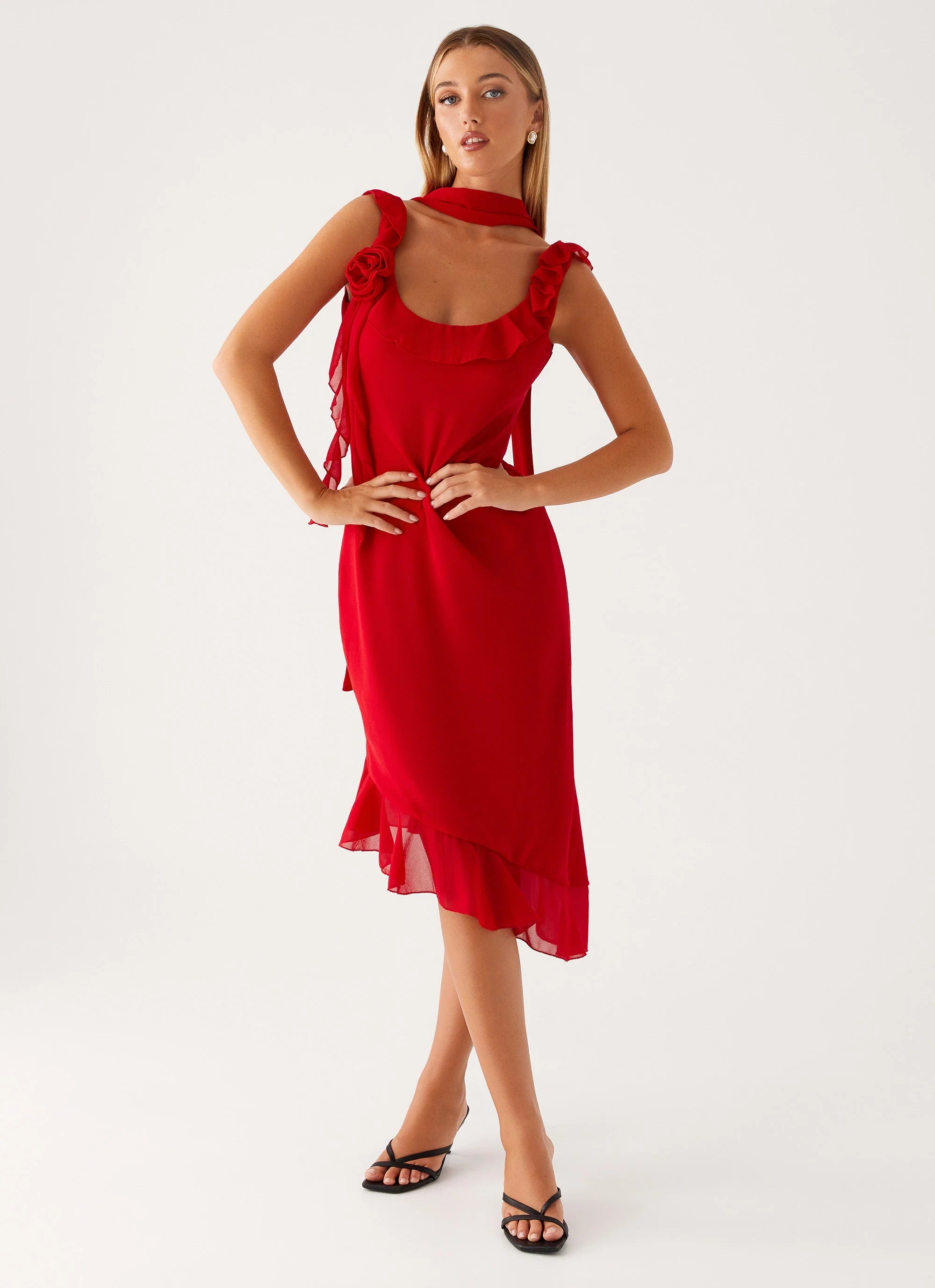 The Fariday Midi Dress is effortlessly chic and sophisticated. Featuring a flattering midi length, scarf detailing for a touch of elegance, and lightweight chiffon material that flows with every step, this dress is perfect for golden skies and balmy nights.