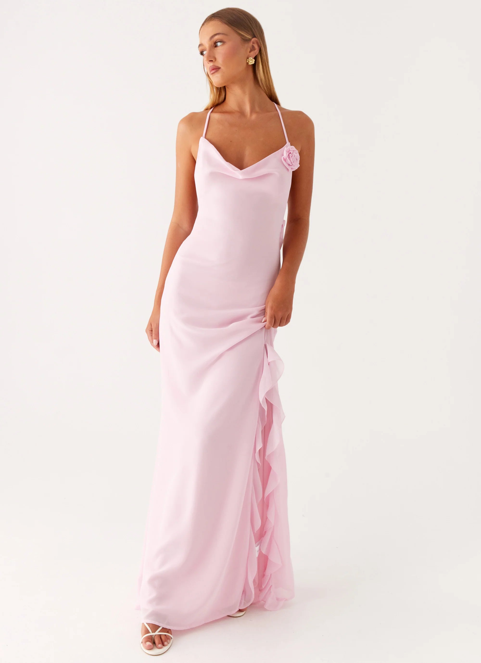 First Class Maxi Dress – Step into luxury with this effortlessly chic design. The low front cowl and thin straps offer a delicate, sultry vibe, while the open back creates a show-stopping silhouette. Perfect for making an entrance wherever the night takes you.