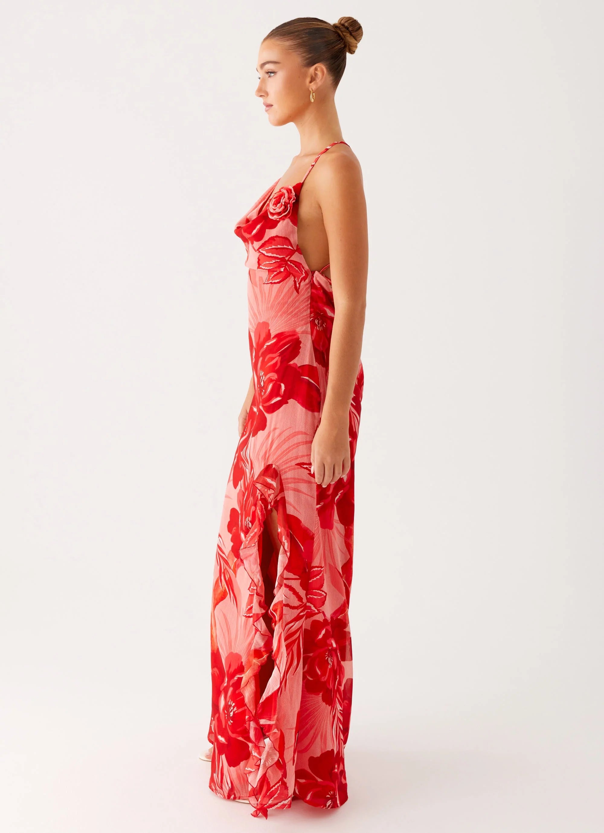 The First Class Maxi Dress is made for golden skies and nights that feel endless. Featuring a low front cowl, open back, and bold flower embellishment, it’s wrapped in our exclusive Sicily Sunsets print for a look that turns every moment into a destination.