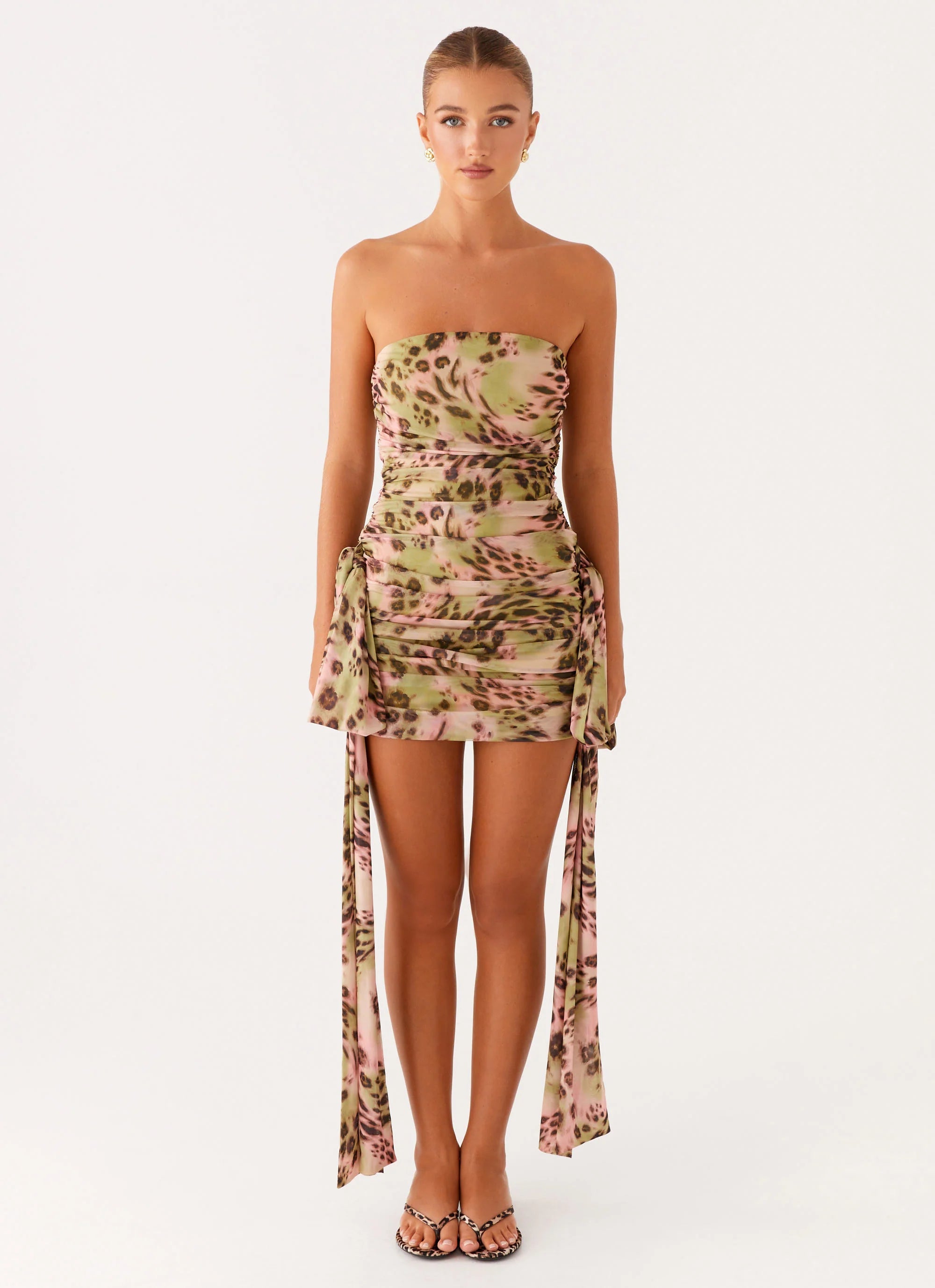 Georgie Mini Dress featuring a strapless neckline, ruched sides, and stretch mesh. A curve-hugging silhouette made for golden hour to after dark.