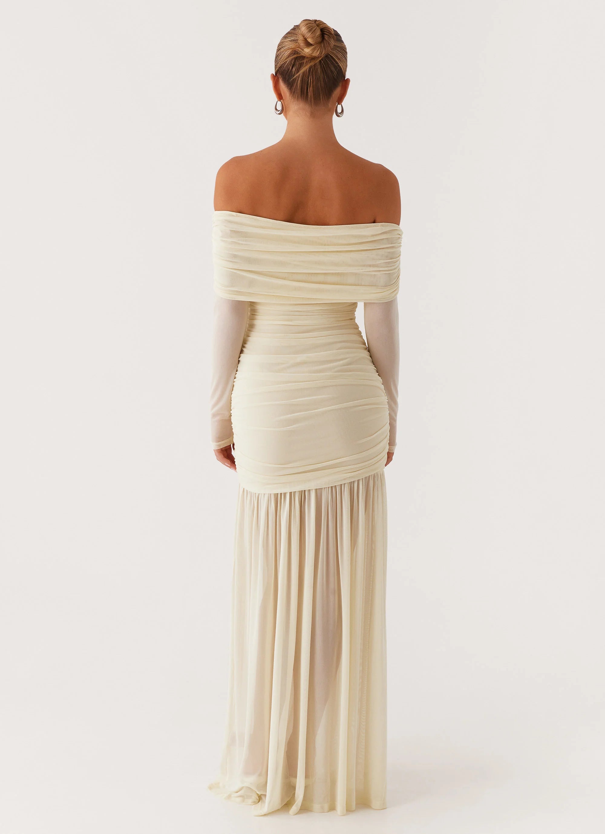 The Ginny Maxi Dress features an off-shoulder neckline and a flattering stretch mesh fabric. It is designed with ruched sides to enhance the silhouette. This dress offers both elegance and comfort for any occasion.