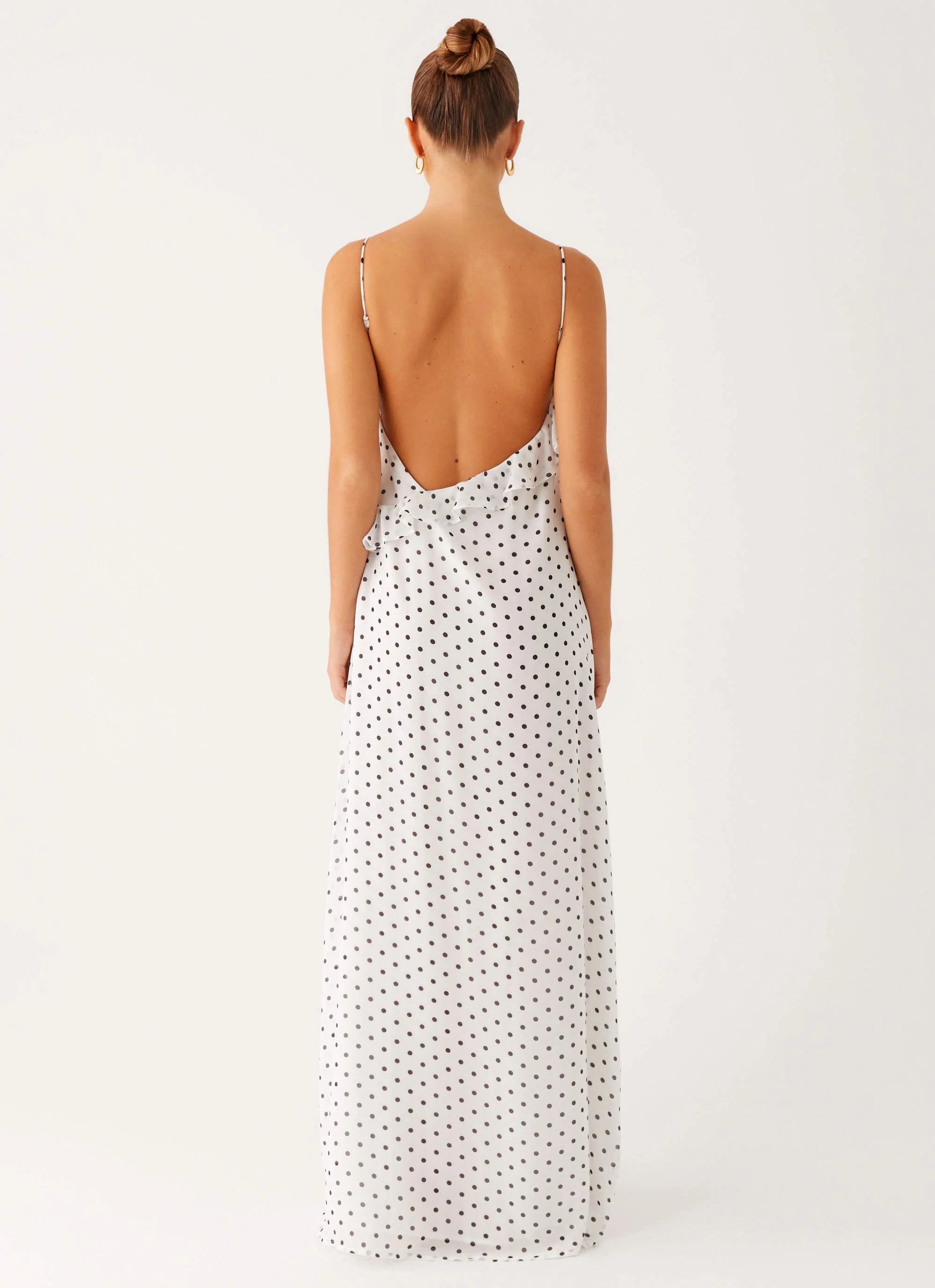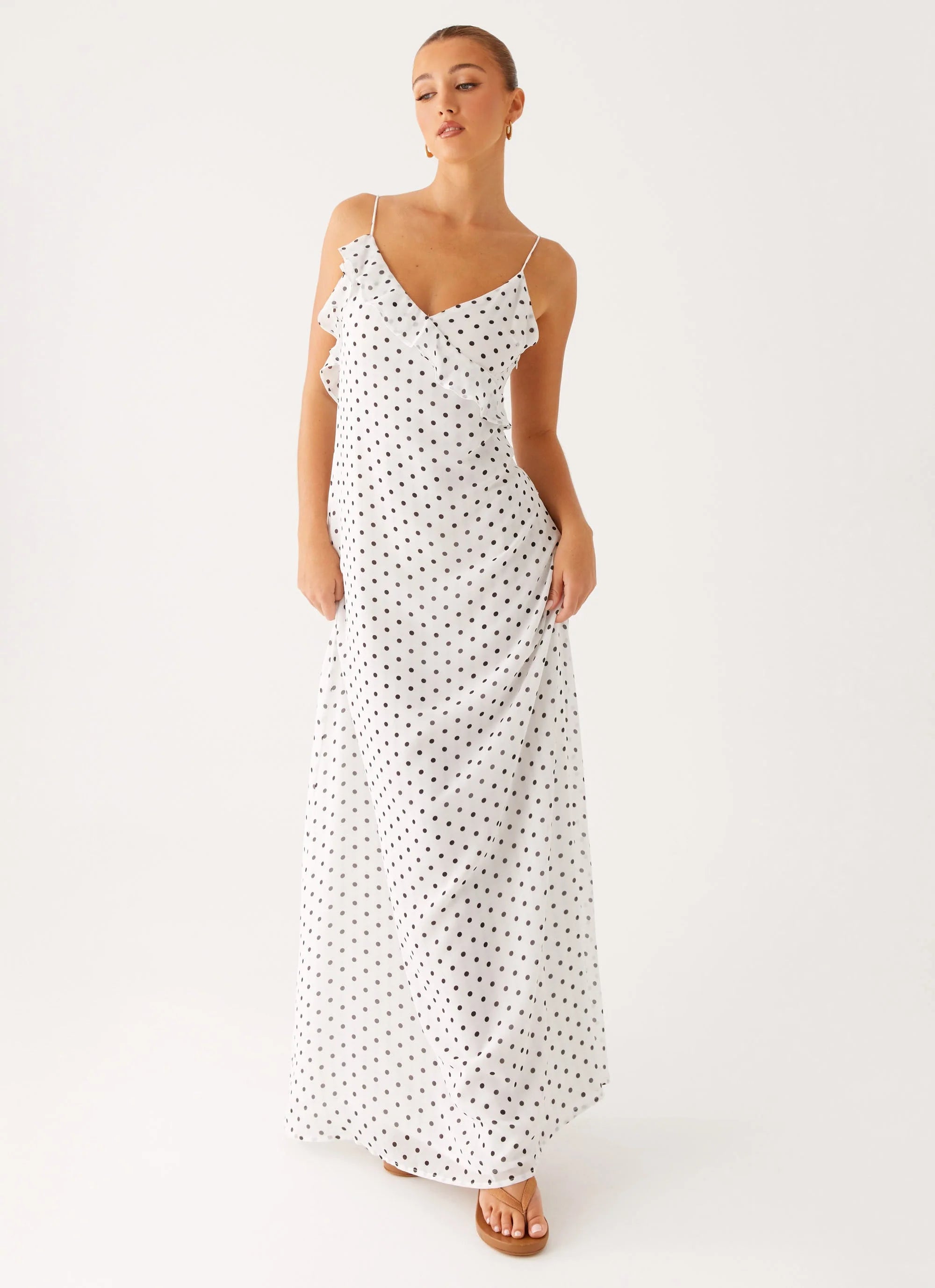 Drift into golden hour elegance with the Harri Maxi Dress. Featuring a V neckline with delicate frilled trim, thin adjustable straps, low back, and flowing chiffon—made to capture every balmy night and sunset silhouette.