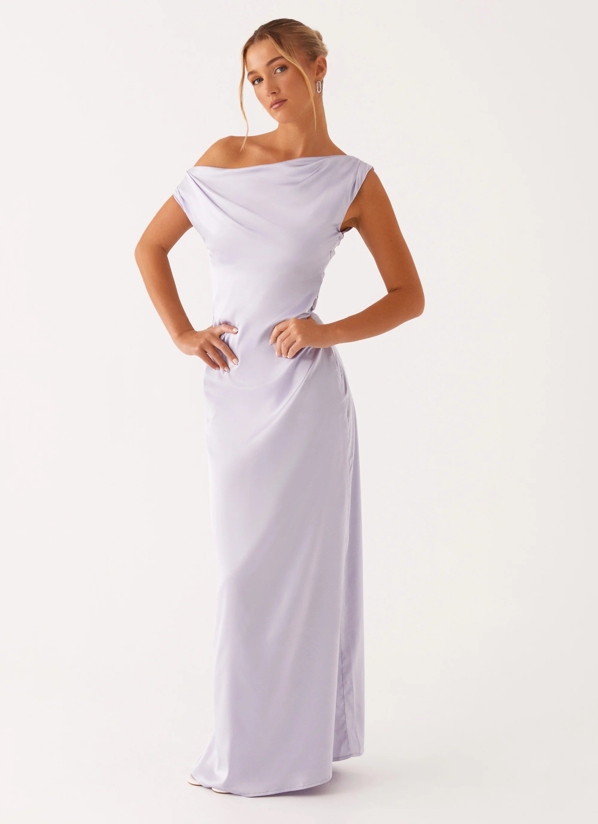 The Heart of Glass Satin Maxi Dress is a vision of elegance and romance. The off-shoulder neckline exudes effortless allure, while ruched shoulders add a touch of texture and drama. The flowing maxi length moves gracefully with every step, creating a stunning silhouette.