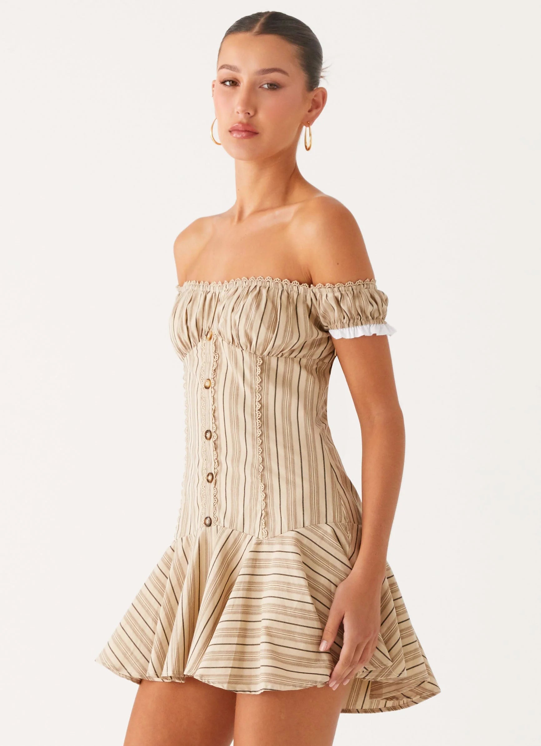 The Jumana Off Shoulder Mini Dress is your go-to for feminine, flirty dressing. Crafted in soft cotton, this mini features a sweetheart neckline with defined cups, elasticated off-shoulder cap sleeves, and delicate lace trim detailing. With a fitted bodice and flared skirt, it’s finished in our exclusive print for a romantic feel.