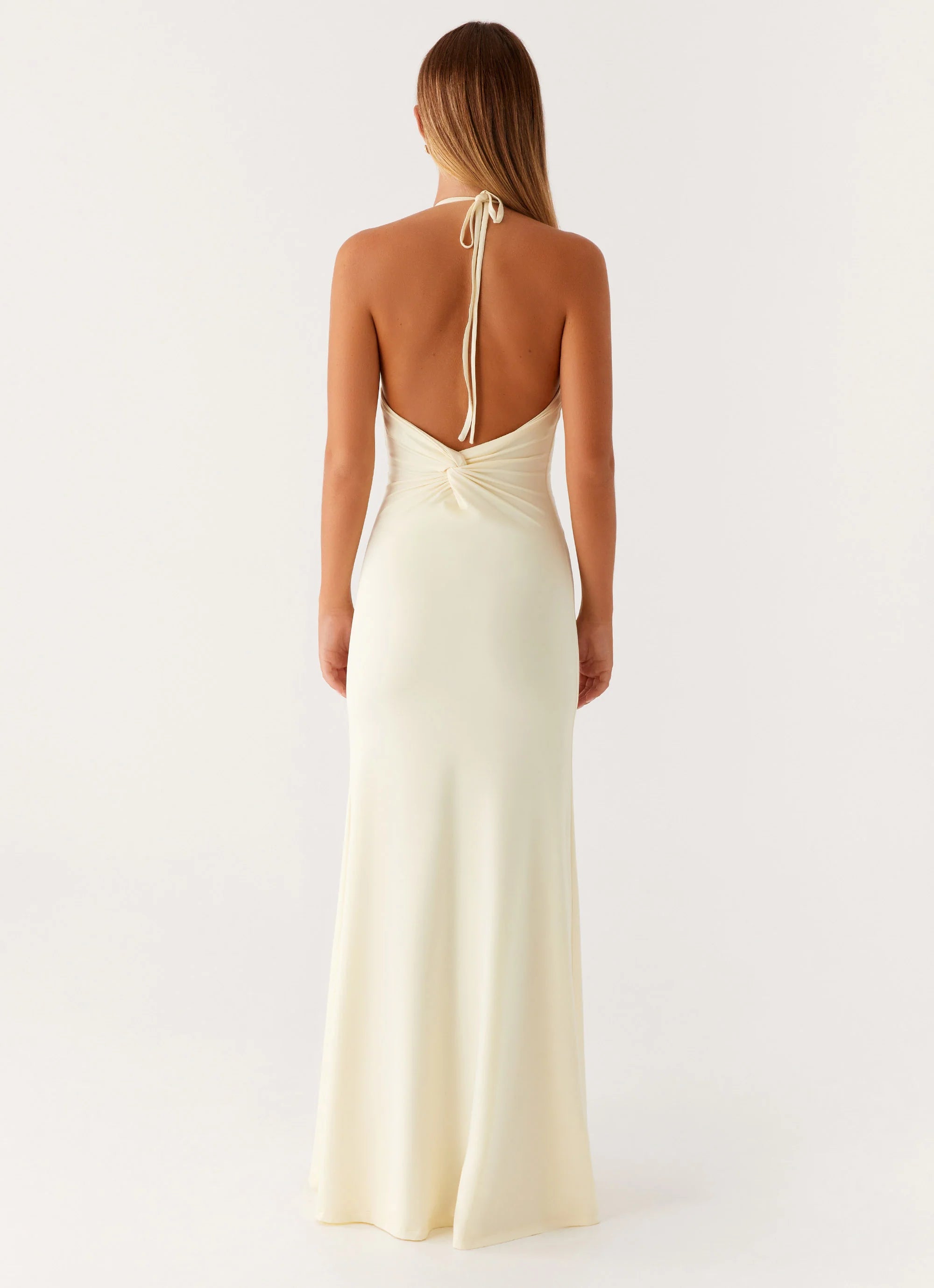 The Just in Time Maxi Dress features a halterneckline, stretch jersey material for a comfortable fit, and an open back for a touch of allure. Ideal for effortless style with a hint of edge.