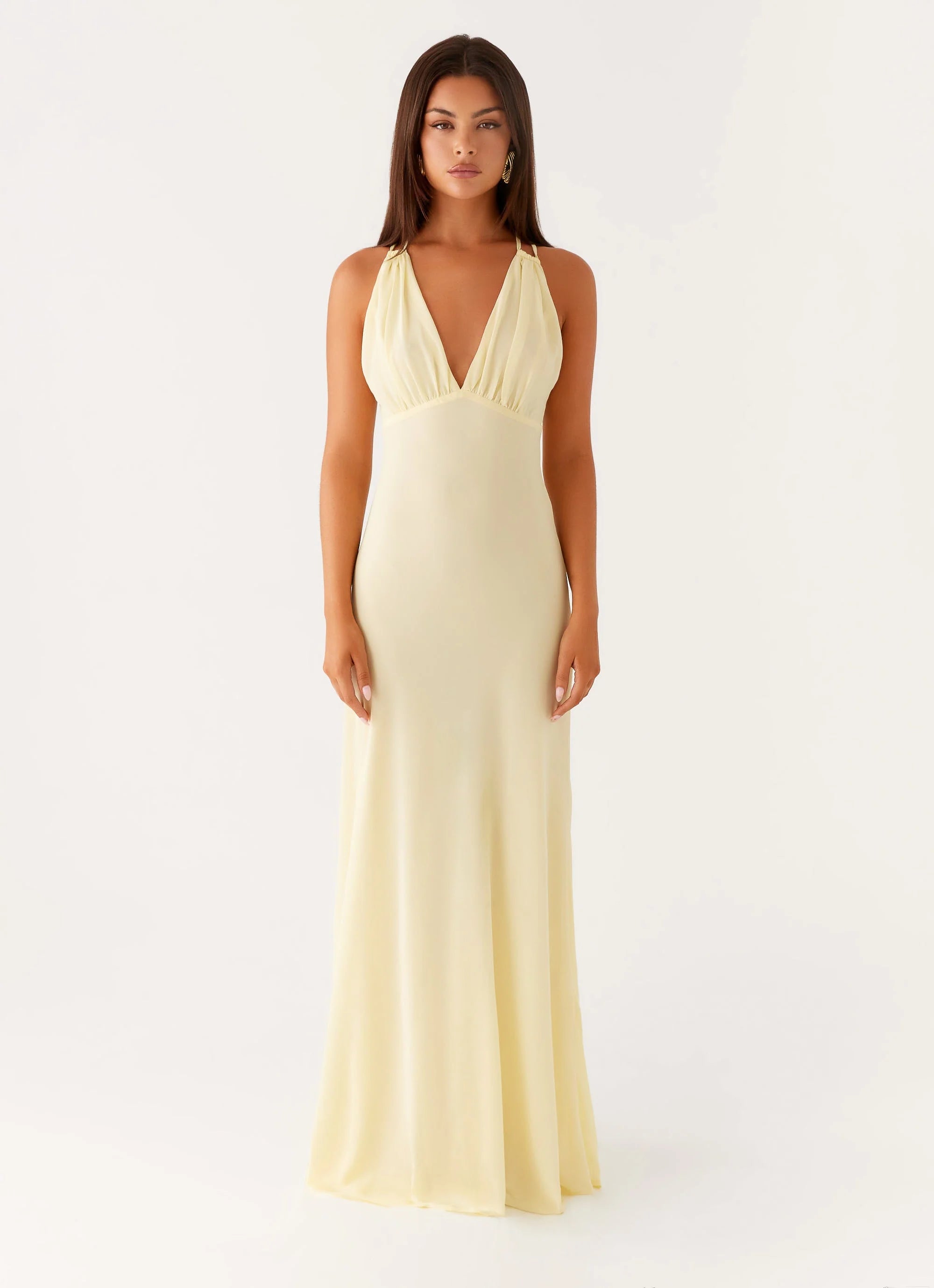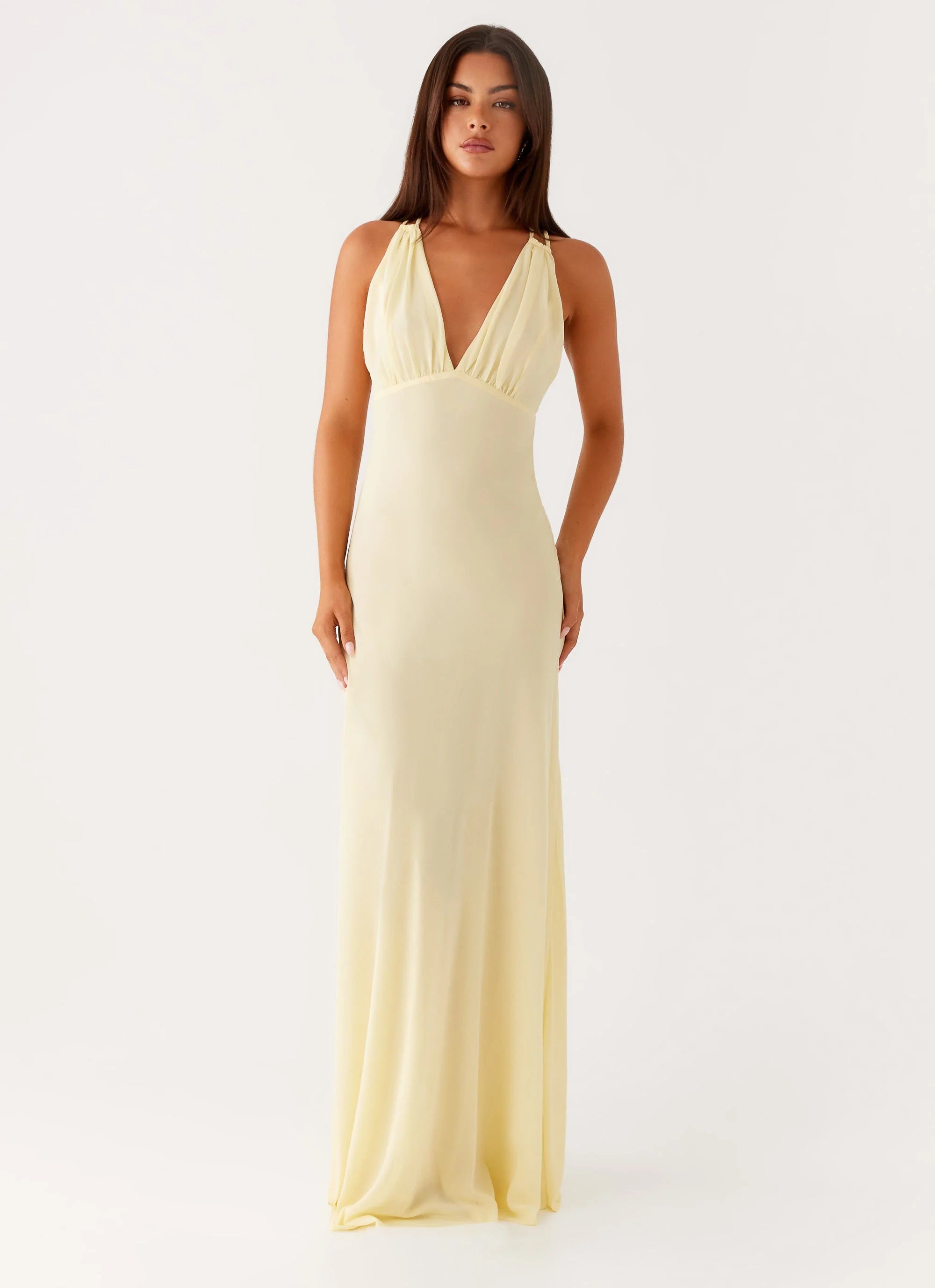 Bold and daring, the Kacia Maxi Dress features a low v neckline and ruched underbust. The low back and back tie give it a sultry finish, while the stretch mesh ensures comfort.