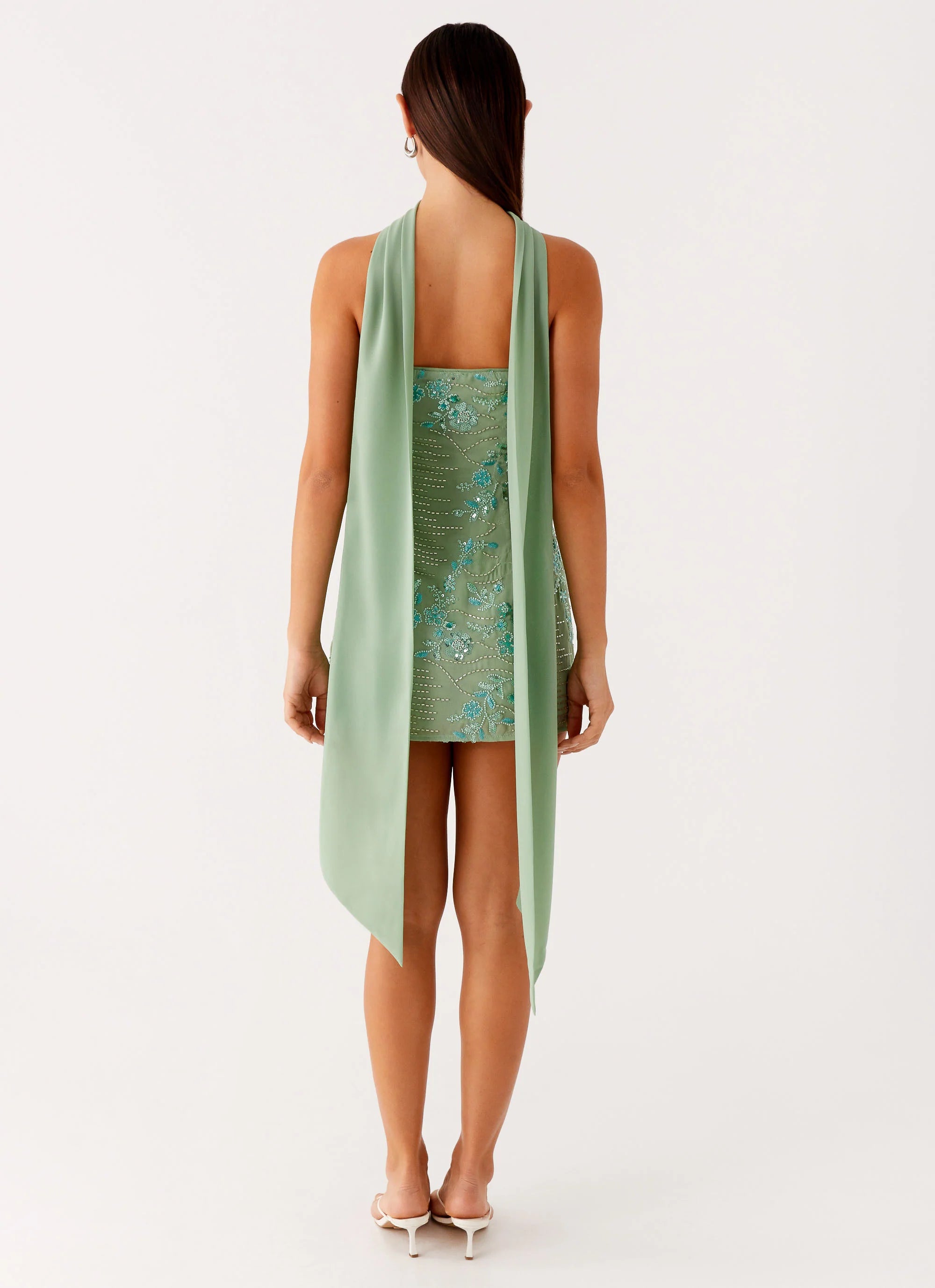 Draped in shimmering beaded fabric, the Kiesha Mini Dress is a standout piece with a strapless neckline and a detachable neck scarf for a touch of drama. The mint hue catches the light effortlessly, making it your go-to for spotlight moments.