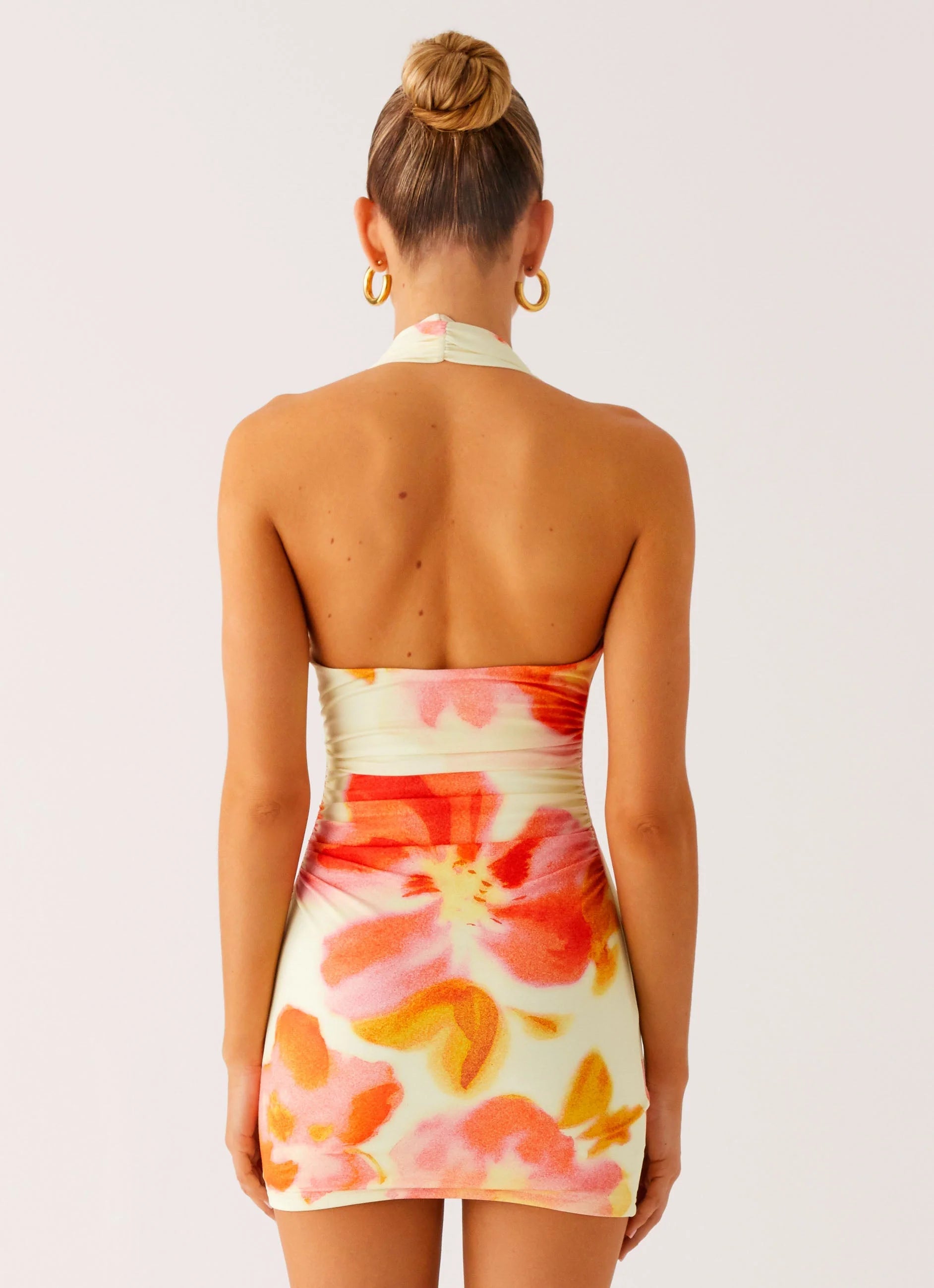 The Know You Better Mini Dress is your new go-to for sun-drenched days and balmy nights. Designed in our exclusive print, this halter style features a playful front tie, ruched sides, and a daring low back. Crafted from a stretch jersey that moves with you, and self-lined for a smooth, comfortable fit.