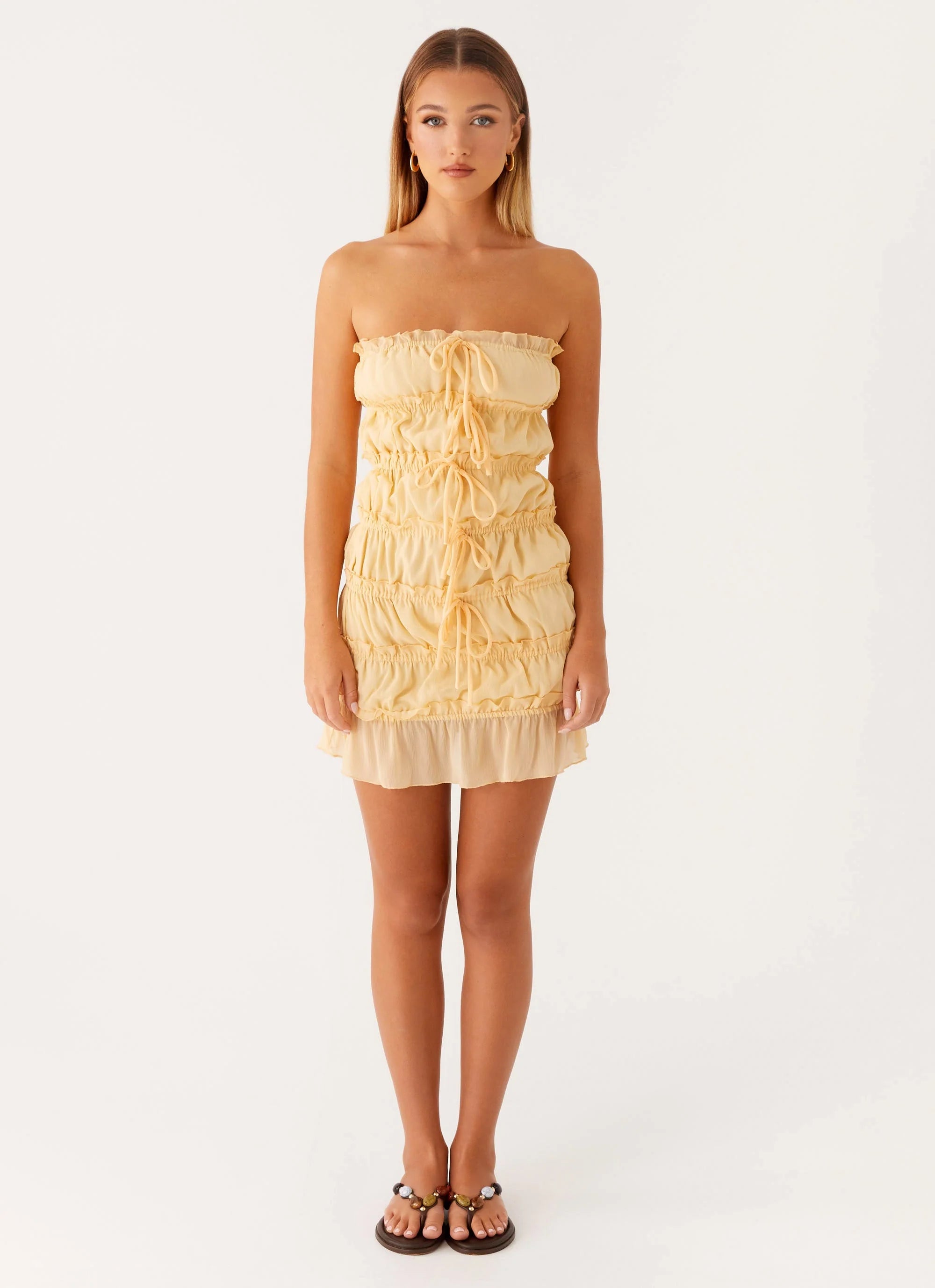 Flirty and fitted, the Kylan Mini Dress is ruched throughout with a front tie detail and strapless neckline. The elasticated design hugs the body while keeping you comfortable all night.