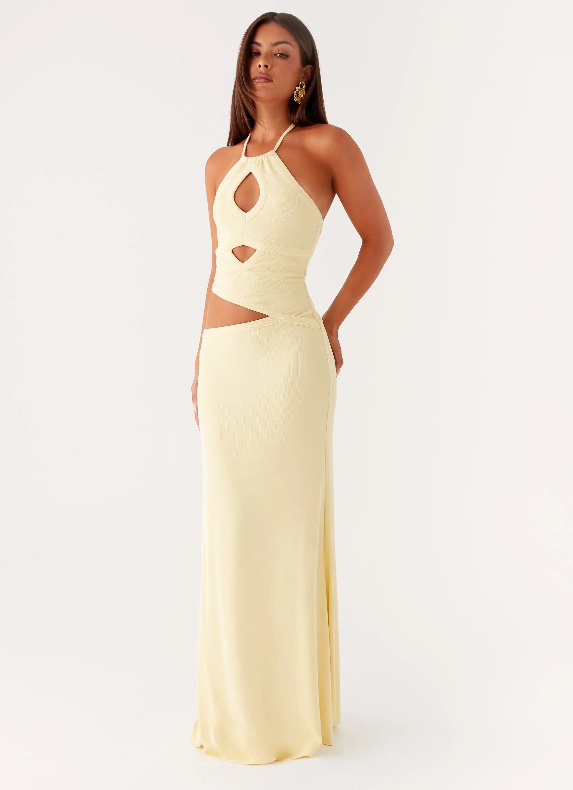 The Lanah Cut Out Maxi Dress is bold and striking, designed to turn heads. Featuring a halter neckline and an open back, it offers a sleek, flattering silhouette with just the right amount of edge.