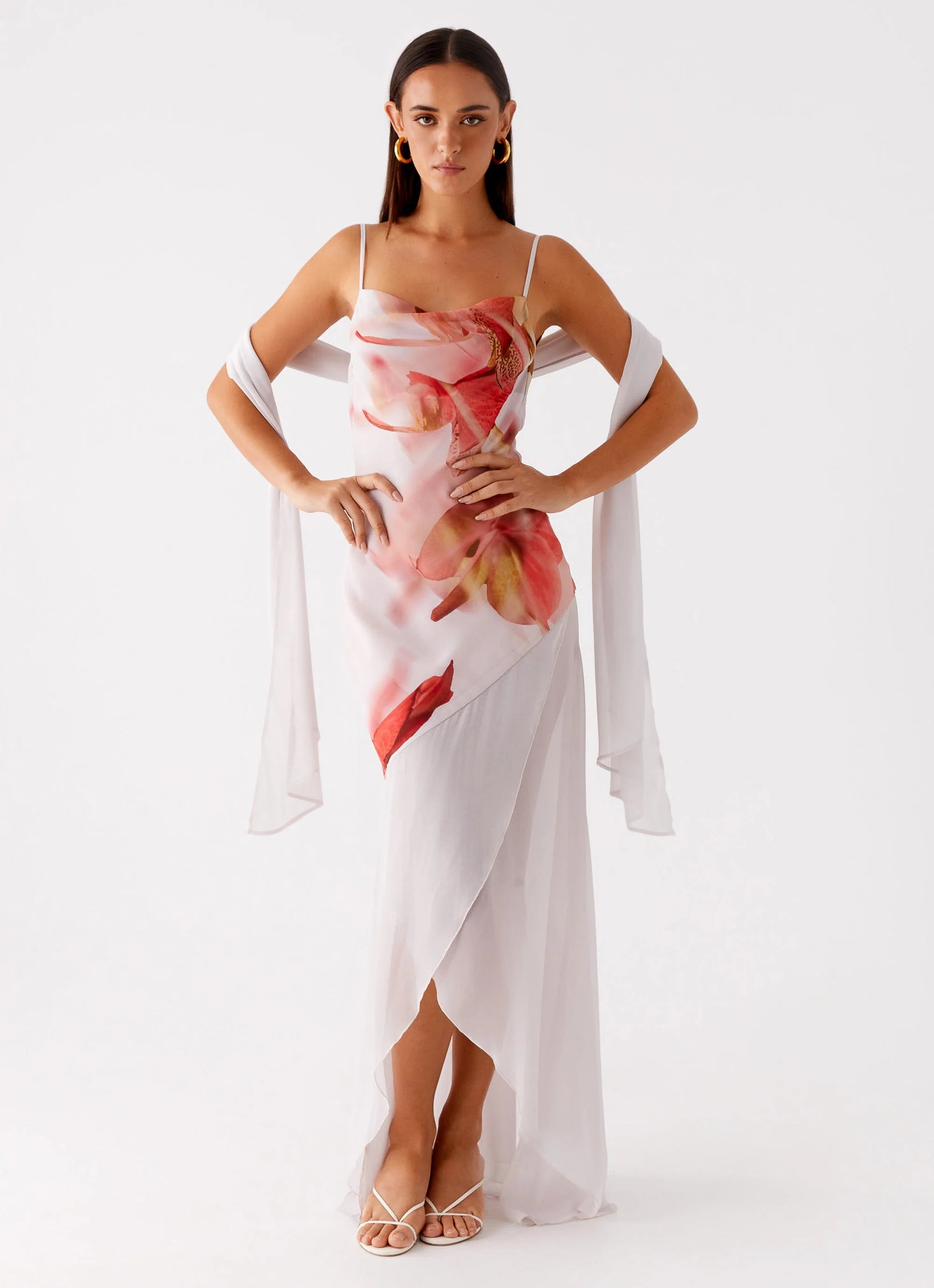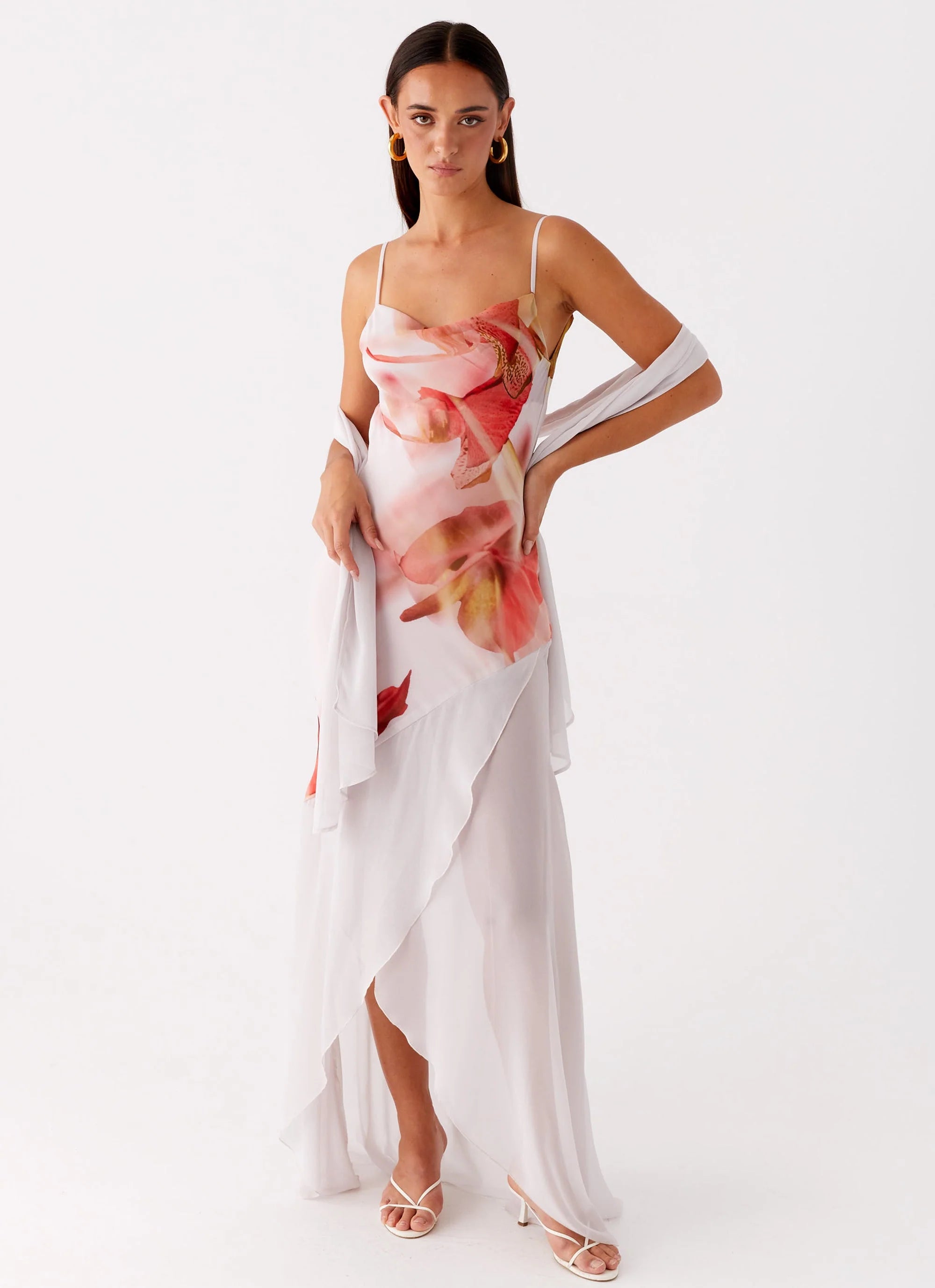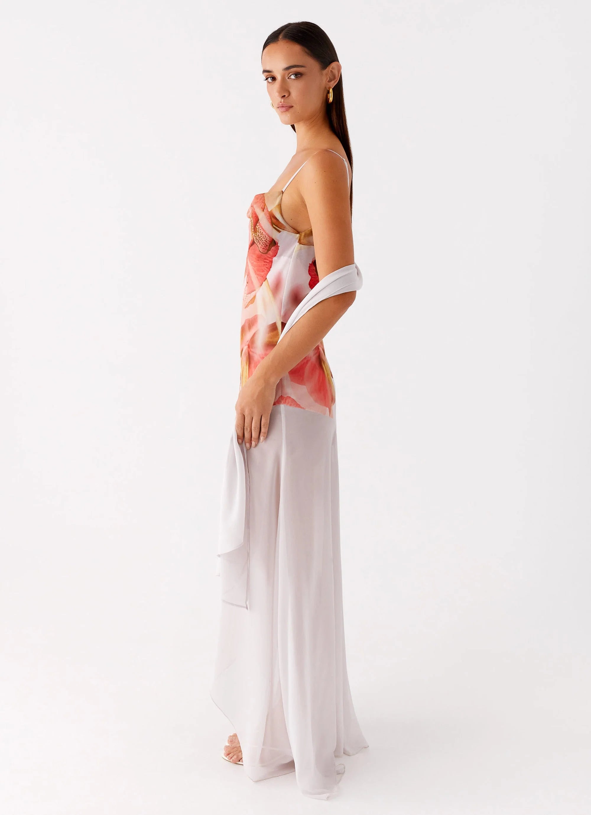 The Loire Maxi Dress in peach boasts a flattering cowl neckline and a bias cut that drapes beautifully. Featuring an asymmetrical hem and back neckline, adjustable shoulder straps, and an exclusive print that may vary, it’s a timeless piece that’s perfect for any occasion.