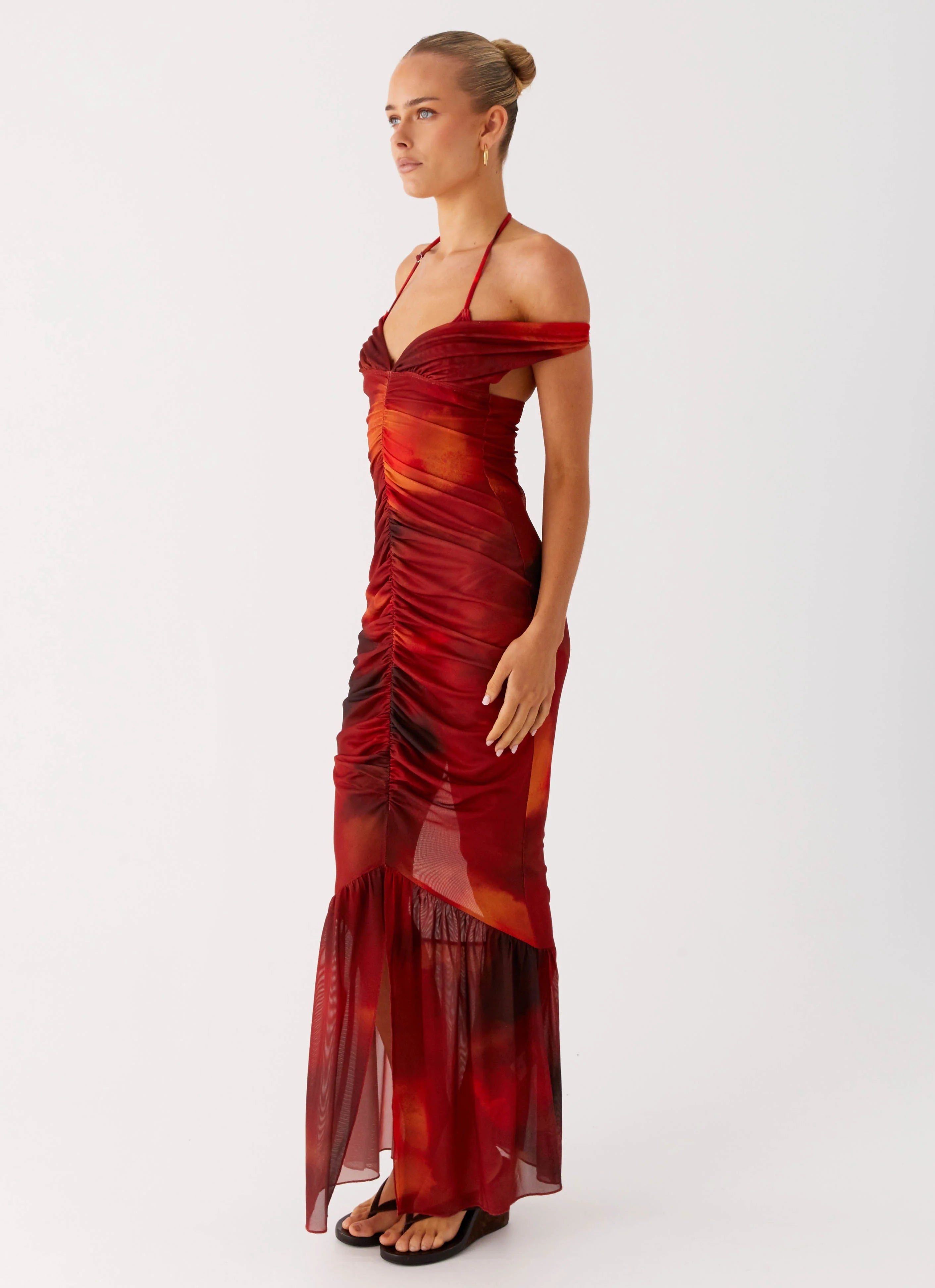 The Love Me Not Maxi Dress is made for romantic nights and golden hour moments. Designed in our exclusive Scarlet Blur print, it features an off-shoulder neckline, ruched centre front, and an open back with elasticated strap. Crafted from stretch jersey and fully lined for a smooth fit.