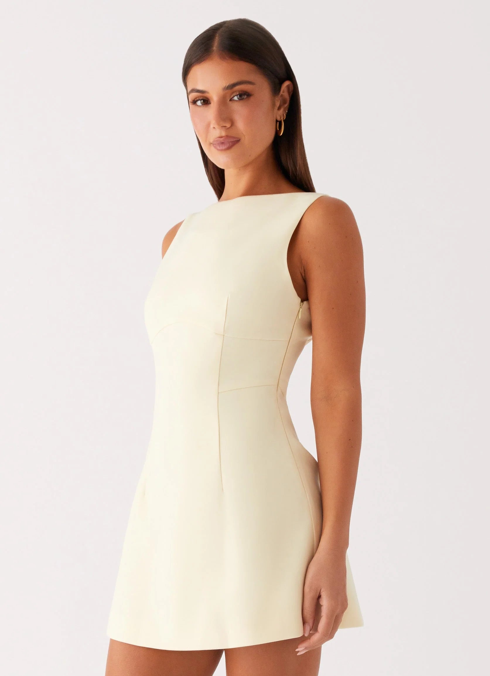 The Lulita Mini Dress in Buttercream Yellow features a chic boat neckline and a fitted silhouette. With princess seams for a flattering shape, a deep V back, and full lining, this mini-length dress combines elegance and comfort effortlessly.