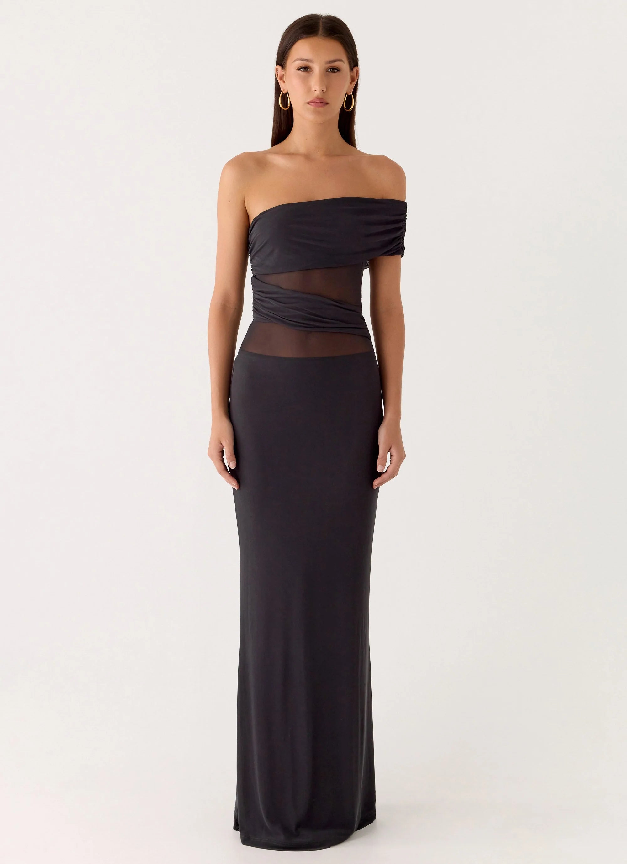 The Lumi Maxi Dress is a bold statement with its off-shoulder neckline and shoulder and side ruching details. Silicone taping ensures a secure fit, while the flowing maxi length creates an effortlessly elegant look perfect for any evening affair.