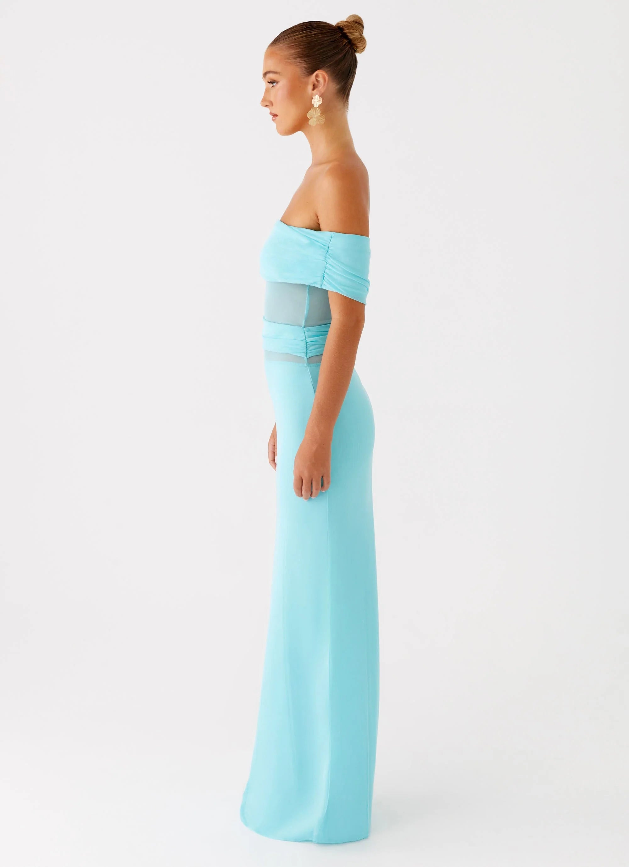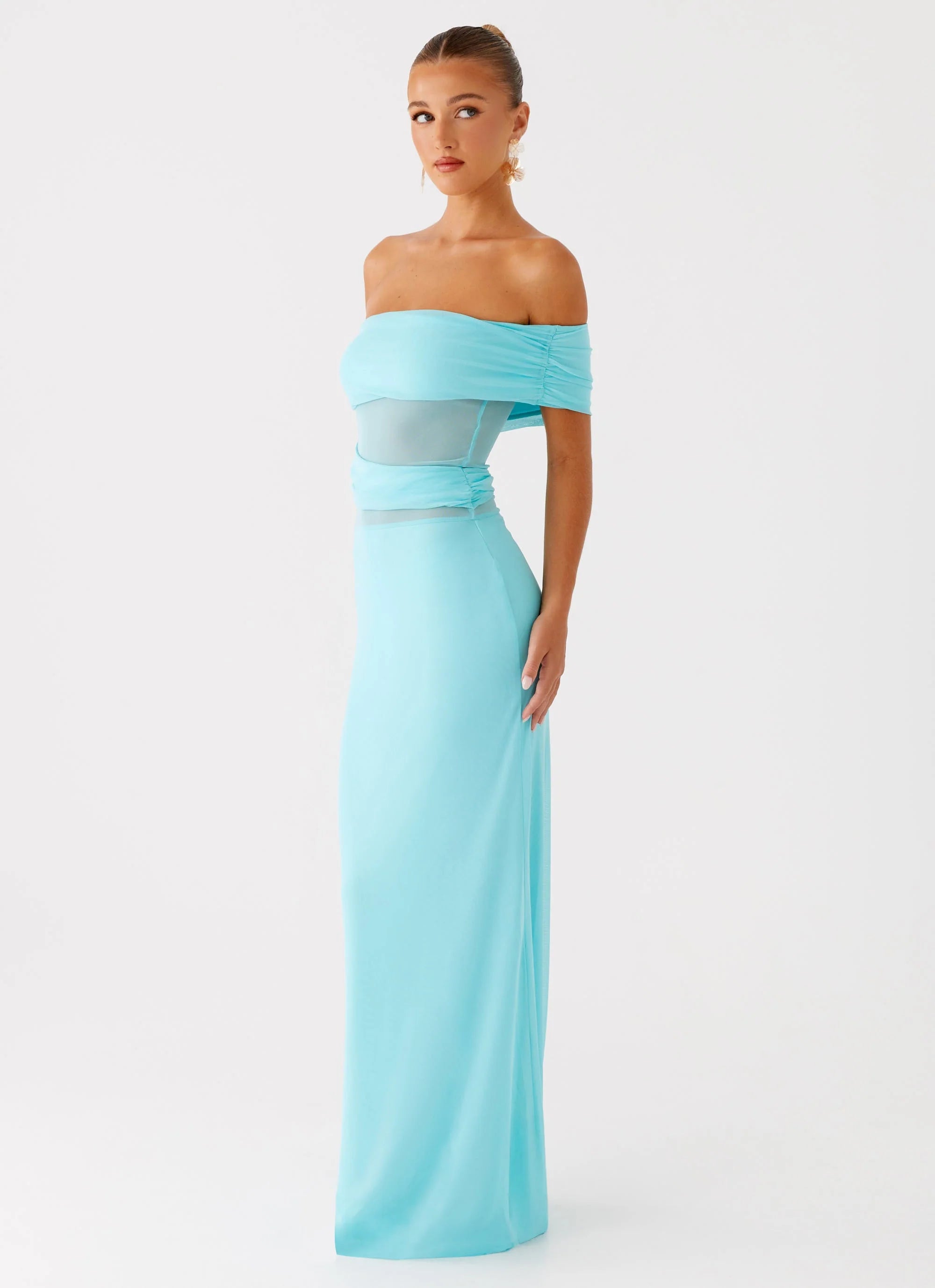 The Lumi Maxi Dress in turquoise is a bold statement with its off-shoulder neckline and shoulder and side ruching details. Silicone taping ensures a secure fit, while the flowing maxi length creates an effortlessly elegant look perfect for any evening affair.