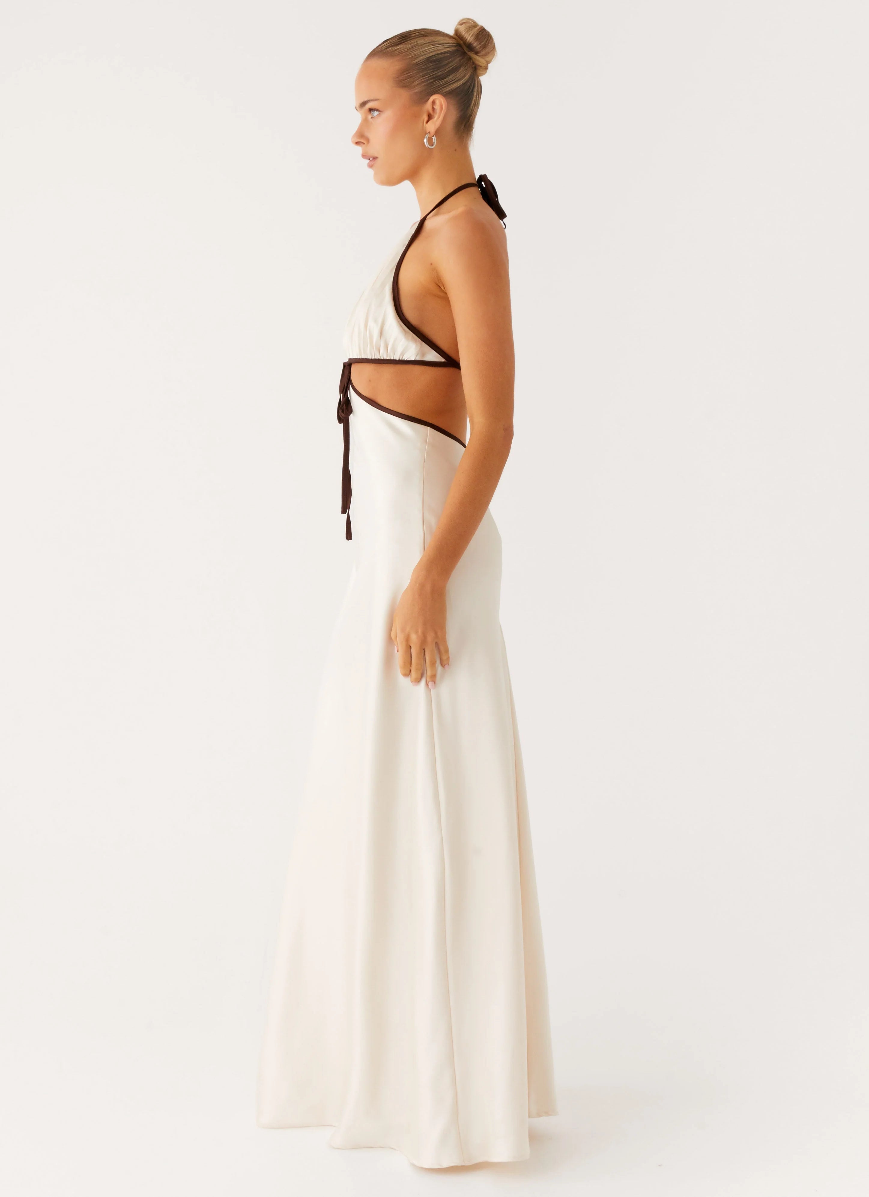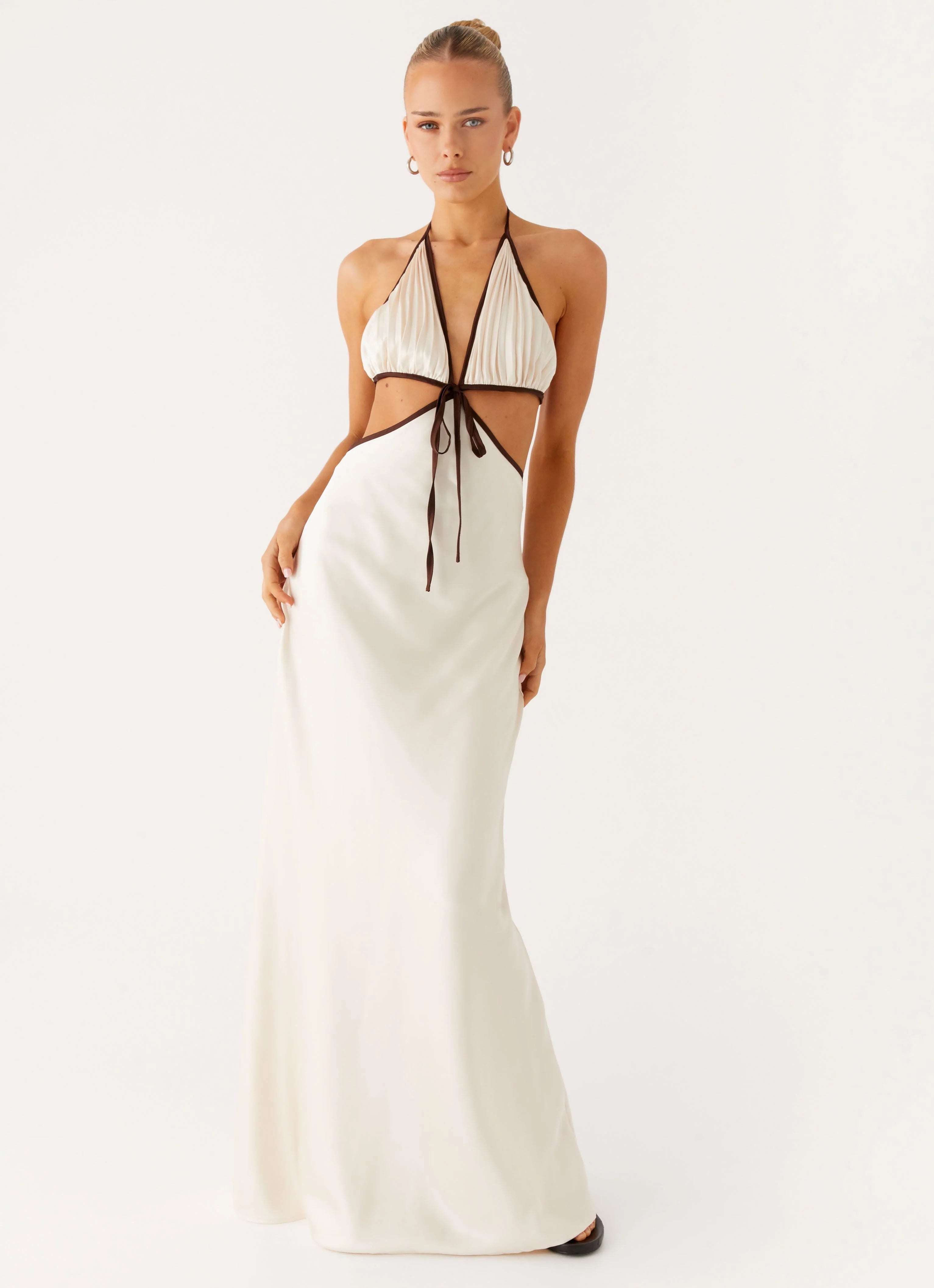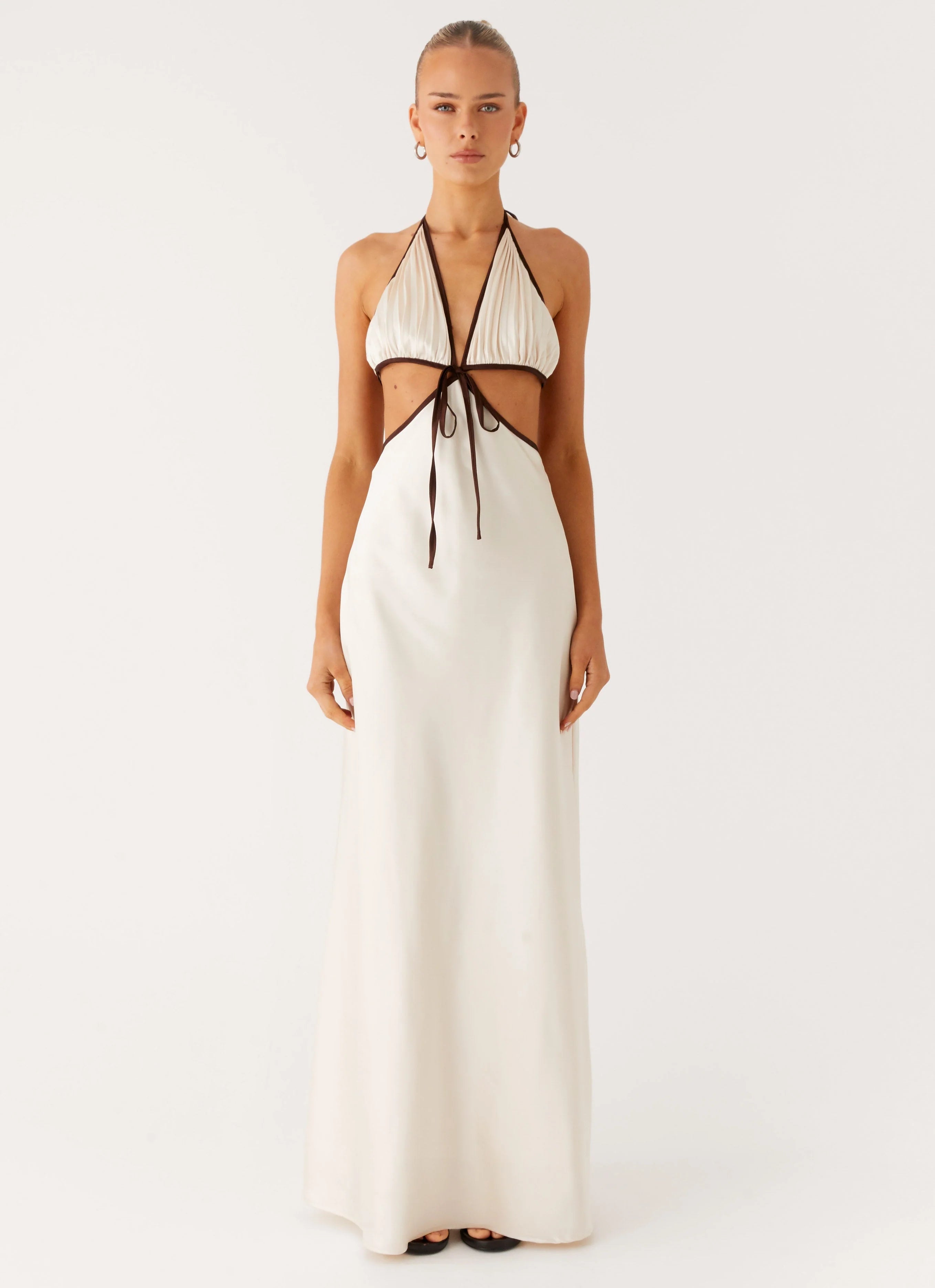 The Mabel Maxi Dress is designed with a flattering V neckline and ruched underbust detail. Featuring thin neck tie straps, front ties, and subtle front cut outs, this maxi-length dress flows beautifully with a low back for an effortlessly elegant look.