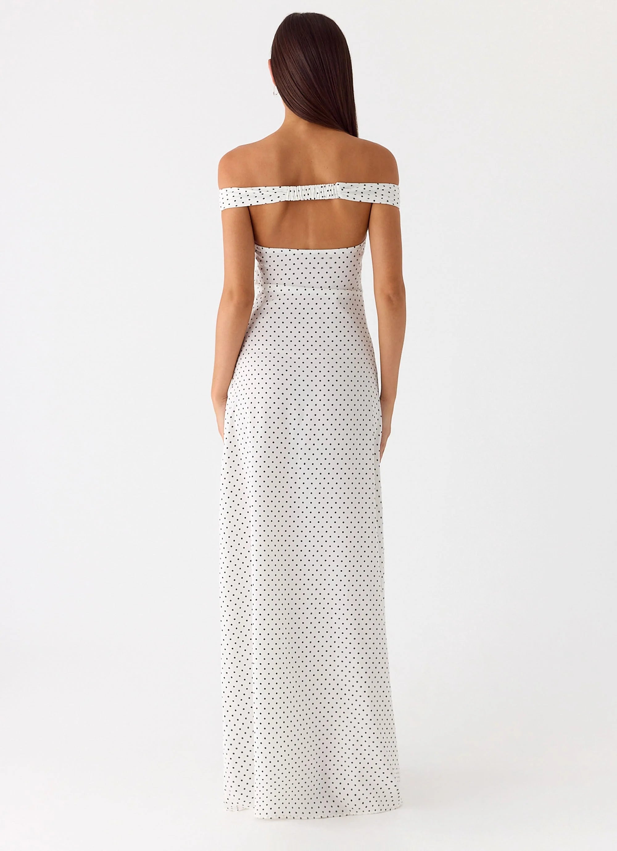 Effortlessly chic and made to move, the Melany Maxi Dress in Black Polka Dot is your perfect after-dark companion. With an off-the-shoulder neckline, open back, and a semi-fitted silhouette, it’s all about the drama in the details.