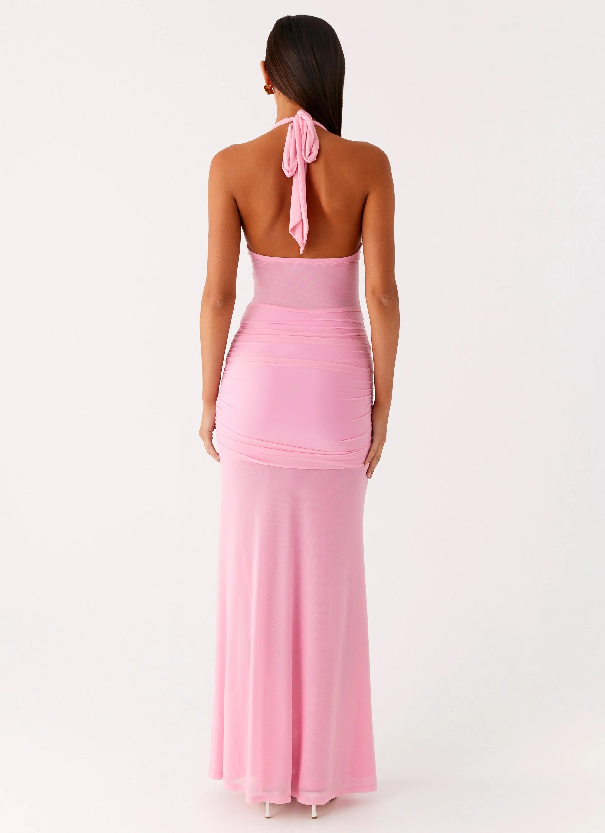The Miyah Halter Hardware Maxi Dress is a show-stopping bodycon style made for golden hour moments. Crafted in stretch mesh, it features a halter V-neckline, fully lined bustier and skirt, and side ruching for a flattering silhouette. Finished with thick long straps, gold hardware, and a low back for effortless evening glamour.