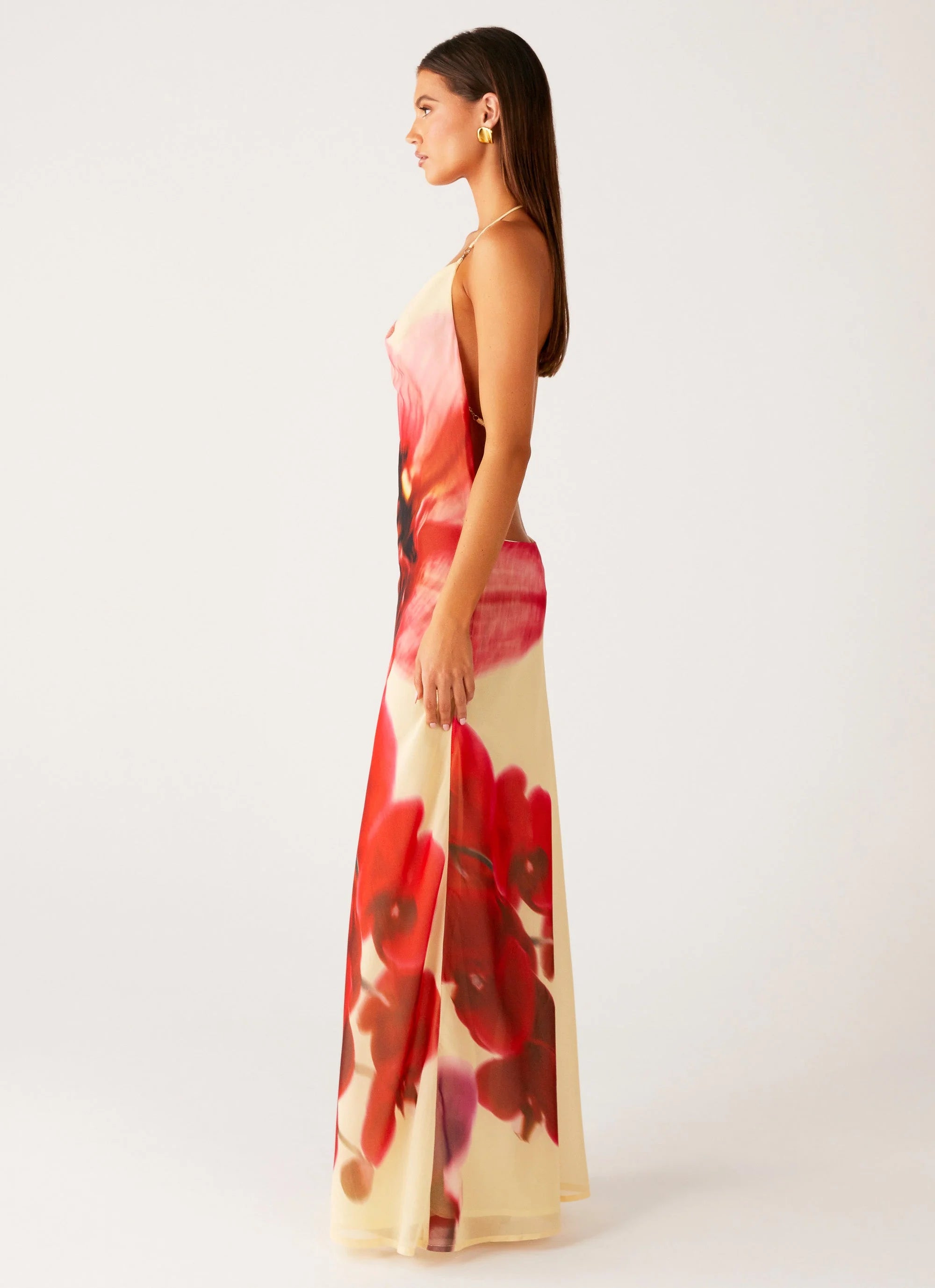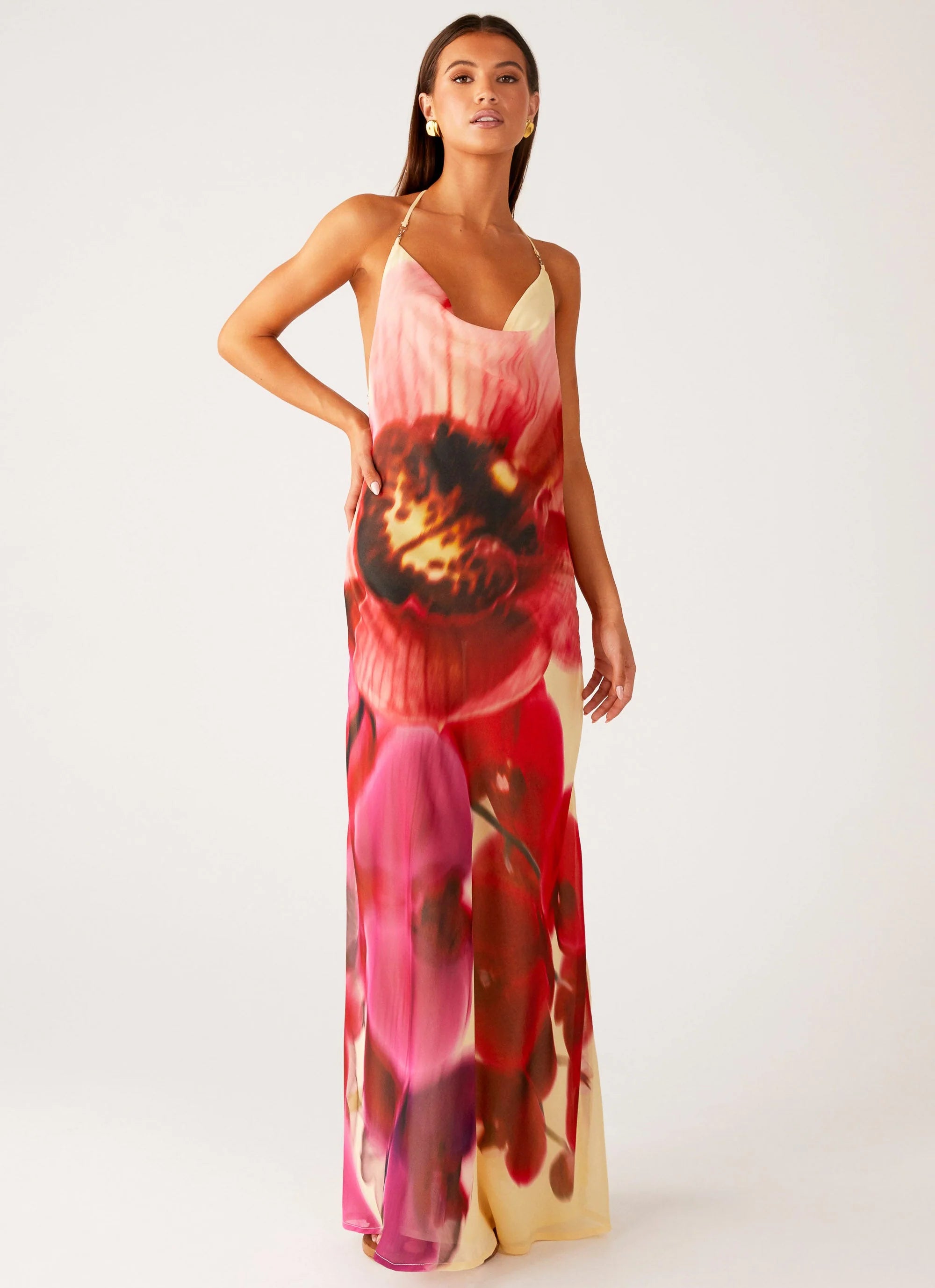 The Morning Crush Cowl Maxi Dress is made for glowing nights. Featuring a front cowl neckline with beaded straps and a low back, this fully lined maxi dress showcases an exclusive print side hook and eye with invisible zipper complete the silhouette.