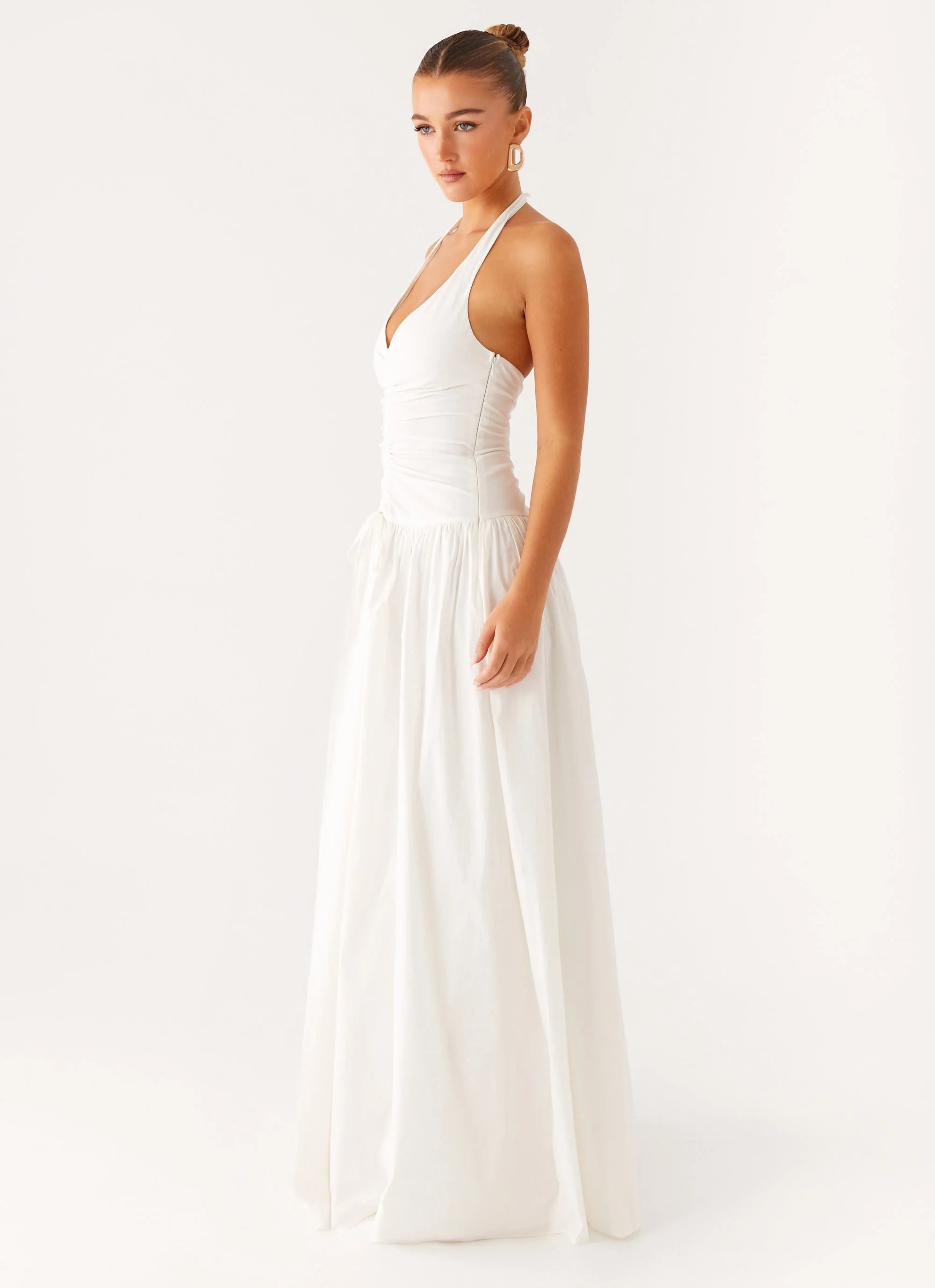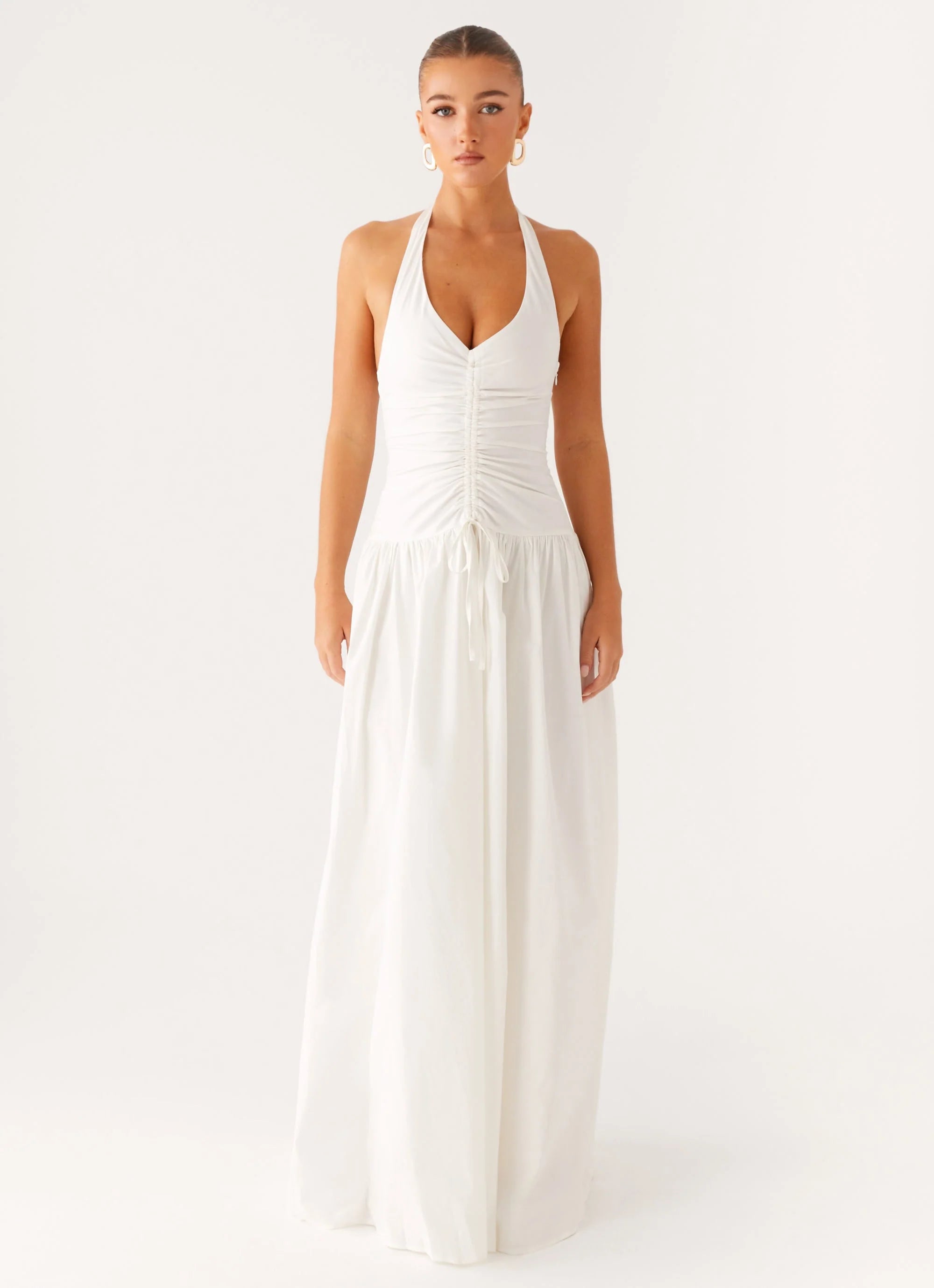 Sleek, sultry, and made for moonlit nights, the Narnie Maxi Dress in Ivory brings effortless allure. With a plunging V neckline and centre ruching at the front and back, this maxi hugs and highlights in all the right places — your after-dark essential.
